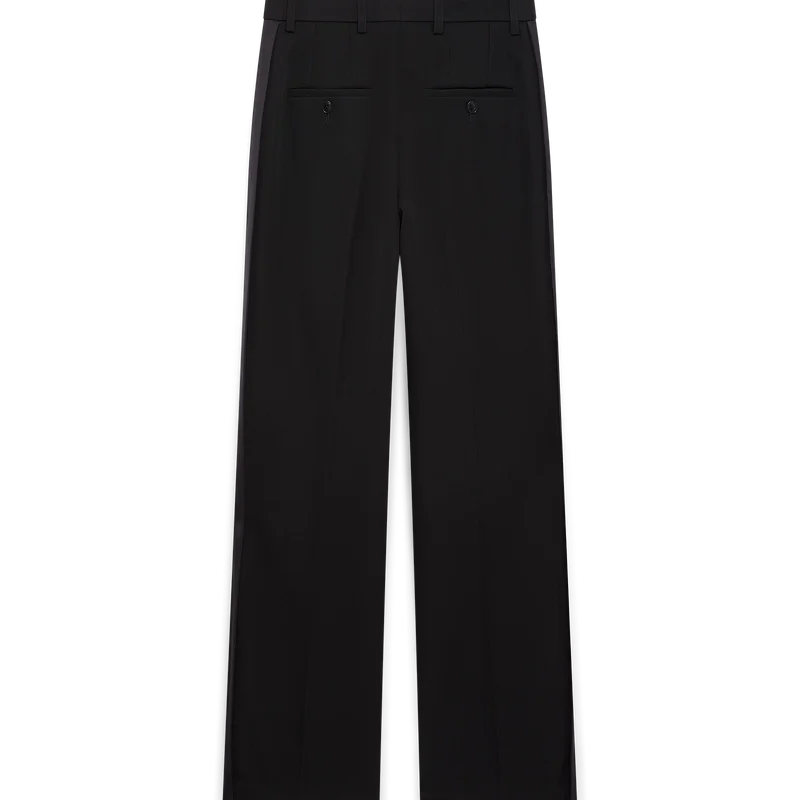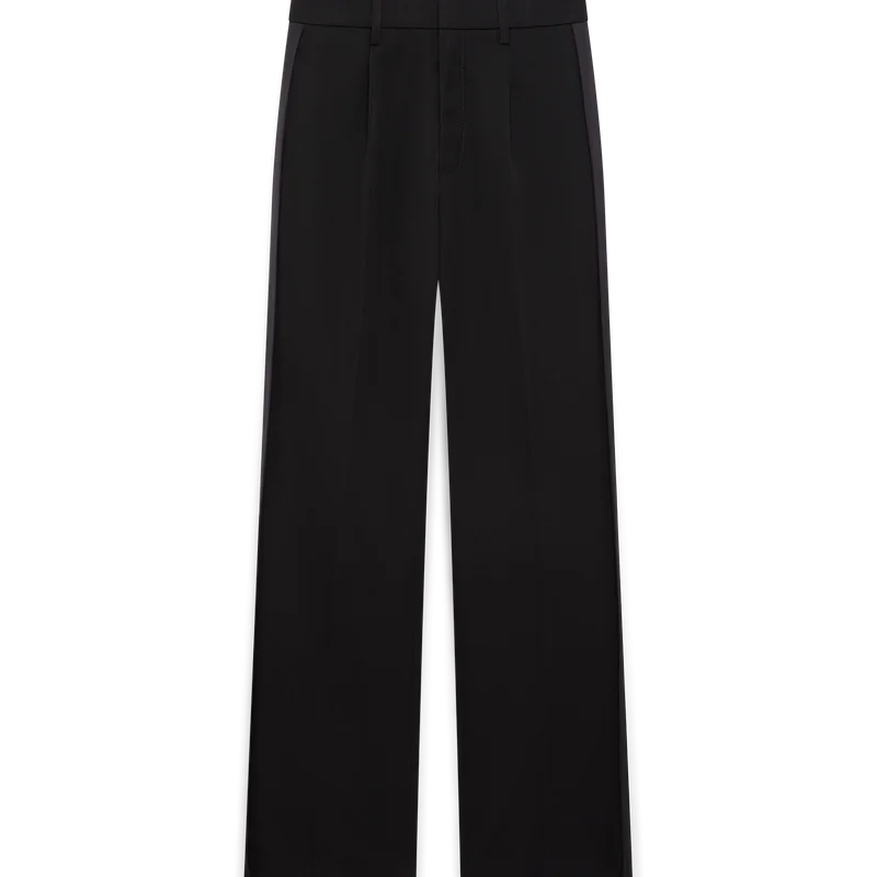 De plisserade byxorna i ull är raka i benet och tillverkade av skräddarsytt tyg. De har plisseringar fram, dragkedja, snedställda framfickor, foder, bälteshällor, bakfickor med kantband och viskospaneler längs sidorna.