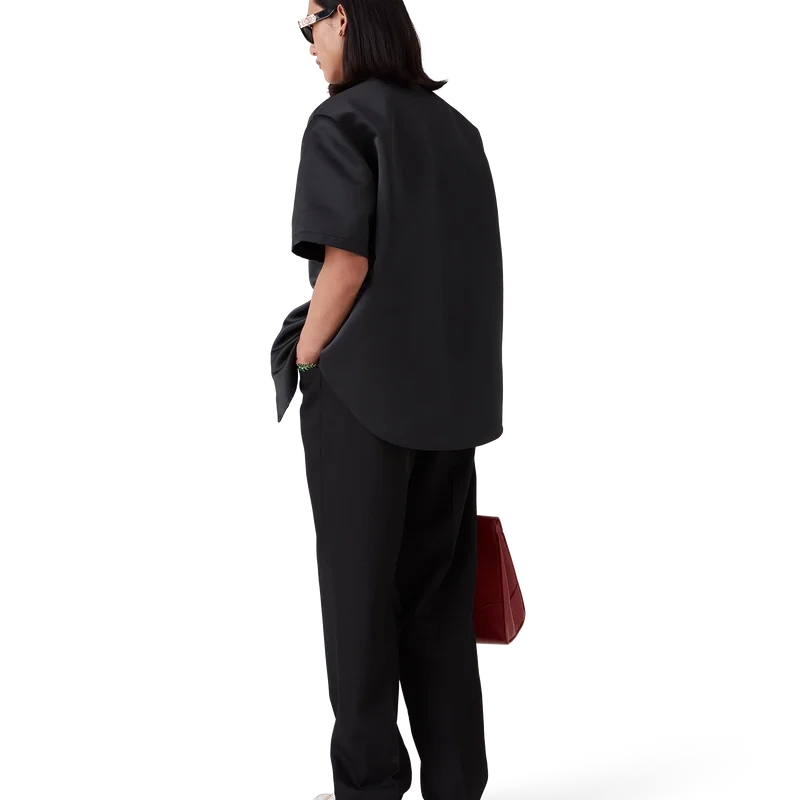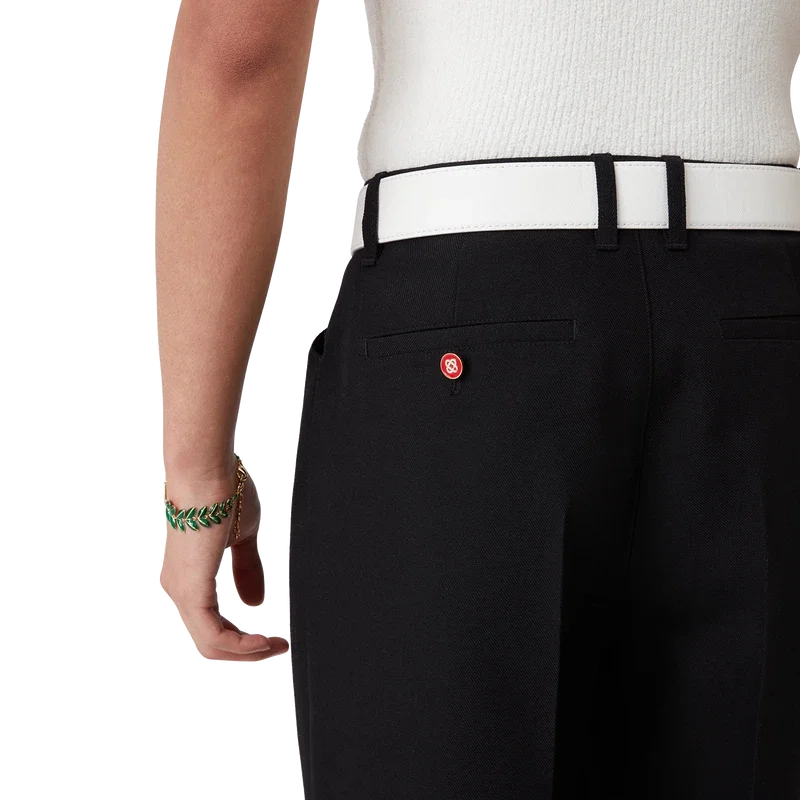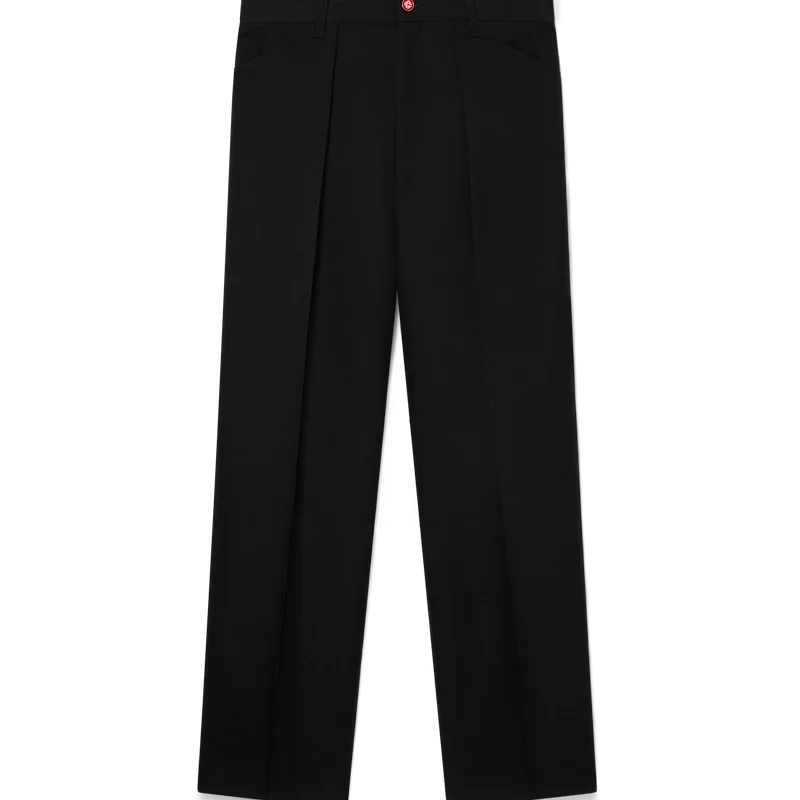 De veckade chinabyxorna har raka ben, är tillverkade i ulltyg och har ett foder i bomullsblandning. De har snedställda framfickor, bälteshällor, dragkedja och bakfickor med kantband.