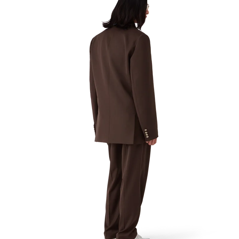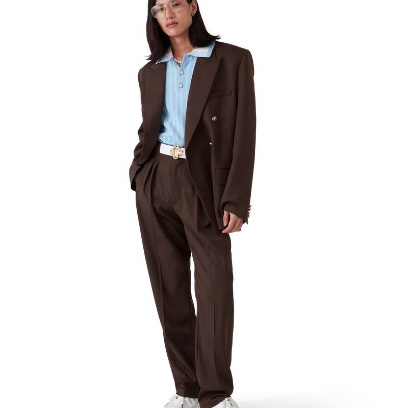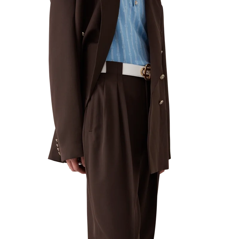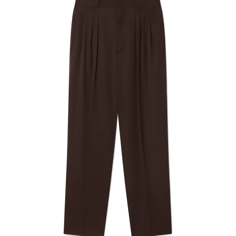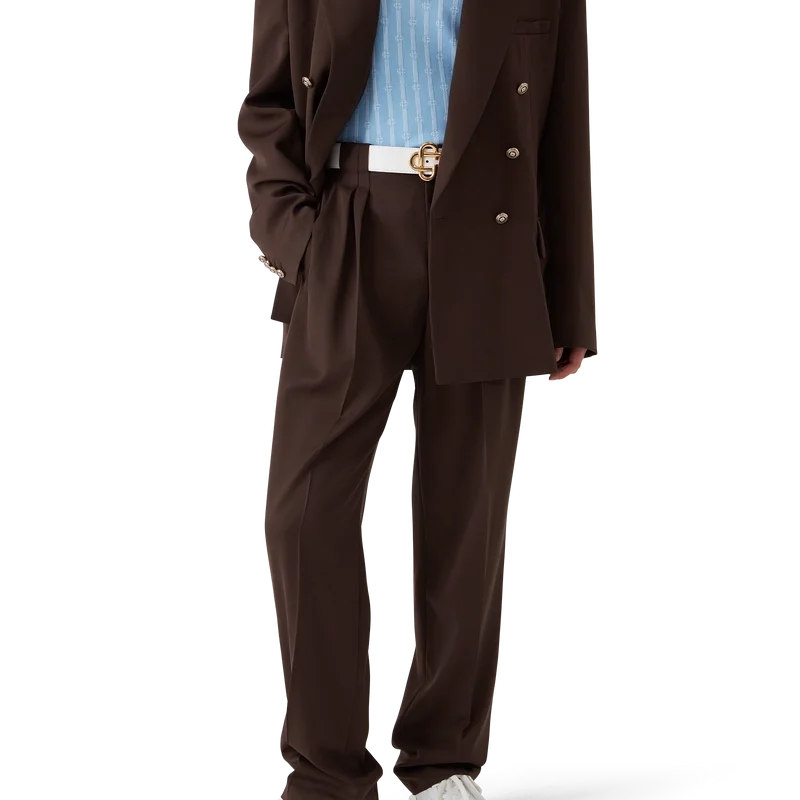 De skräddarsydda byxorna i ull med veck har en avsmalnande passform, är tillverkade av nyull och har ett foder i bomullsblandning. De har dragkedja, fem veck framtill, snedställda framfickor, bakfickor med kantband och en liten boxveck samt breda bälteshällor.<!–