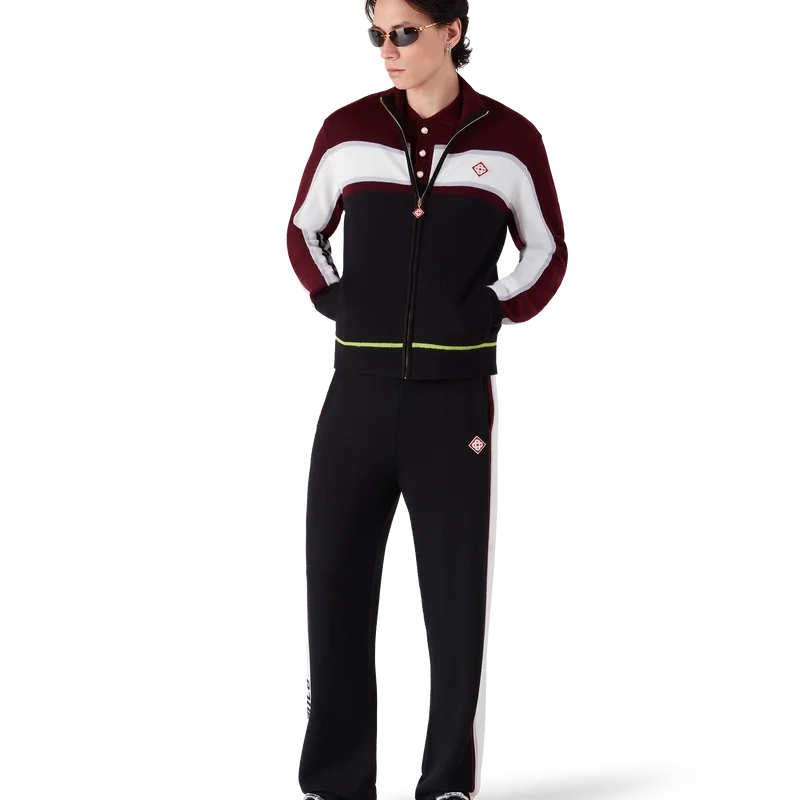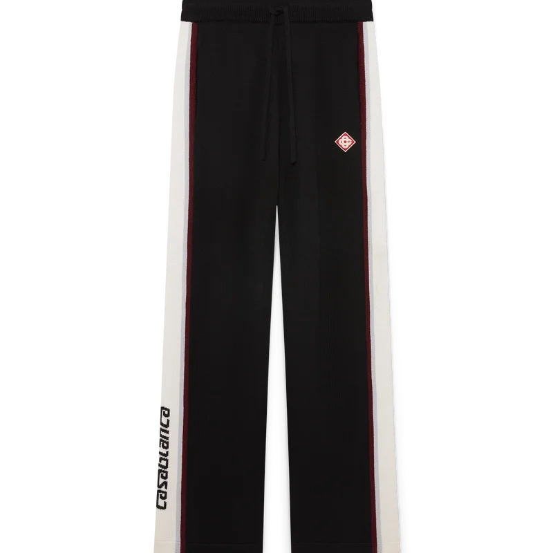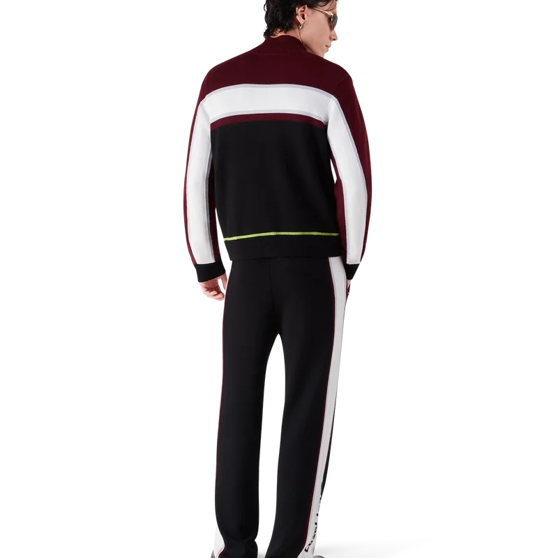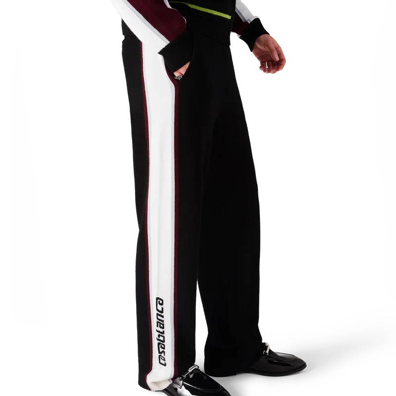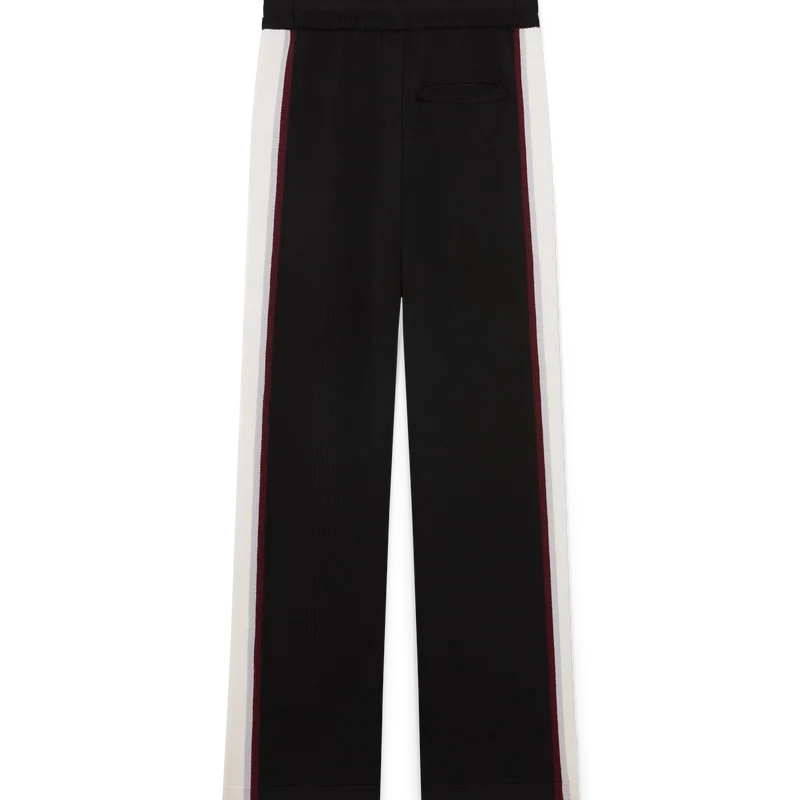 De randiga merinobyxorna har en sofistikerad design och är tillverkade av merinoull med en strukturerad stickning. De har en elastisk midja och en avslappnad silhuett som balanserar sportig bekvämlighet med raffinerad skräddarsydd passform.