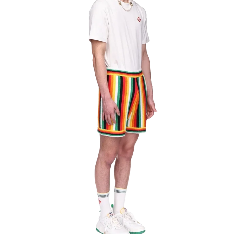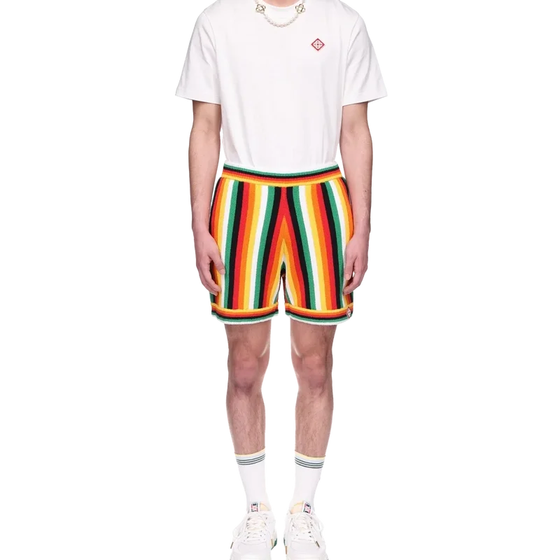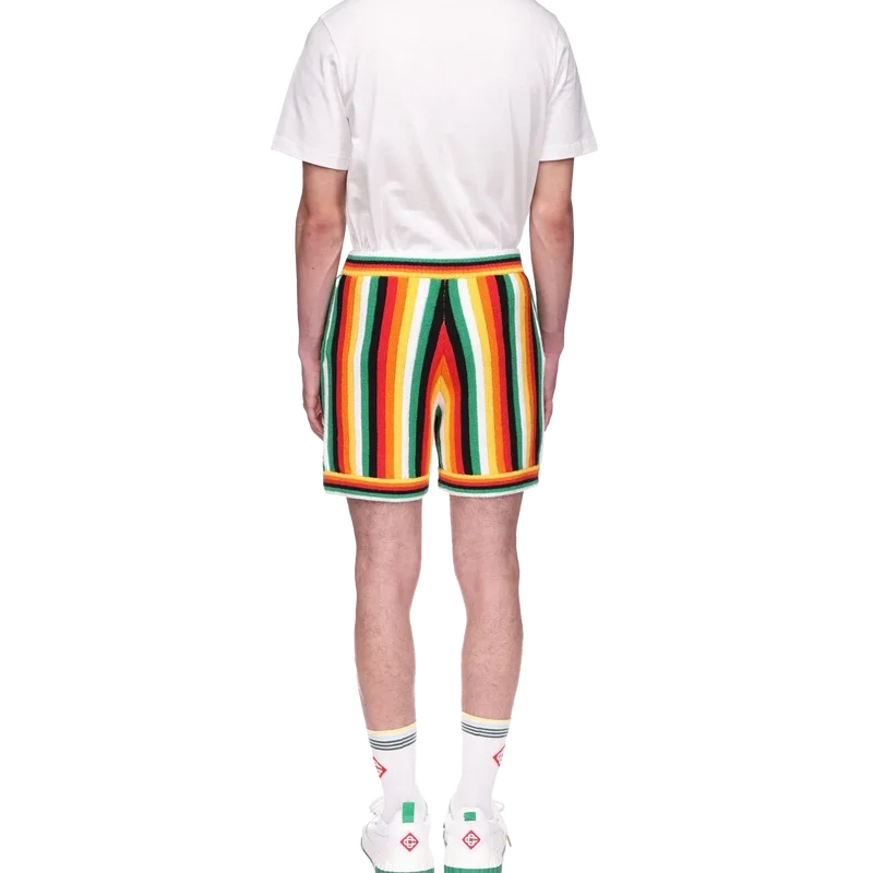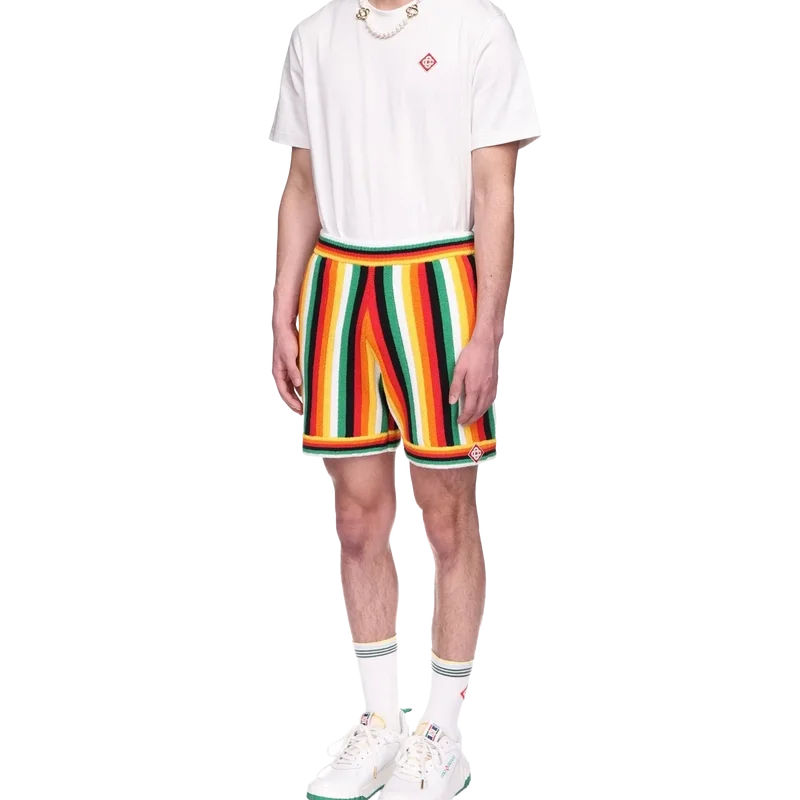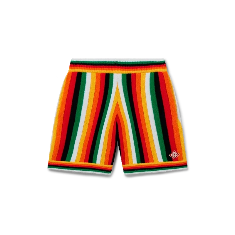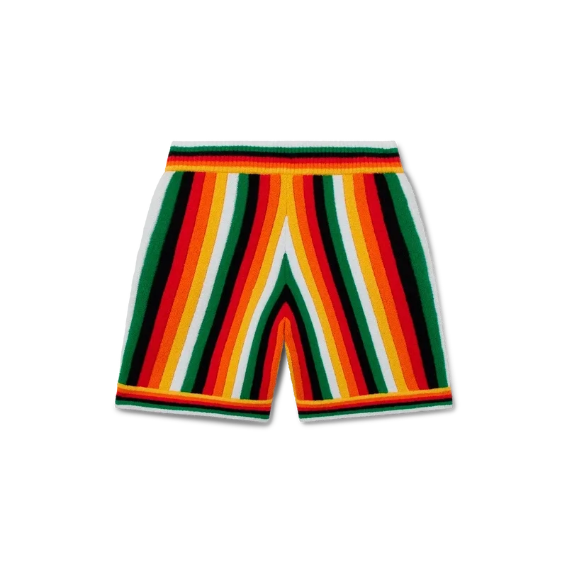 De randiga frottéshortsen har en stickad design tillverkad av ett frottétyg i bomullsblandning och präglas av säsongens färger, som representerar det rika utbytet mellan olika kulturella discipliner inom afrikansk konst, musik och film. De kompletteras med en elastisk midjeresår, sidfickor och husets signaturmärke i form av en diamant.