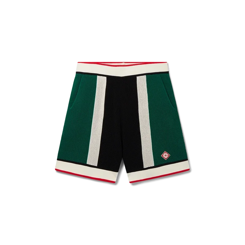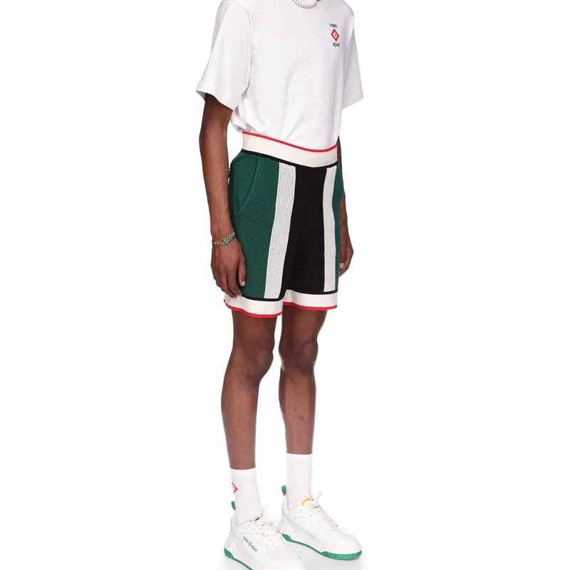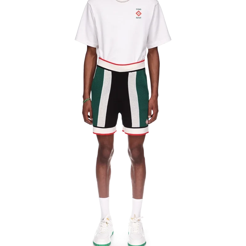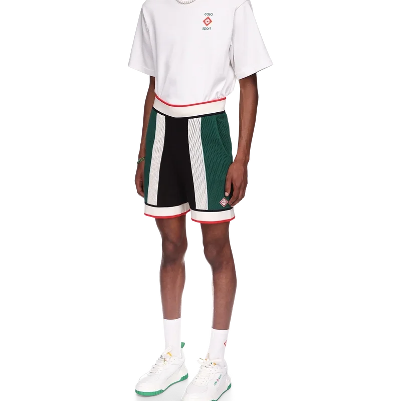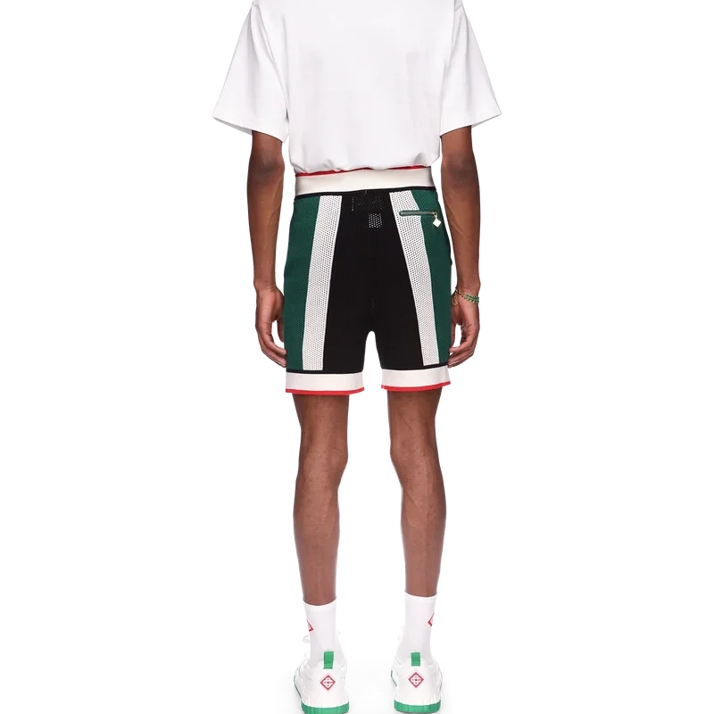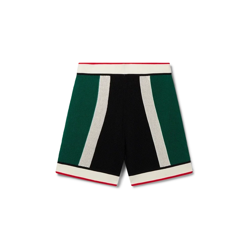 De randiga meshshortsen är tillverkade av ett stickat ekologiskt bomullstyg, inspirerade av färgerna i Nigerias flagga och har märkets diamantlogotyp. De har ribbad midja och fåll, snedställda sidfickor och en bakficka med dragkedja.