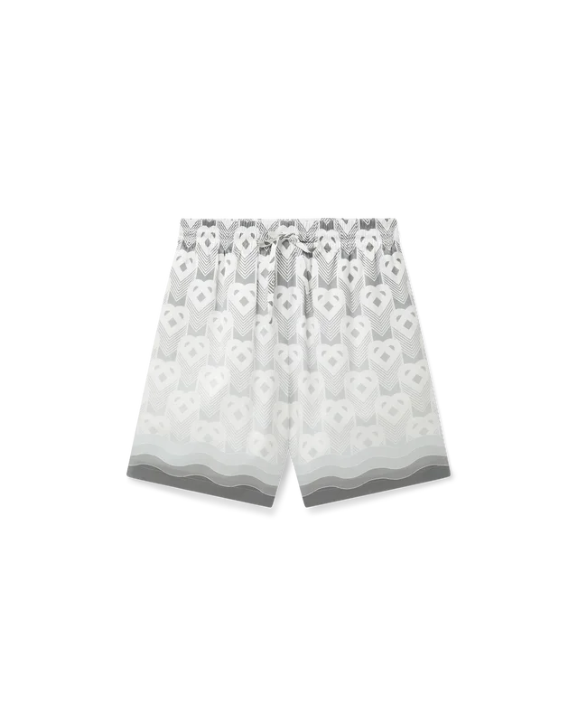 Gradienthjärtmonogram-shorts har ett heltäckande tryck med husets hjärtmonogram på säsongens silverfärgade gradientbakgrund. Tillverkade av ett monogram-silkesatintyg och försedda med elastisk midjeresår, dragsko, sidofickor i sömmarna, en påsydd bakficka och en gradientdetalj i nederkanten inspirerad av Memphis Wave.