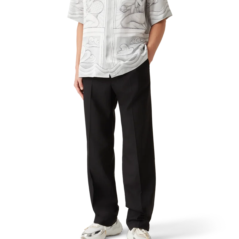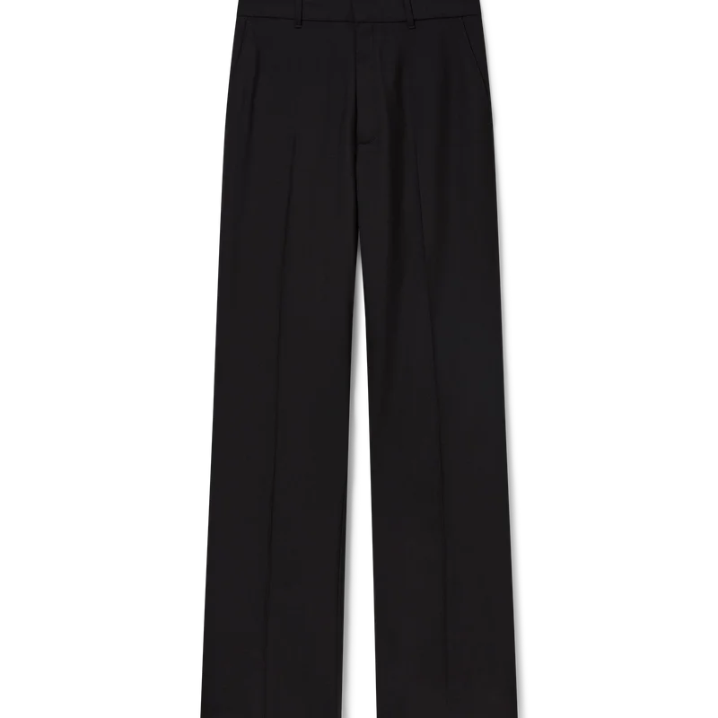 De skräddarsydda byxorna i ull har en smal passform och är tillverkade av nyullstyg med foder i bomullsblandning. De har bälteshällor, dragkedja, snedställda sidfickor och bakfickor med kantband.