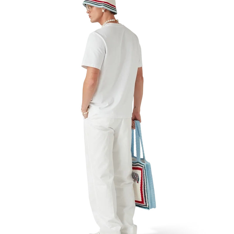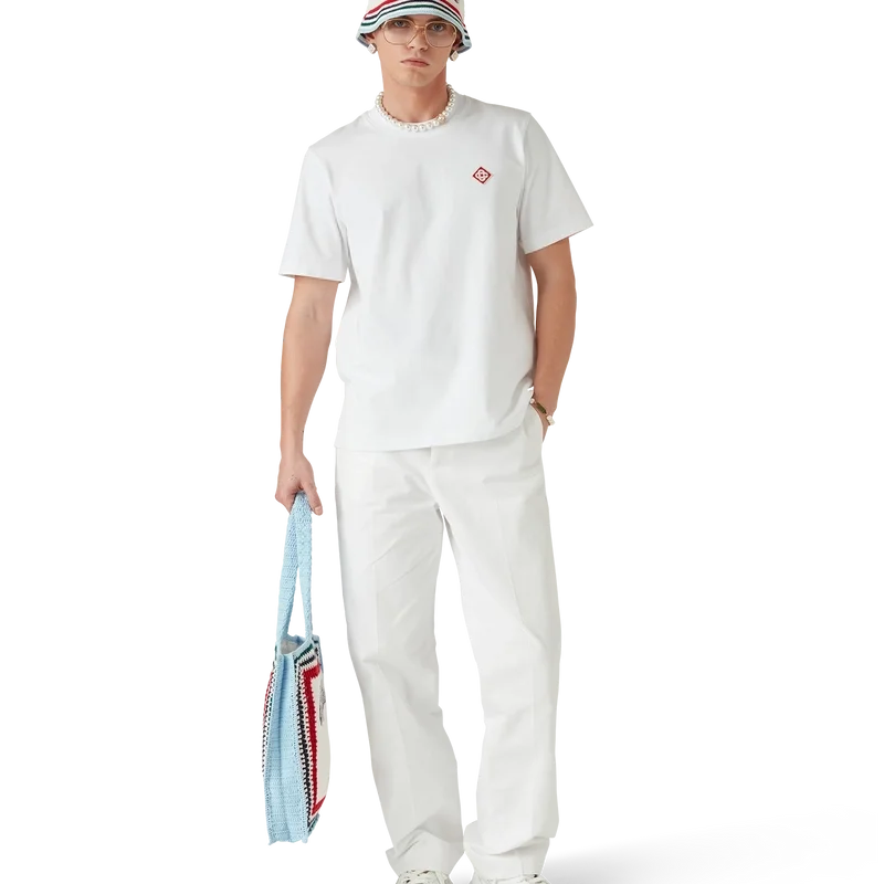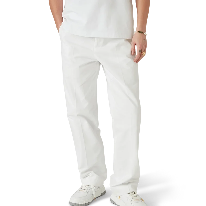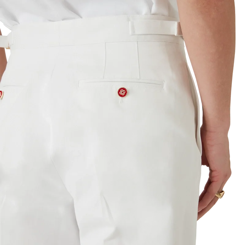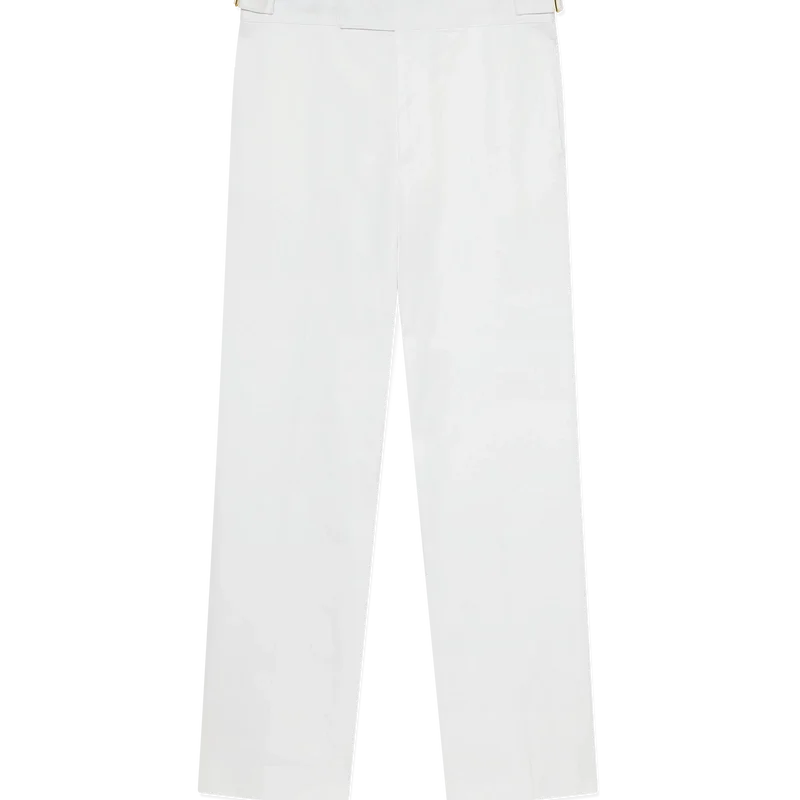 De skräddarsydda chinabyxorna har raka ben, är tillverkade av bomullstyg och har bomullsfoder. De kompletteras med fickor i sömmarna, dragkedja, justerbara sidospännen med guldpläterade spännen och bakfickor med knappstängning.
