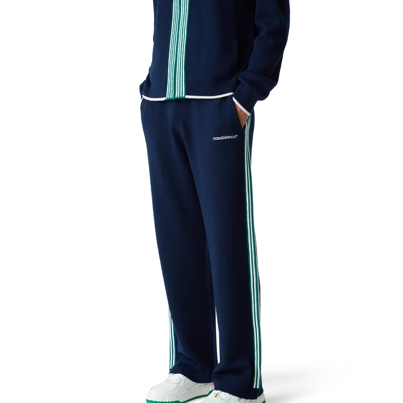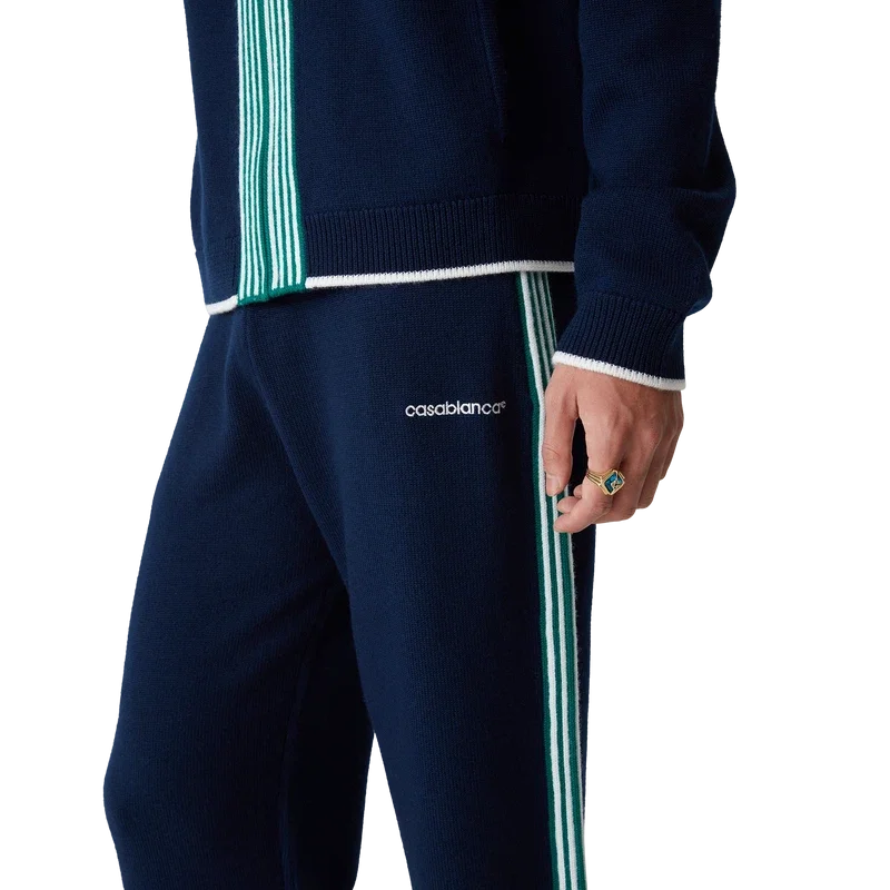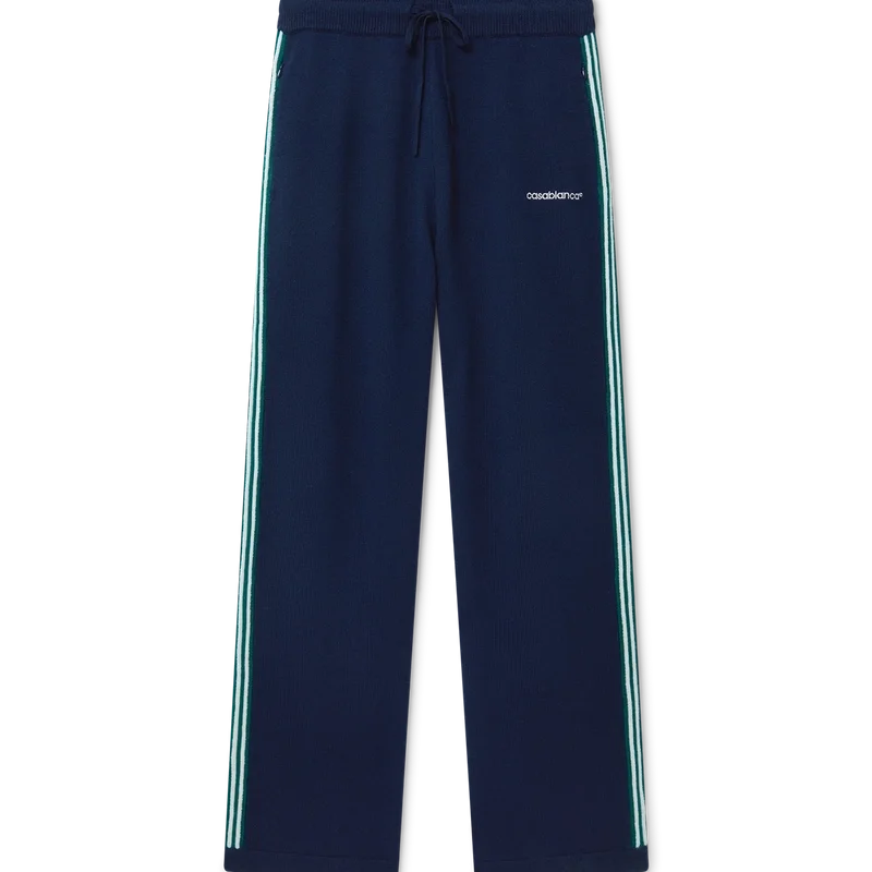 De stickade tennisbyxorna har en sportinspirerad design tillverkad av merinoullstyg. Kompletterade med kontrasterande ribbade kanter på muddar, nederkant, krage och knäppning, dragkedja fram, en trattkrage och Casablanca-logotyp.