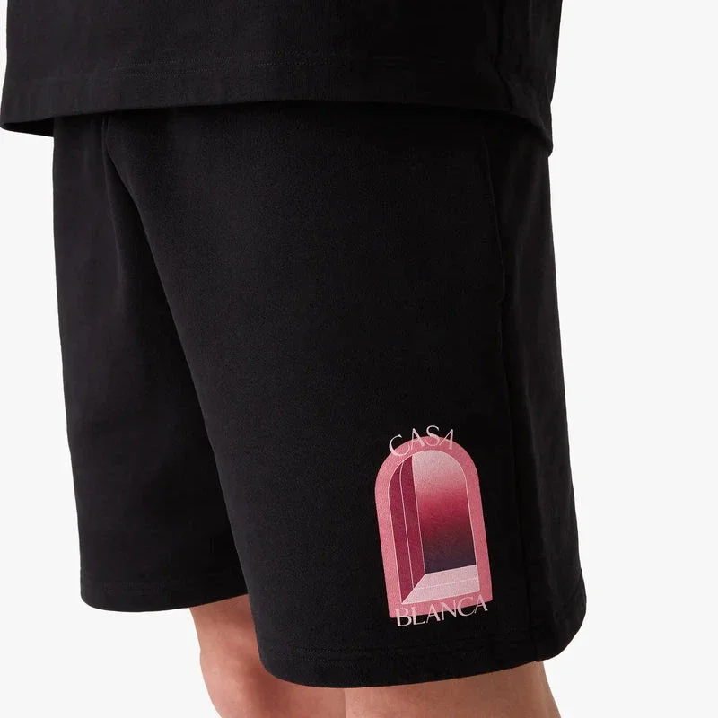 De svarta L’arche-sweatshortsen har en raffinerad design med ett signaturtryck av bågen, en abstrakt symbol för styrka. De kompletteras med en elastisk midjeresår, dragsko med guldspetsar, sidfickor och en påsydd bakficka.