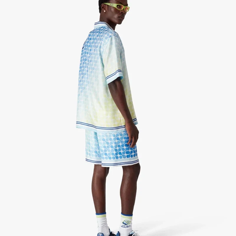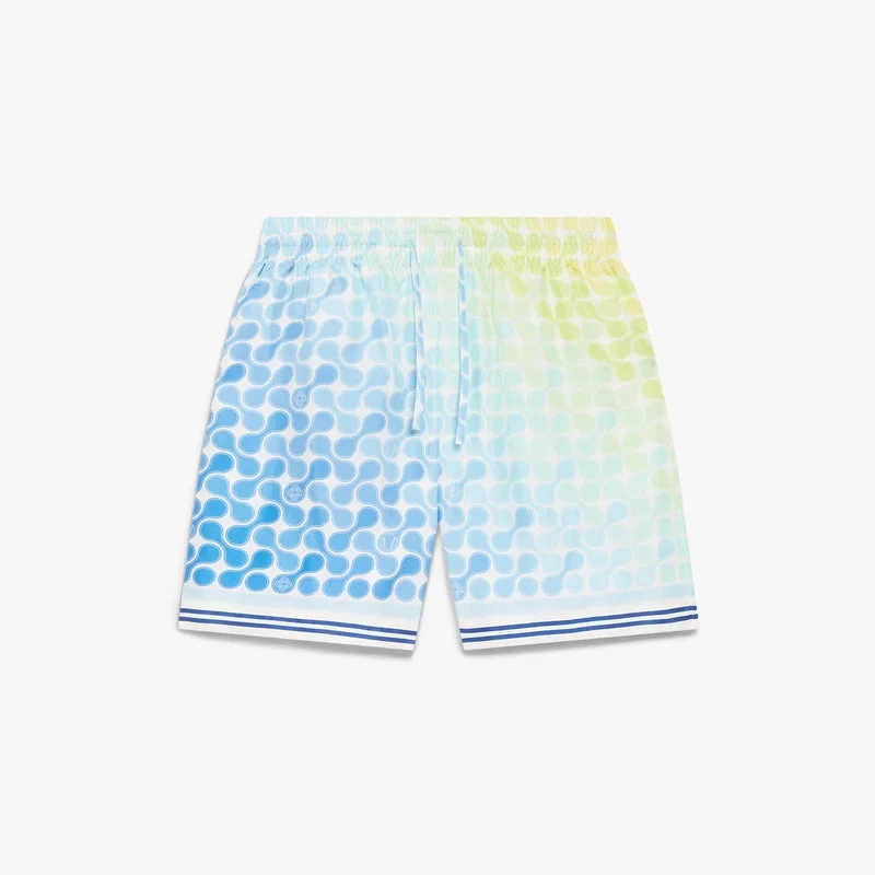 Tennis Tile Silk Shorts har en raffinerad design med säsongens konstverk i form av ett böljande mönster av korsande logotyper och tennisbollar som smälter in i säsongens bakgrund med tonövergångar. Kompletteras med elastisk midja, dragsko, sidofickor i sömmarna, en påsydd bakficka och randig kant.