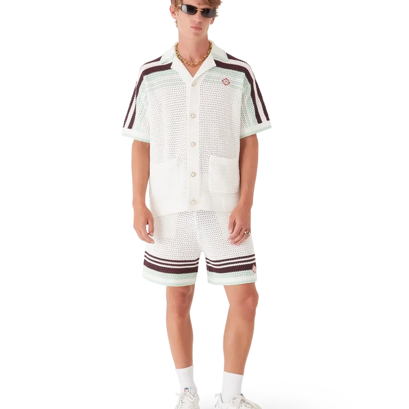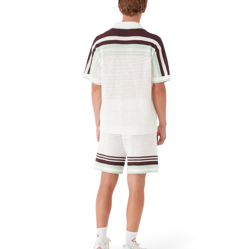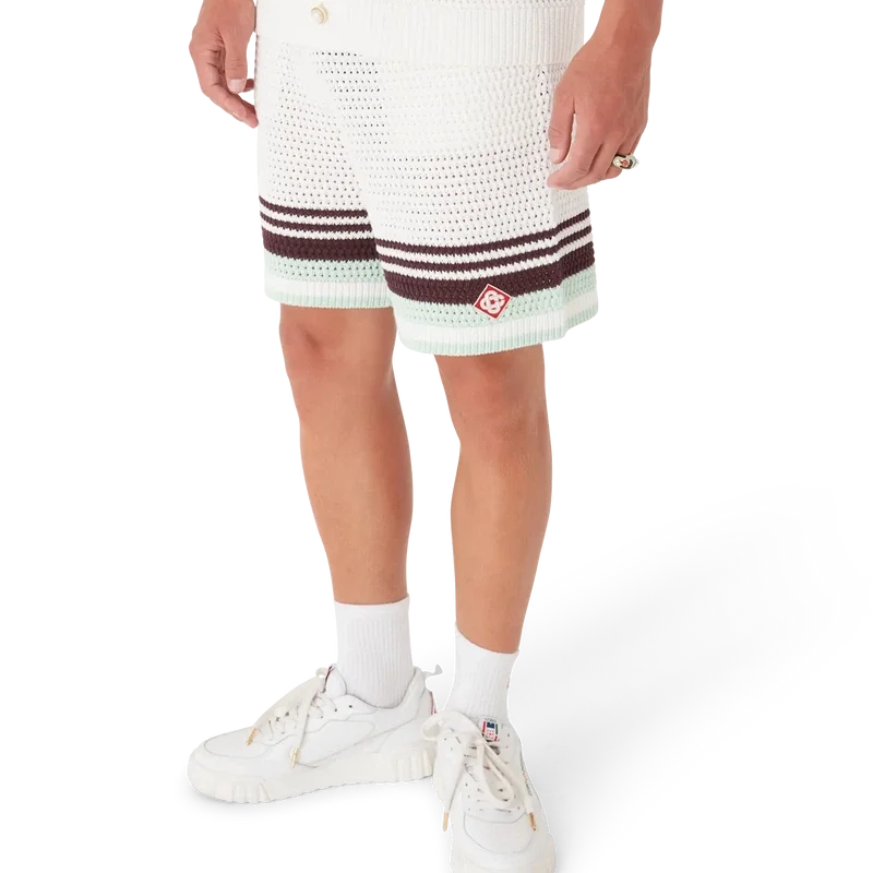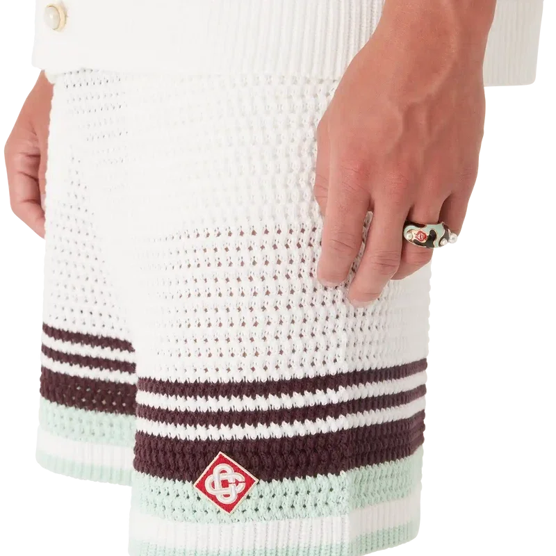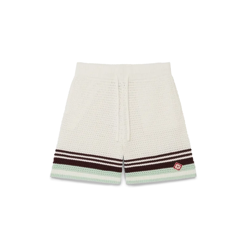 Tennis-shortsen i virkat bomullstyg har en klassisk design i mjuka naturliga färger och pryds av husets signaturdiamantlogo. De har elastisk midja, fickor i sidosömmarna och randiga detaljer i nederkanten.