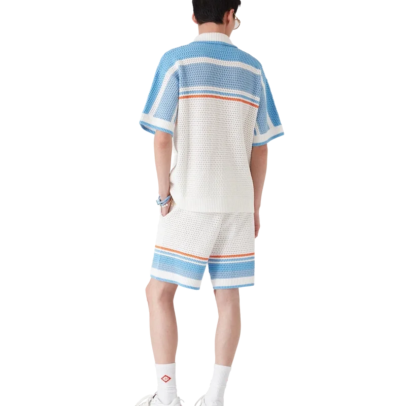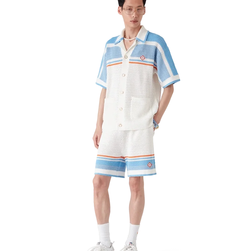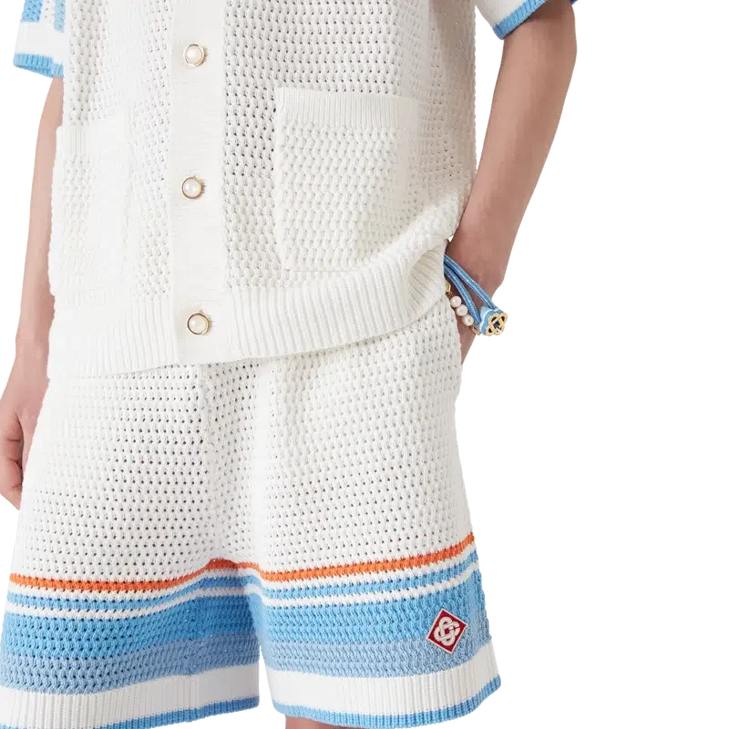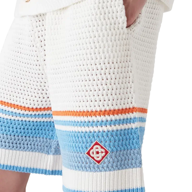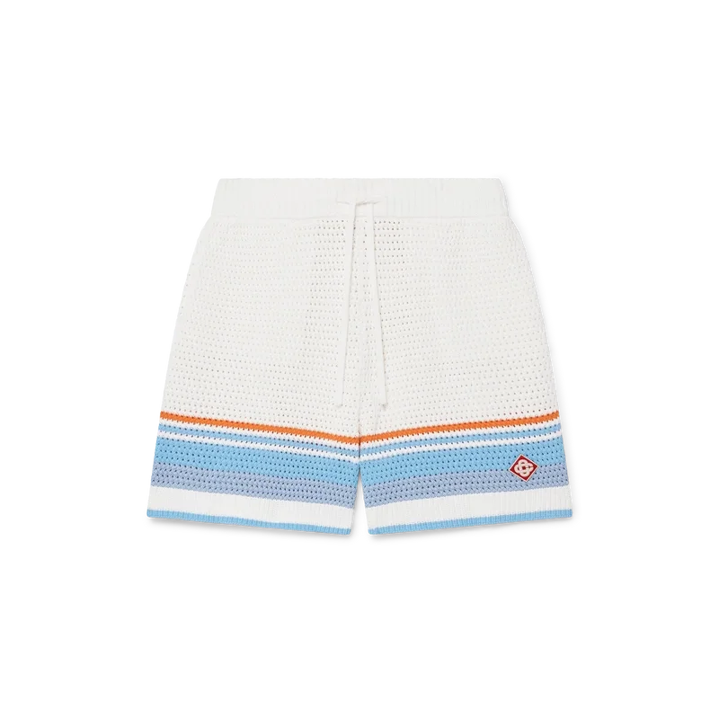 Tennis Crochet Shorts är en klassisk modell tillverkad av virkat bomullstyg i mjuka naturliga färger med husets signaturdiamantlogo. Kompletteras med elastisk midja, fickor i sömmarna och randig fåll.