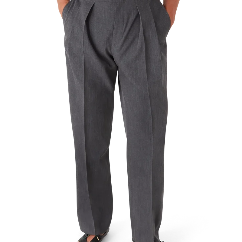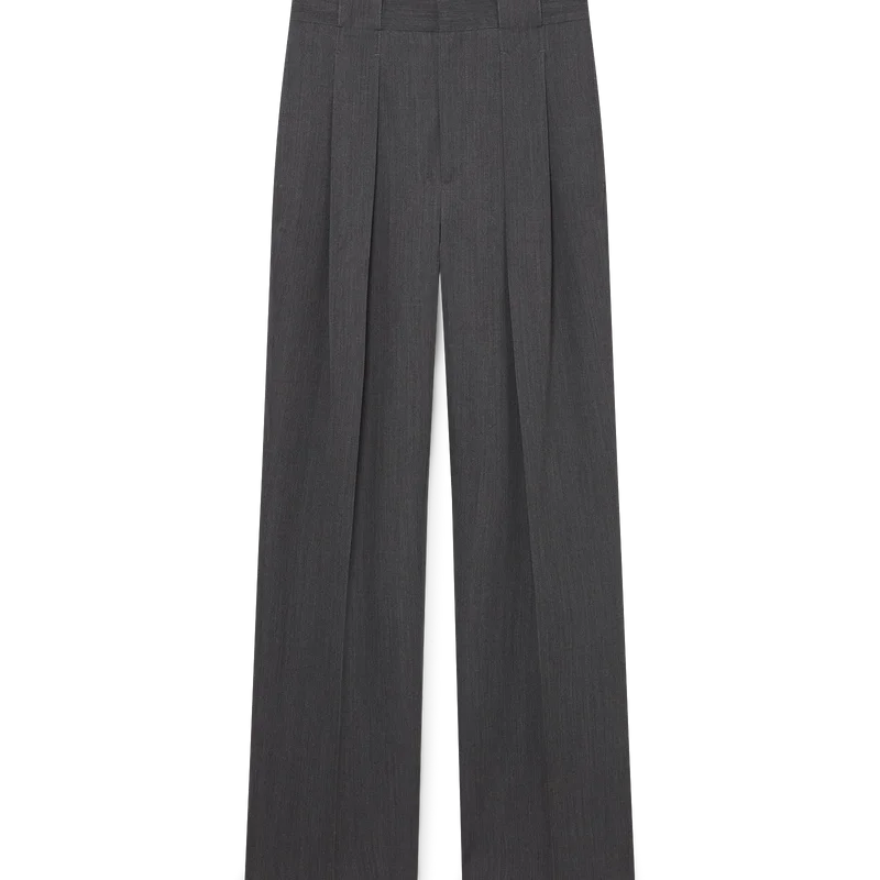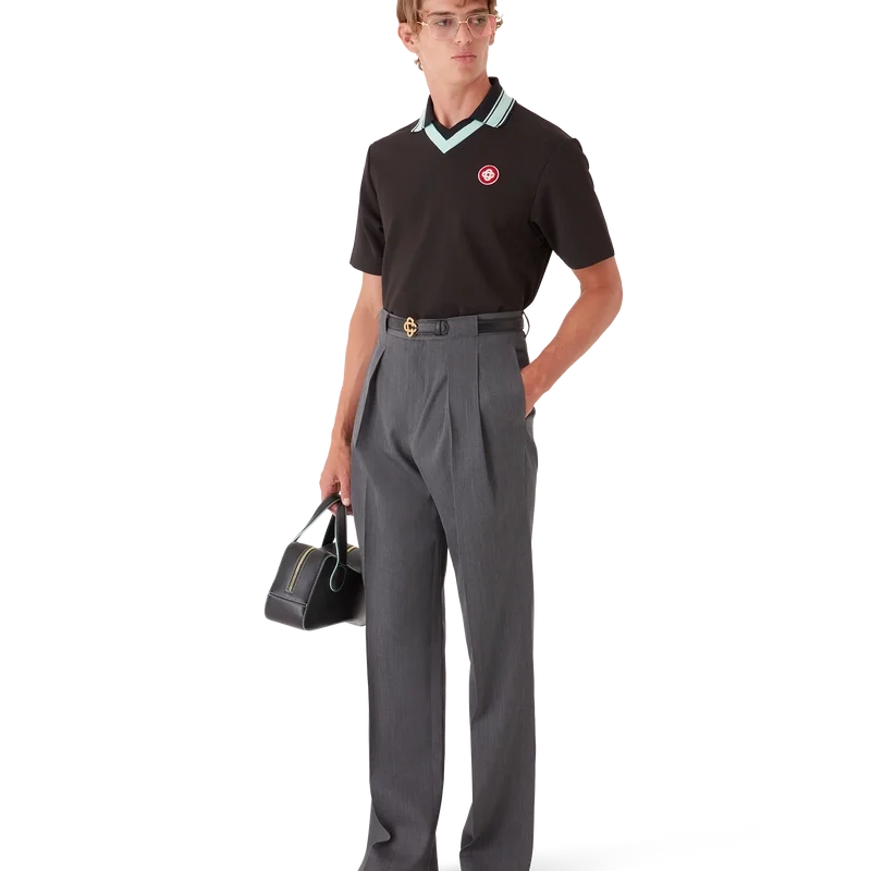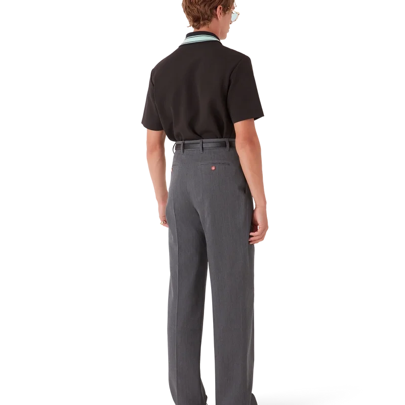 De skräddarsydda byxorna i ull med bälteshällor har raka ben och är tillverkade av kostymtyg. De har veck fram, dragkedja, snedställda framfickor, foder, bälteshällor och bakfickor med kantband samt husets sammanflätade CC-logotyp i guldpläterade, emaljerade knappar med platt skaft.