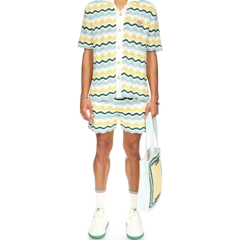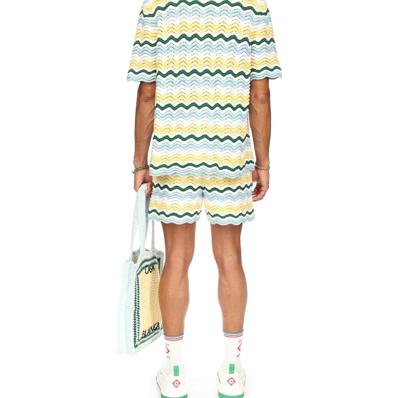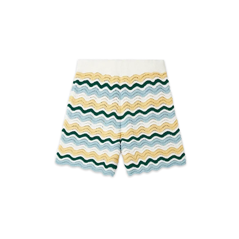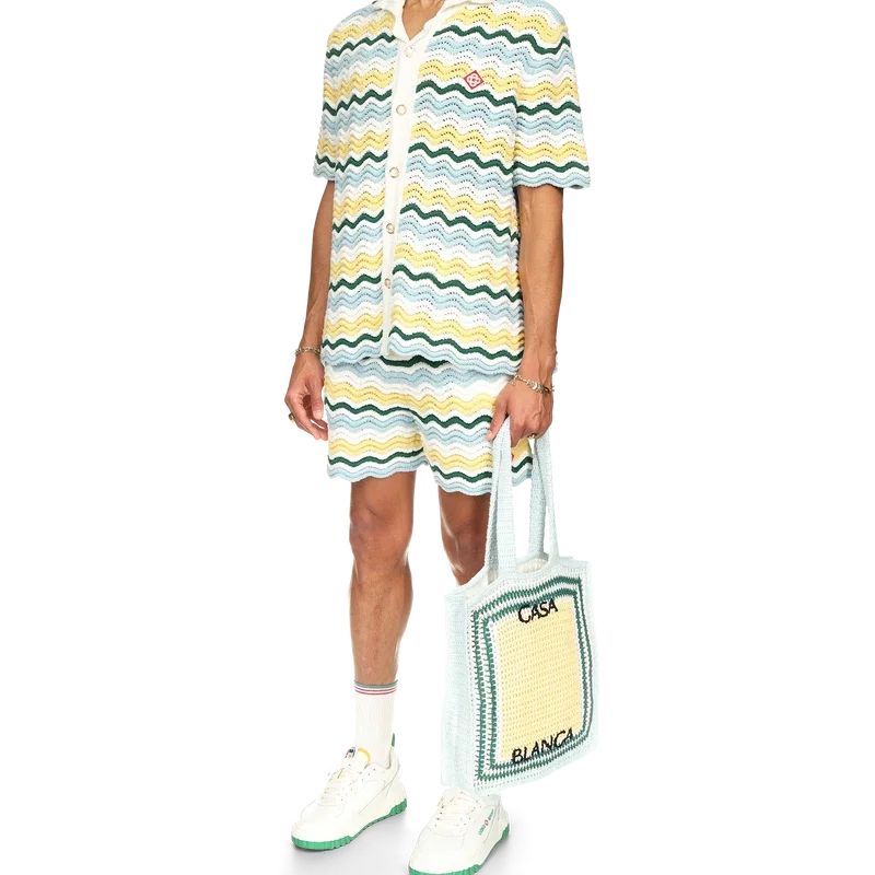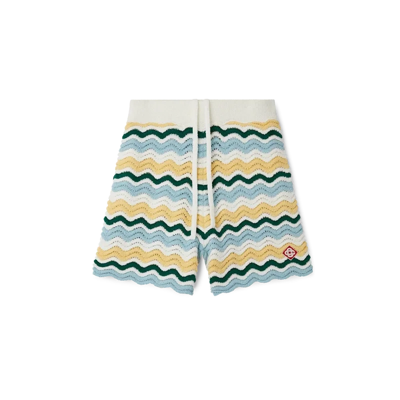De vågiga bouclé-shortsen är en signaturdesign från Casablanca, tillverkade av ett mjukt texturerat bouclé-tyg med öppen väv. Avslutade med en inre dragsko, husets diamantlogotyp och en Casablanca-märkesetikett – designade för att bäras med klassiska passformer.