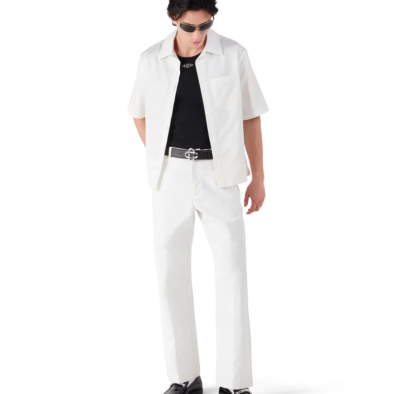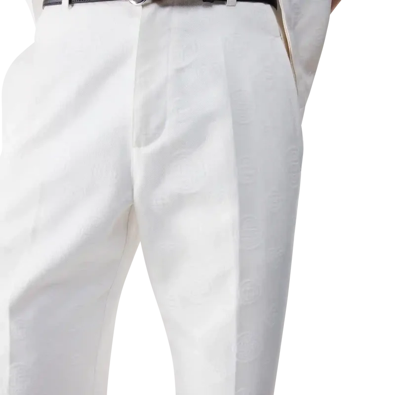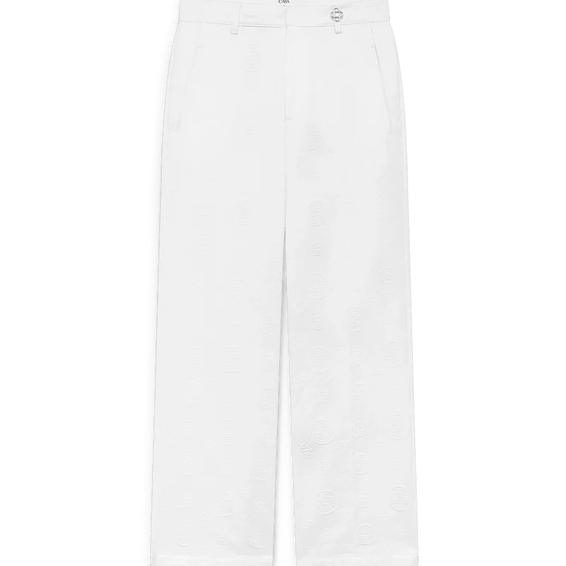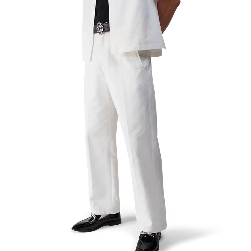 De vita Monogram-byxorna har en elegant rak passform med husets ikoniska Monogram-mönster. De har midjeband, bälteshällor med husets sammanlänkade CC-logotypnitar, dragkedja, snedställda framfickor och bakfickor.