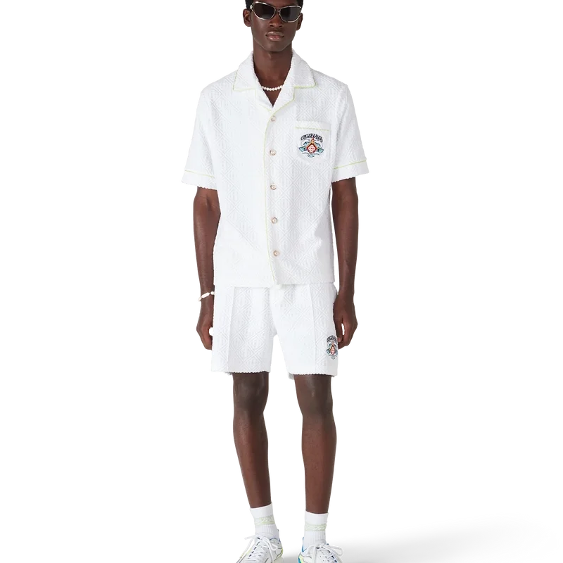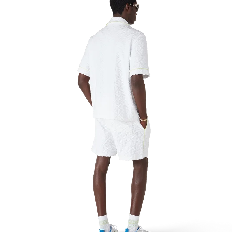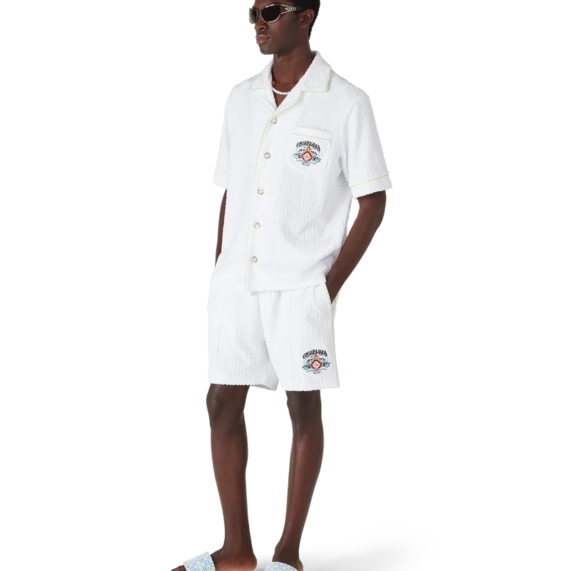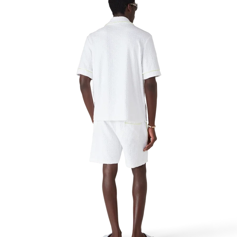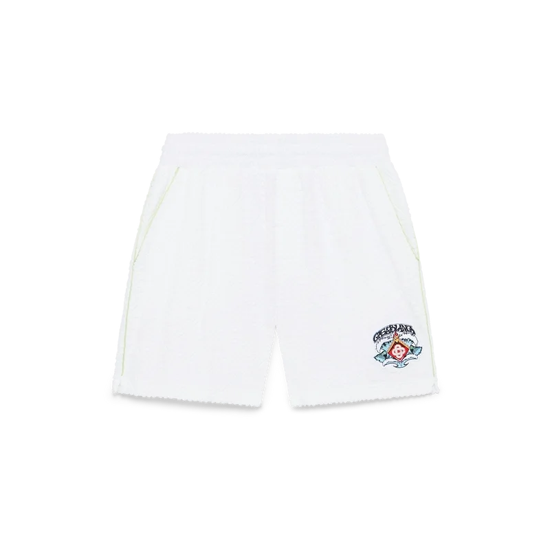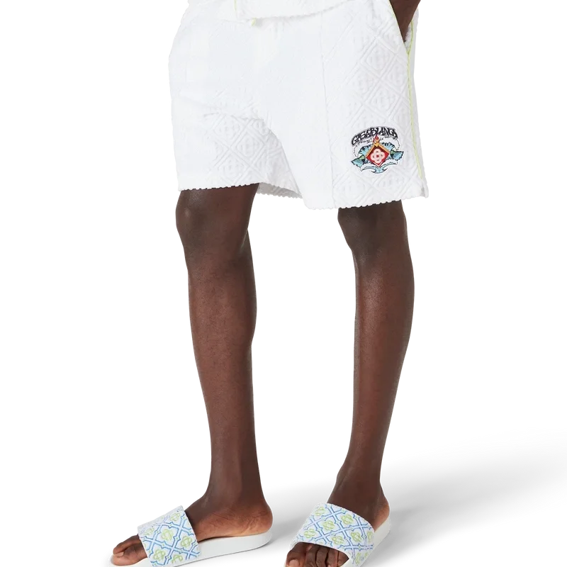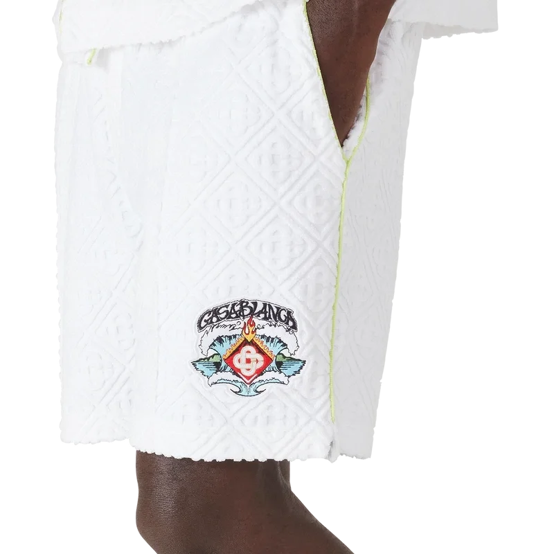 Frotteshortsen med monogram har säsongens motiv med en symmetrisk vågformation som bryter över husets signaturdiamantlogotyp kantad av lågor. Kompletteras med elastisk midjeresår, dragsko, snedställda sidfickor, en påsydd bakficka, veckade sömmar och pipingdetaljer längs fickorna och ned längs sidorna.