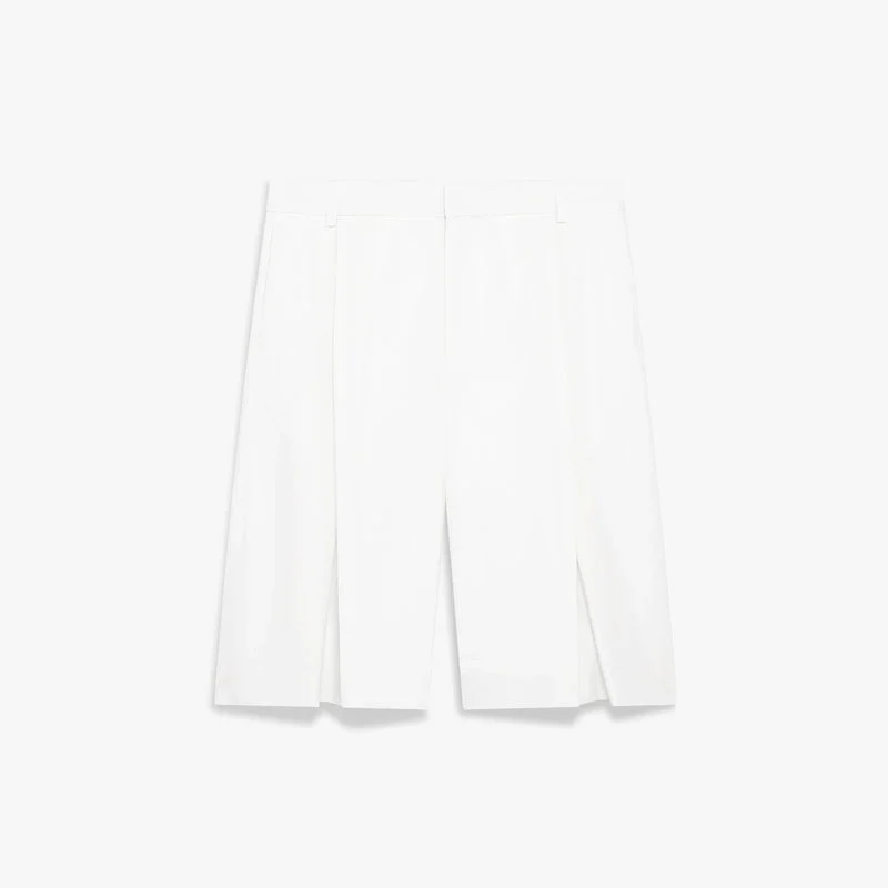 De vita plisserade baggy-shortsen är en elegant, knälång, skräddarsydd modell med plisserade detaljer över hela plagget. De har en strukturerad midjeresår, bälteshällor, dragkedja, snedställda sidfickor, bakfickor och en avslappnad silhuett.