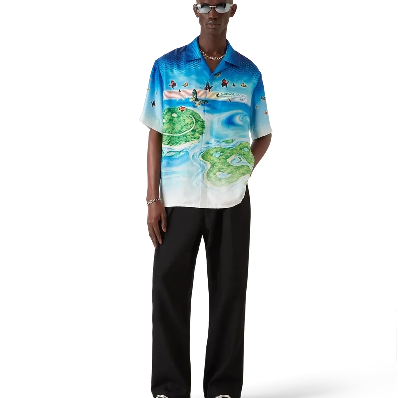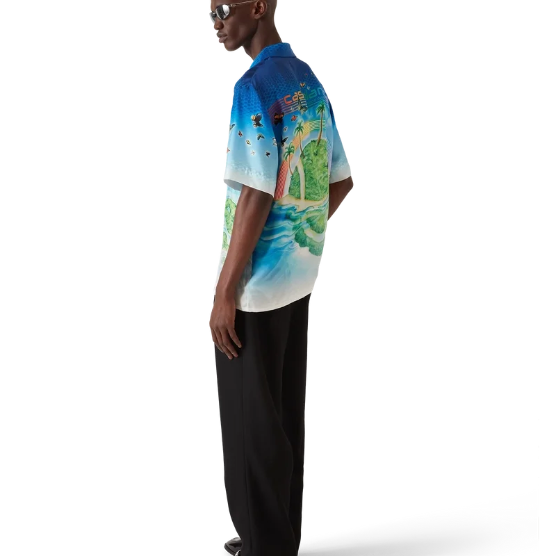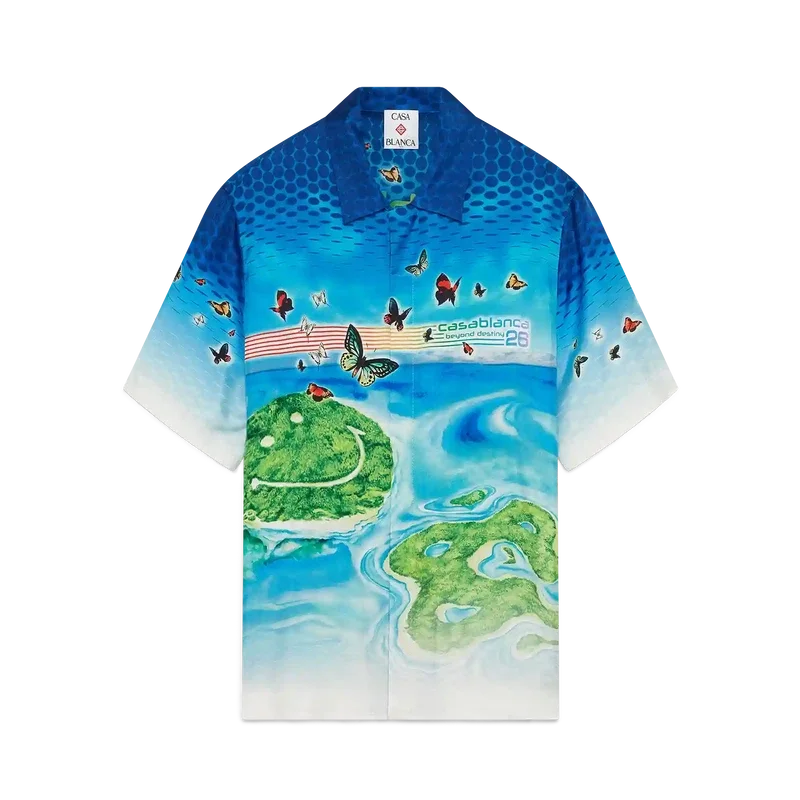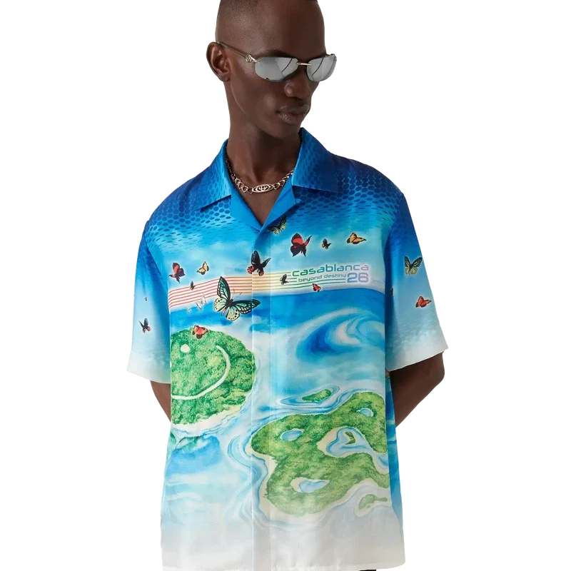 Beyond Destiny kortärmad skjorta är en ny tolkning av den klassiska Casablanca-souvenirskjortan i siden genom ett digitalt konstperspektiv, med halvtonade gradienter i lager på lager och motiv inspirerade av videospel. Handmålade fjärilar och drömlika ölandskap smälter samman med husets CC-logotyp, som i sin tur förvandlas till öar – symboler för flykt, glädje och identitet. Kompletterad med kubansk krage och korta ärmar.