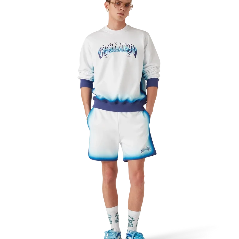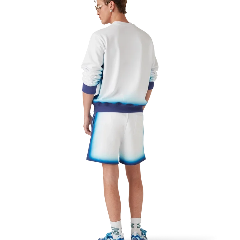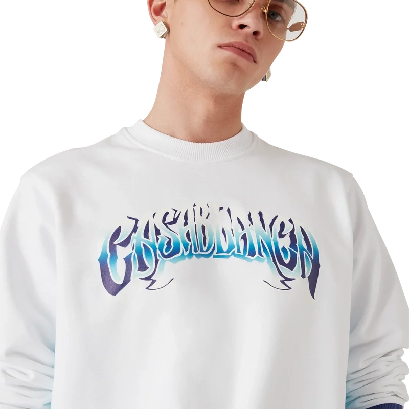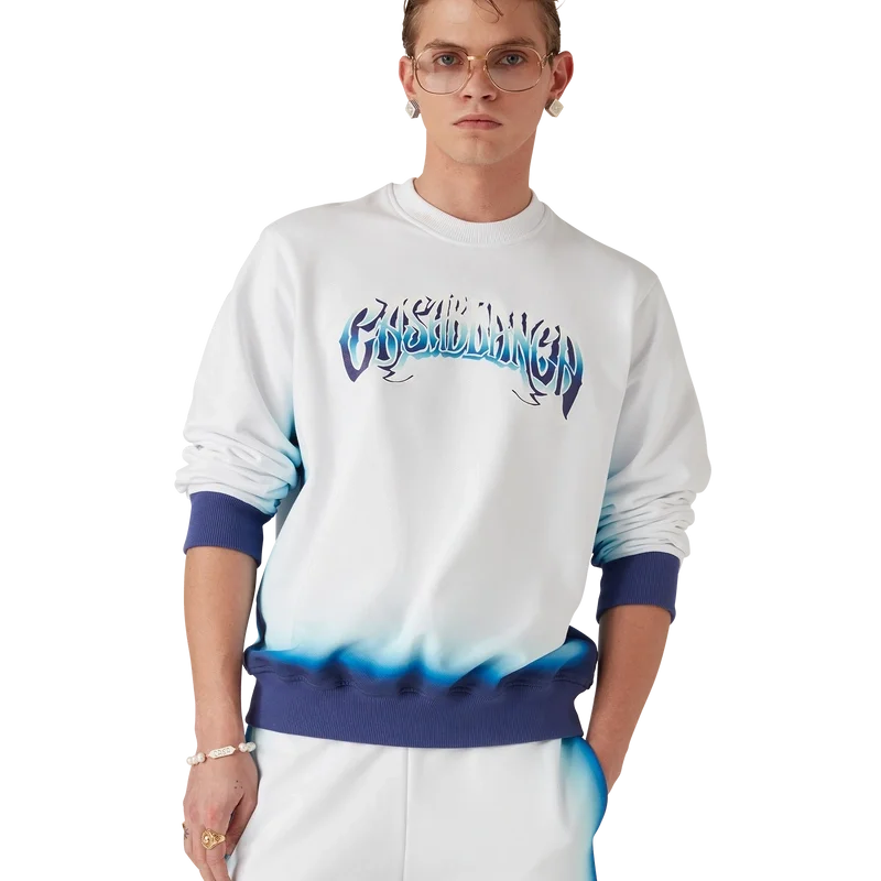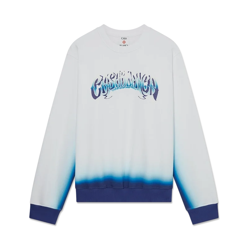 Den blåa blekta tröjan är en långärmad modell med märkets Casablanca-logotyp i en handritad typografi inspirerad av den gotiska typsnittet som används i tatueringar, tillverkad av bomullstyg. Kompletterad med en klassisk ribbad rund hals, kontrasterande ribbade muddar och nederkant samt blåa tryckta sömmar på ärmarna och sidorna.