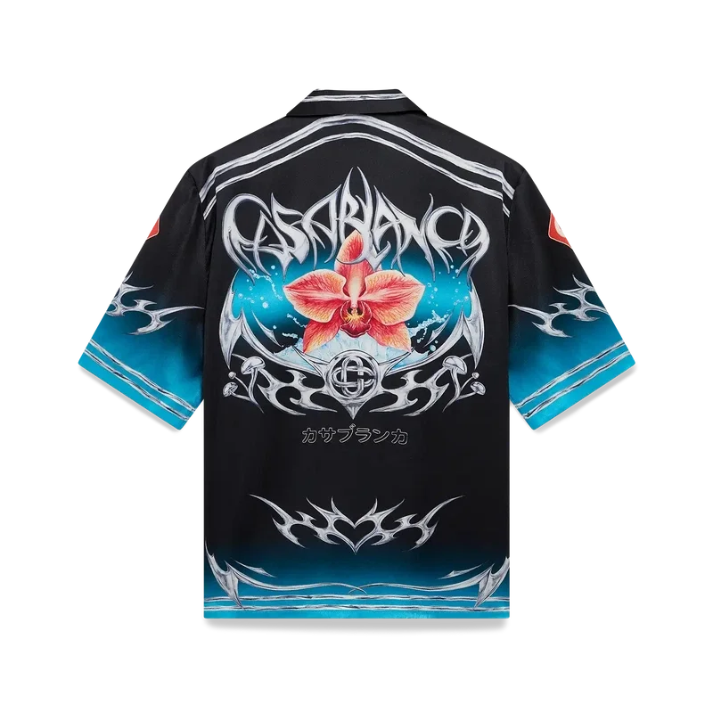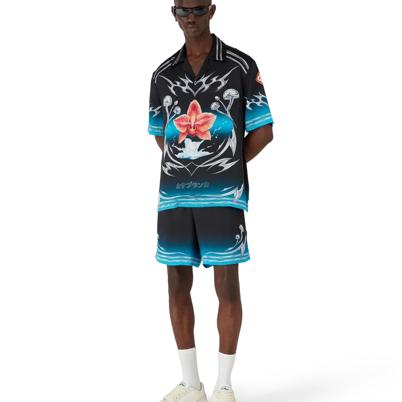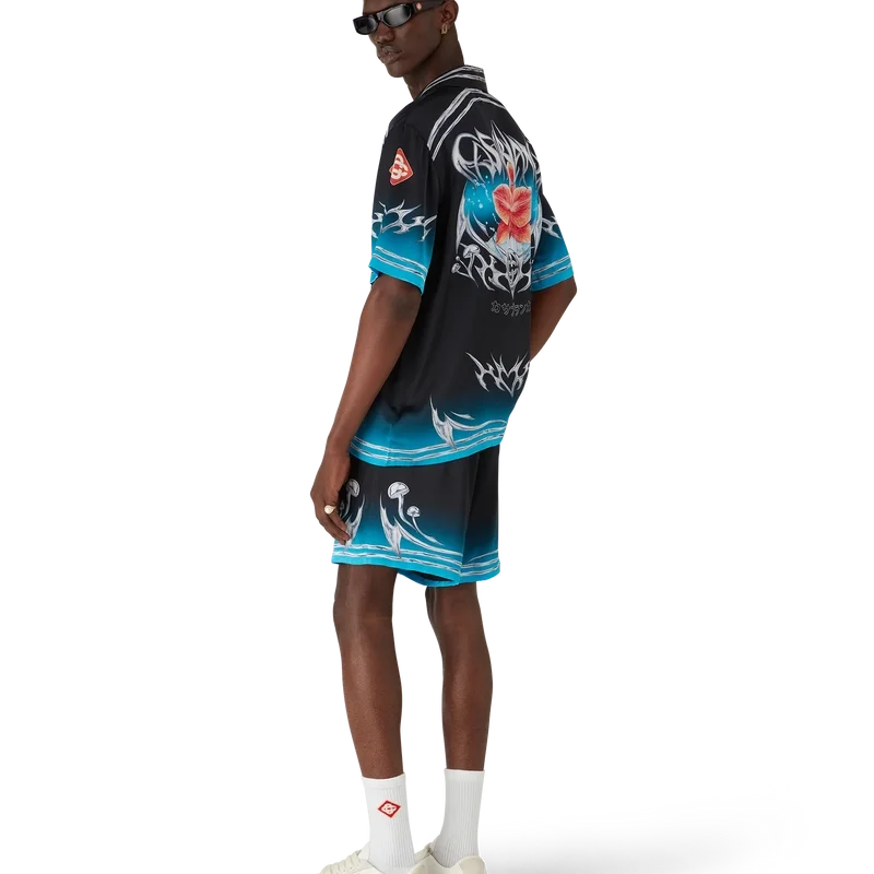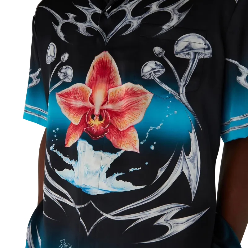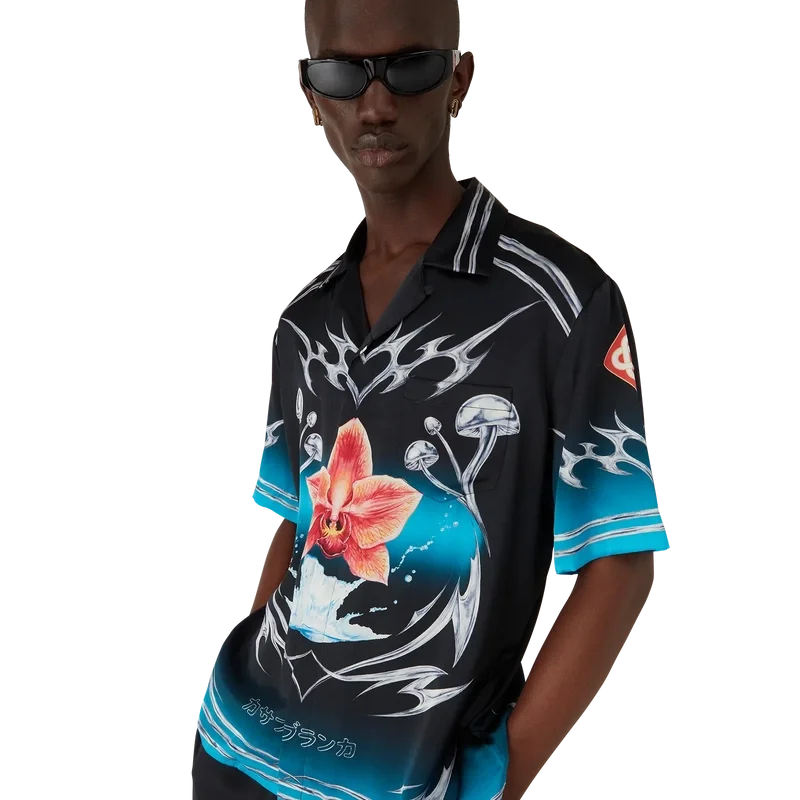 Blades kortärmade skjorta i silkesatin har ett tryckt mönster med konstverk som leker med kontrasten mellan två motsatta känslor – skärpan hos bladet och det kalla, silverkromade, i kontrast till naturens värme, som de djärva rosa och röda tonerna hos en orkidéblomma. Tillägget av vatten ger designen ett friskt och fräscht inslag. Kompletterad med kubansk krage, bröstficka, knäppning och signaturknappar i form av sammanlänkade Cc Corozo-knappar.