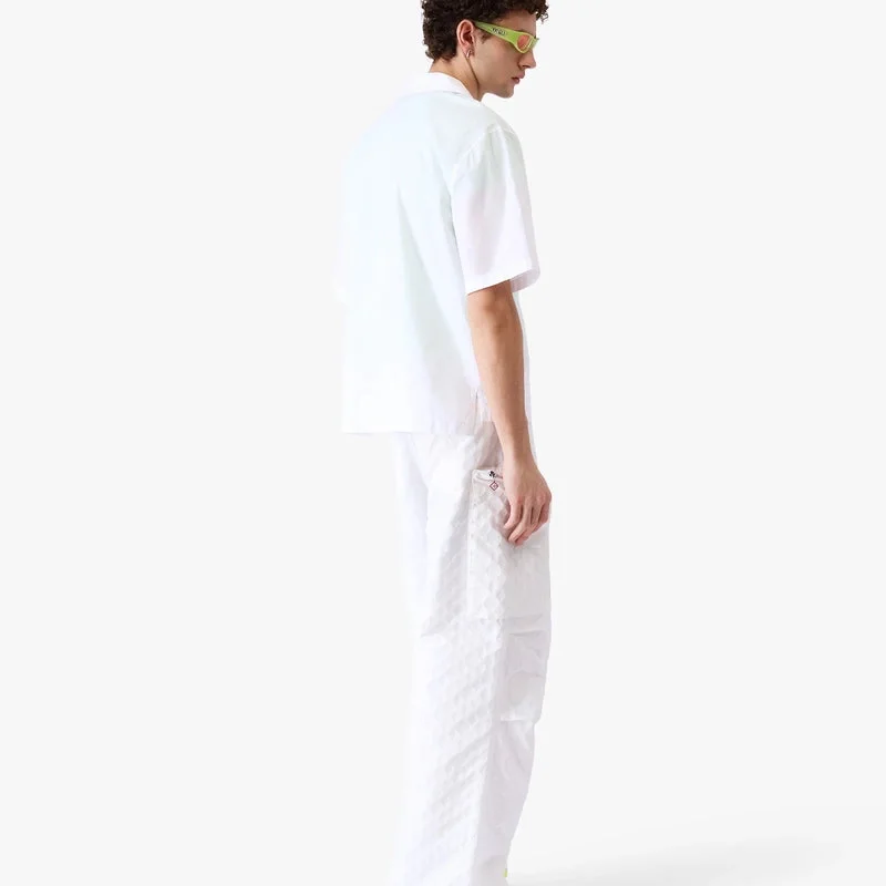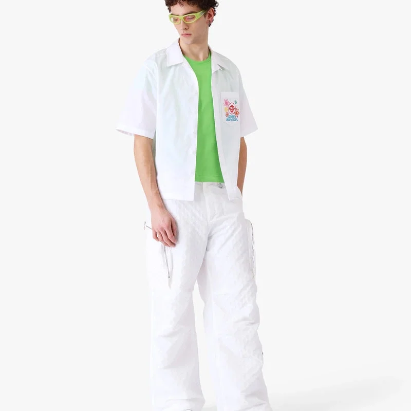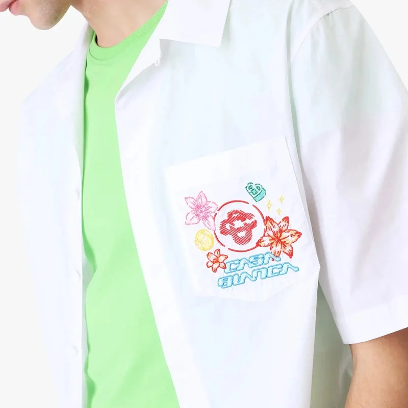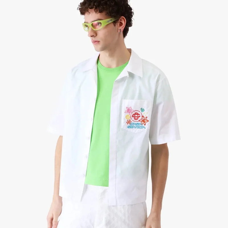 Den broderade kortärmade skjortan Collage D’icones Graphiques har en raffinerad design med konstverk som representerar ikonografin och designelementen för den nya säsongen, inklusive tolkningar av logotypen, Cc Smile och orkidéblomman. Kompletterad med krage, knäppning och bröstficka.