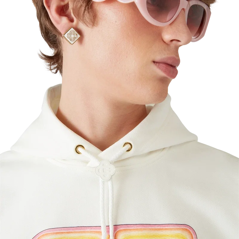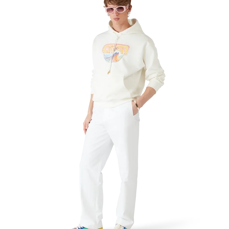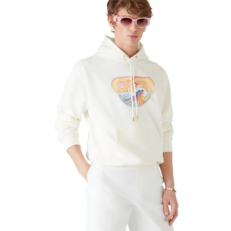 Casa Surf-tröja med huva är en långärmad tröja med tryck, tillverkad av ekologiskt bomullstyg och med säsongsbetonat motiv inspirerat av vintage-surfbrädor från 70-talet som bleknat i solen. Komplett med huva, dragsko med gulddetaljer, känguruficka samt ribbade muddar och nederkant.