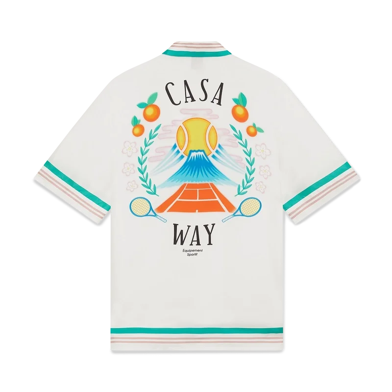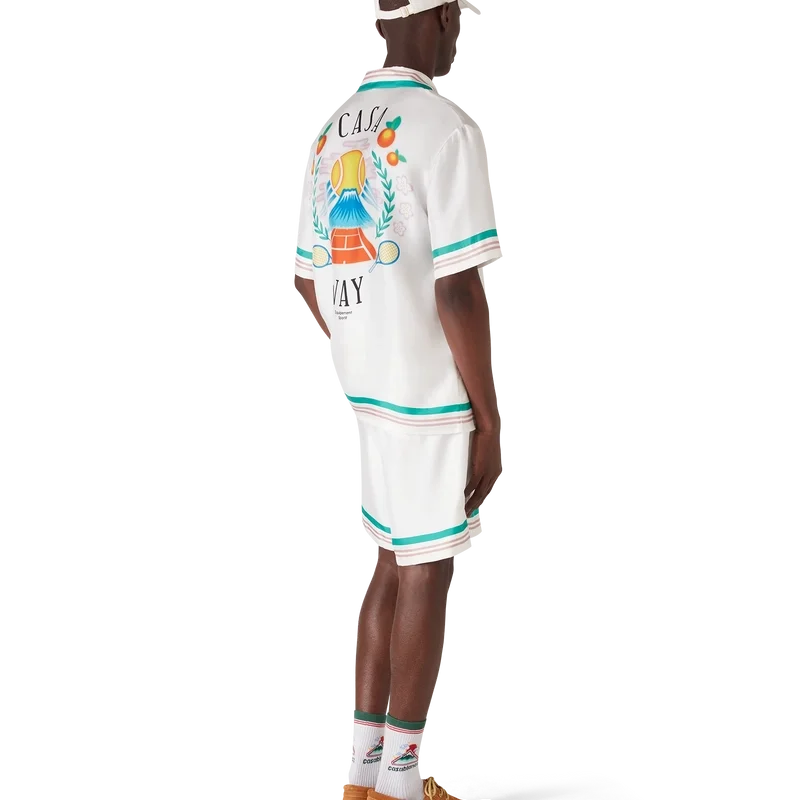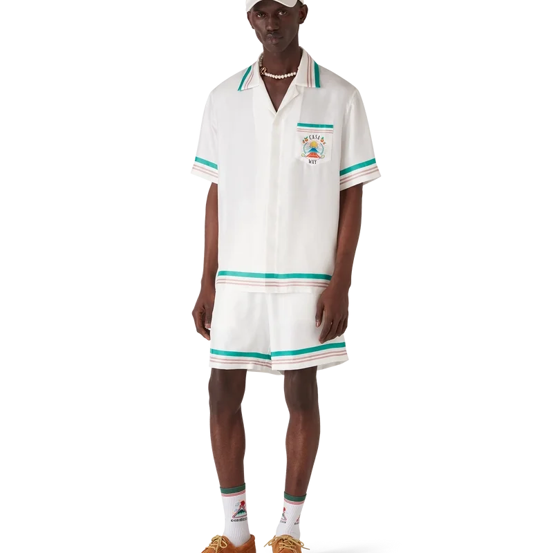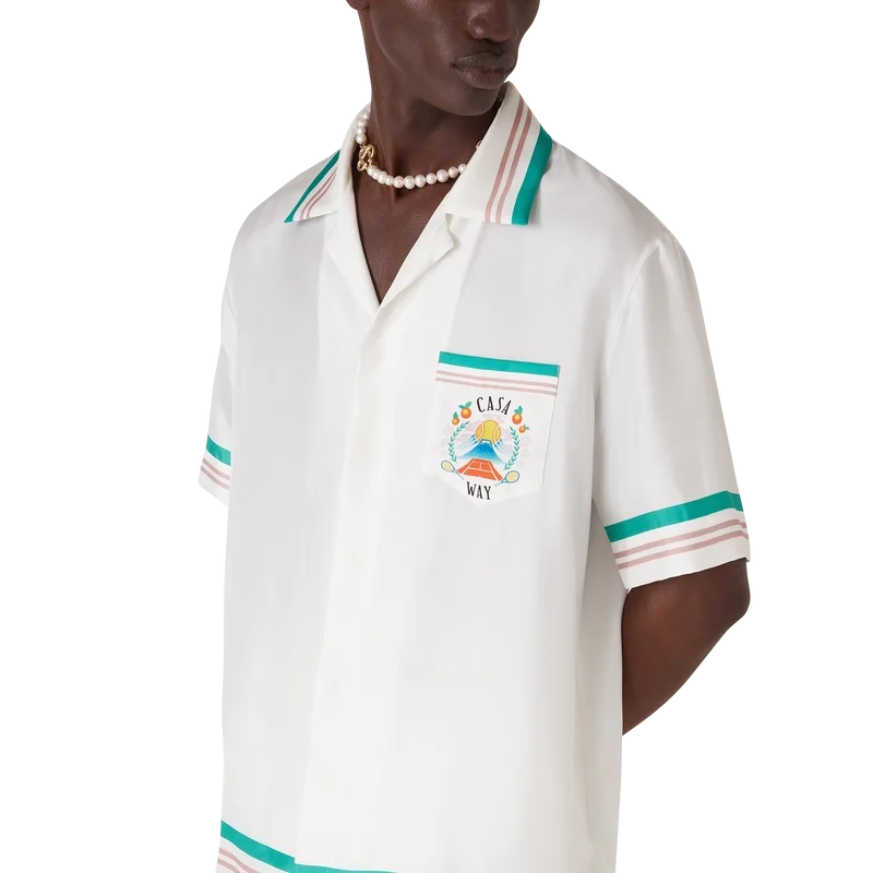 Casa Way kortärmad silkeskjorta är ett tryckt mönster med husets signaturkonstverk inspirerat av naturen, arkitektur och tennis – tillverkad av silketwilltyg. Kompletterad med kubansk krage, dold knäppning, sammanlänkade Cc-logotypknappar i corozo och randiga kanter på krage, manschetter och nederkant.