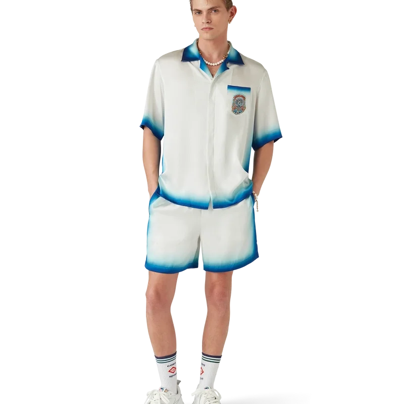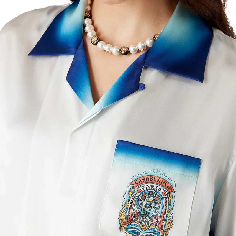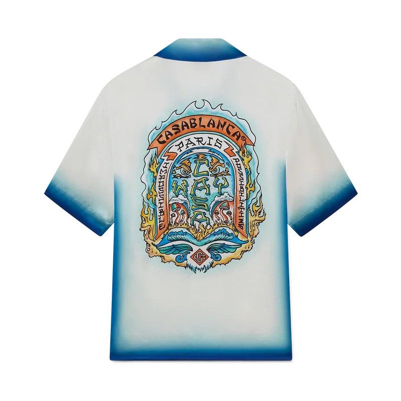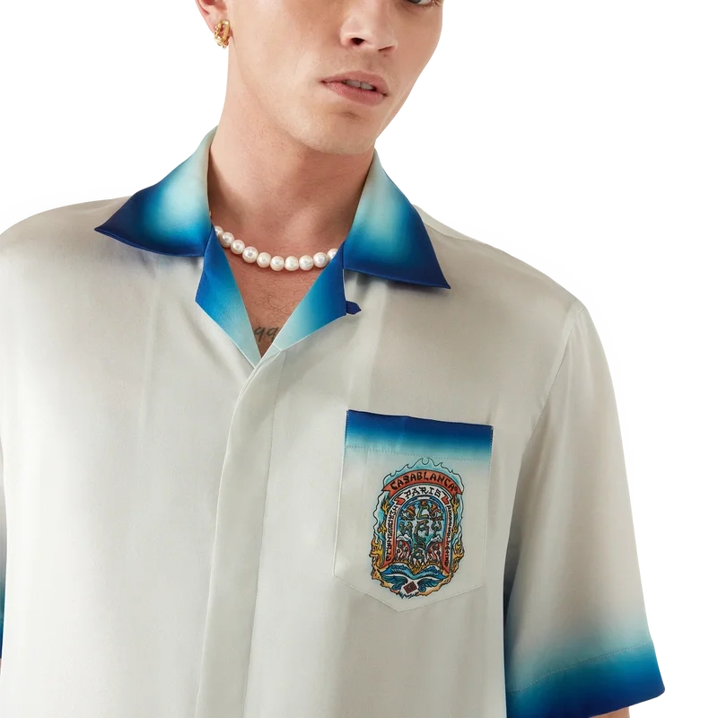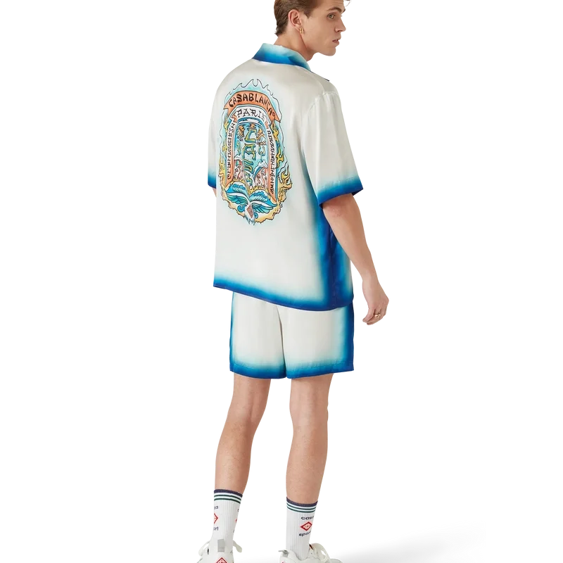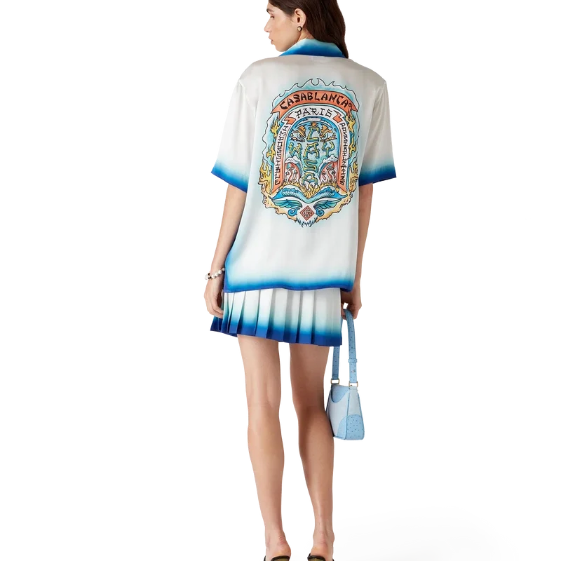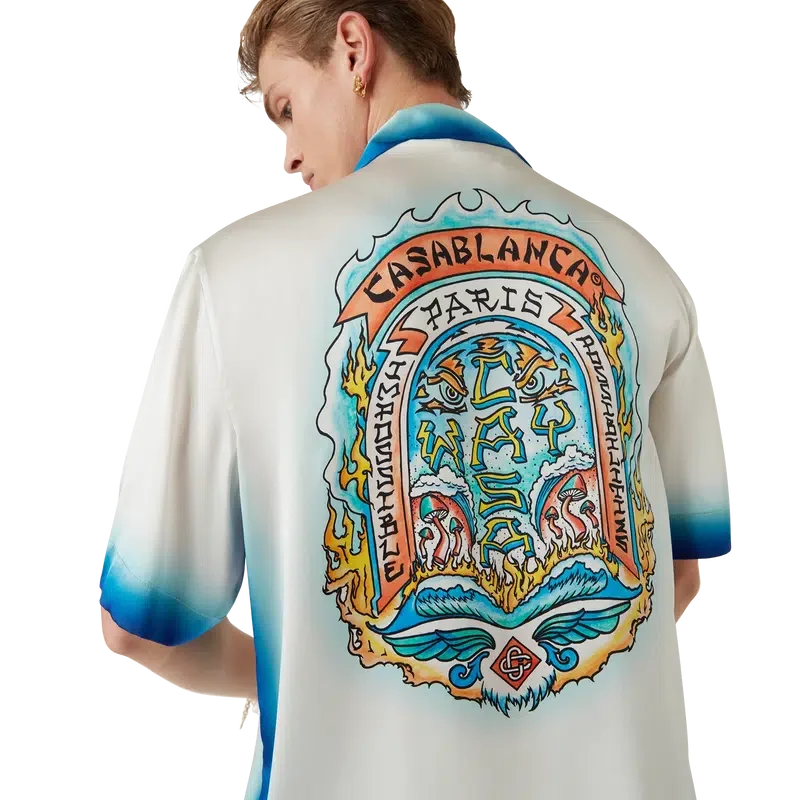 Casa Way Skate-silkeskjortan är en kortärmad modell tillverkad av ett tryckt silkesatintyg med säsongens Casa Way Skate-motiv, inspirerat av klassiska 70-tals-skate-symboler från Kalifornien med en uttonad ram. Kompletterad med kubansk krage, bröstficka, dold knäppning med sammanlänkade Cc Corozo-knappar samt kantdetaljer på ficka, krage, manschetter och nederkant.