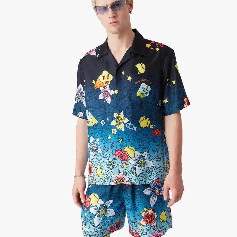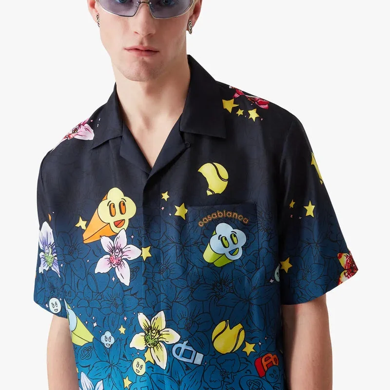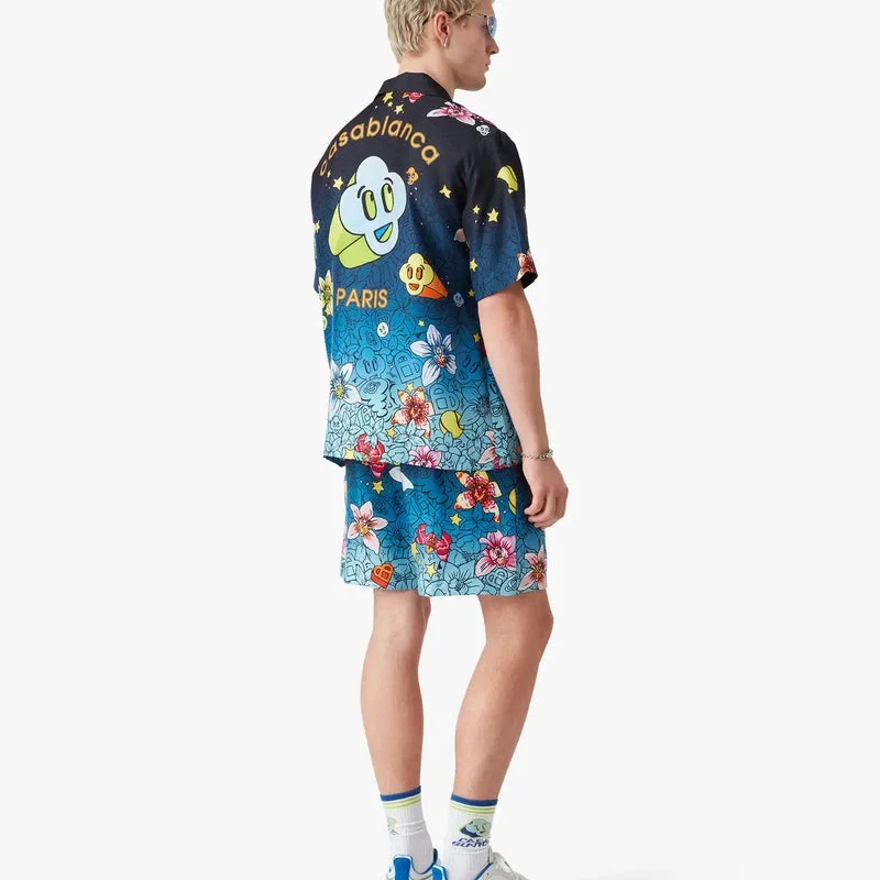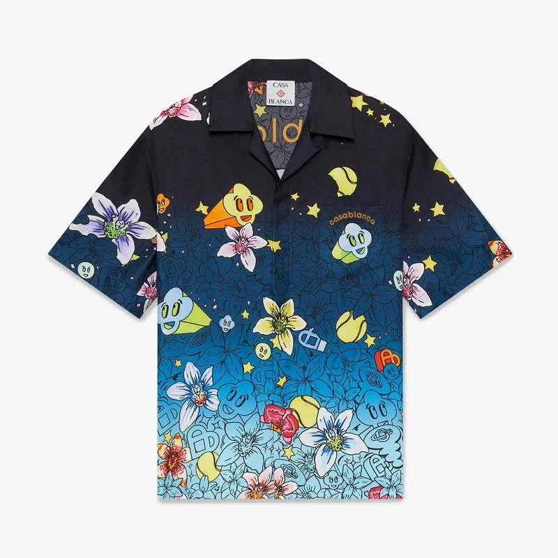 Collage D’icones Graphiques kortärmad silkesskjorta har ett heltäckande tryck med konstverk som representerar ikonografin och designelementen för den nya säsongen, inklusive tolkningar av logotypen, Cc Smile och orkidéblomman. Kompletterad med kubansk krage, knäppning, knappar med sammanflätat CC-logo i corozo, bröstficka och husets Casablanca-logo.