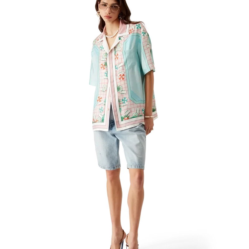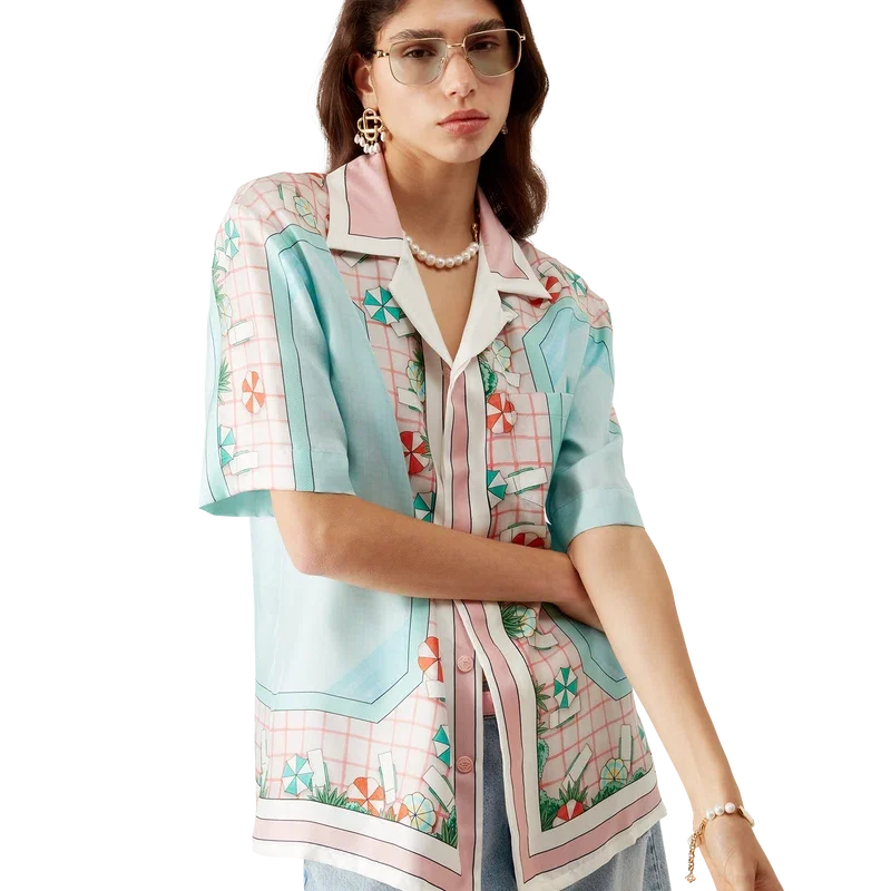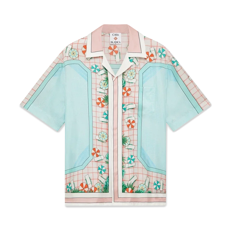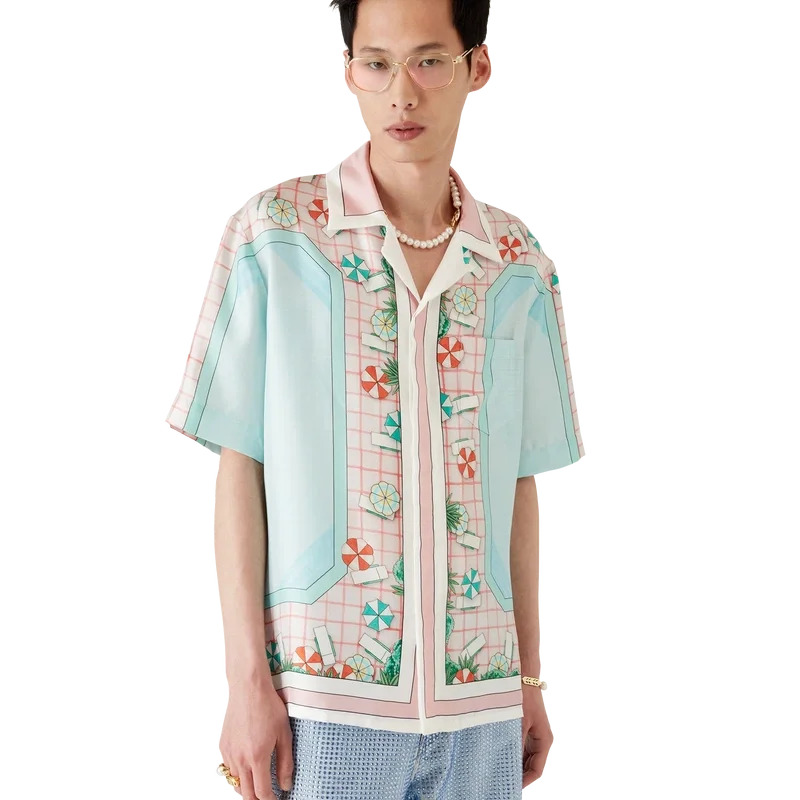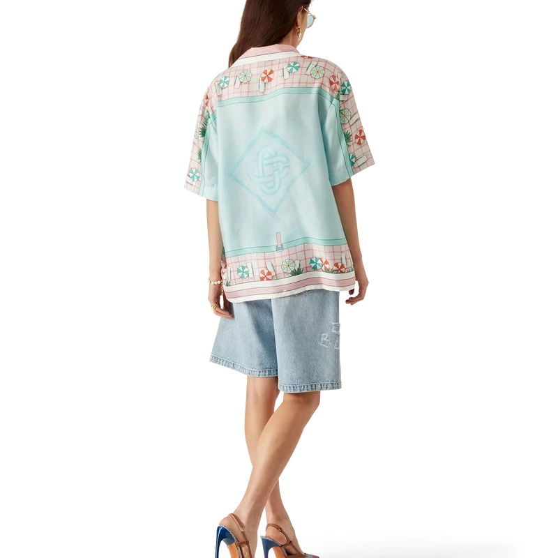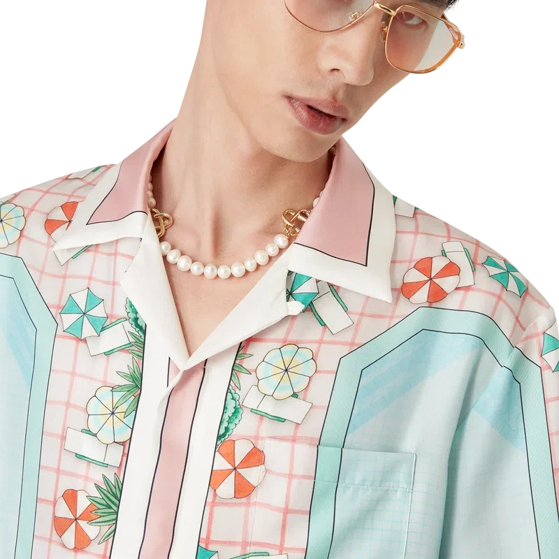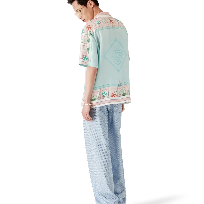 Copacabana kortärmad silkeskjorta har ett heltäckande tryck med husets signaturmotiv, inspirerat av en hotellpool och reselivets idealism, och visar en vacker dag vid poolen sedd uppifrån – vilket ger en ny perspektiv – tillverkad av silketwill.