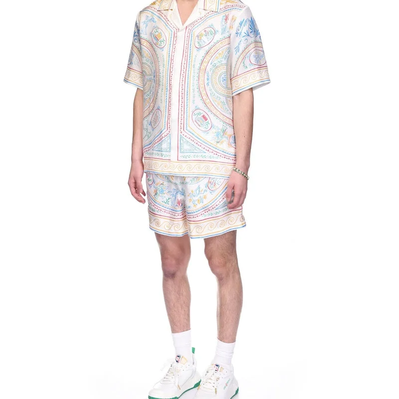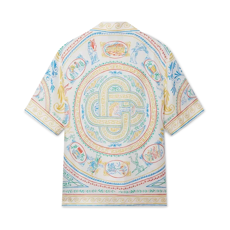 Crayon Vase Silk Skjorta är en mångfärgat tryckt design tillverkad av silketwilltyg, med säsongens konstverk inspirerat av en klassisk grekisk tallriksdesign med husets designkoder. Kompletterad med kubansk krage, knäppning, signaturknappar med CC-logotyp i corozo, säsongens grekiska våg- och randdetaljer på krage, manschetter och nederkant.