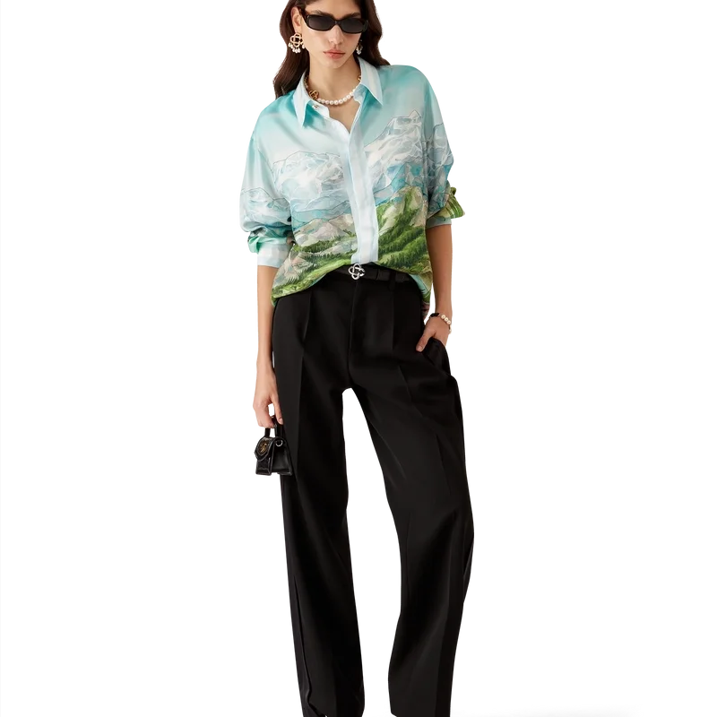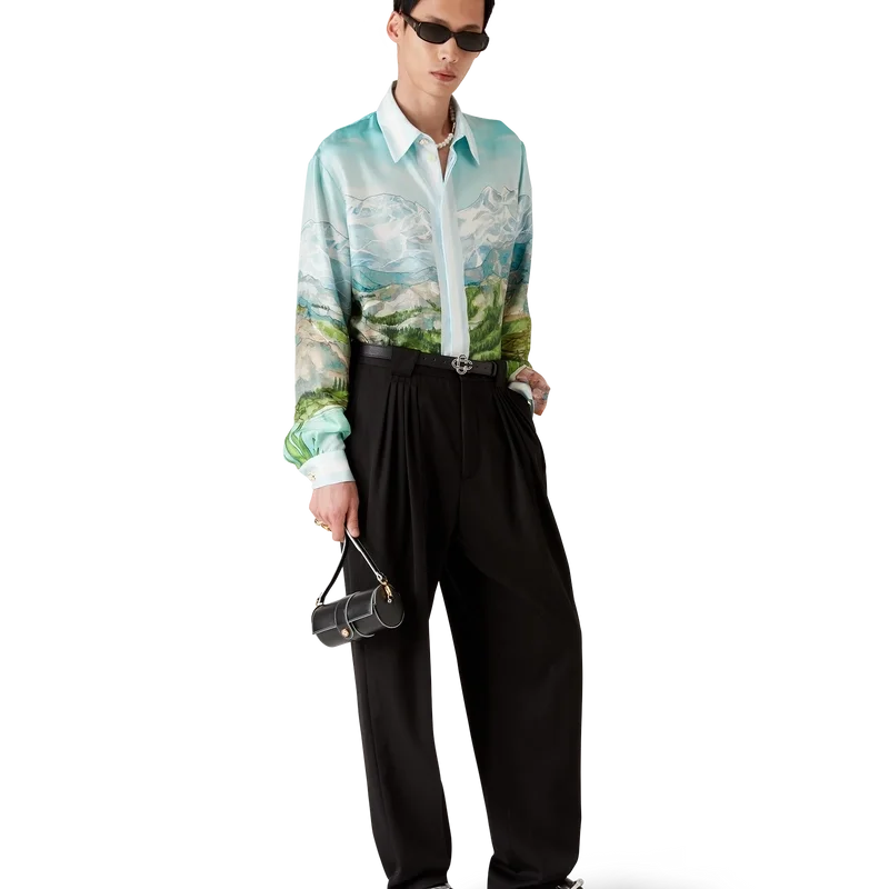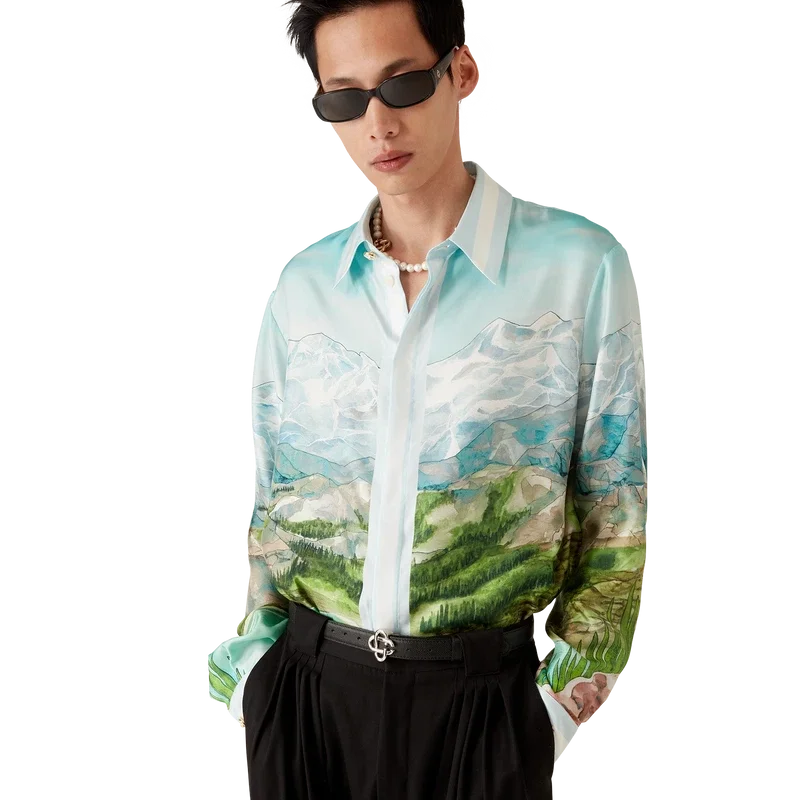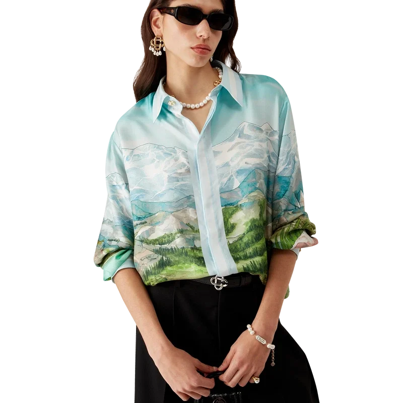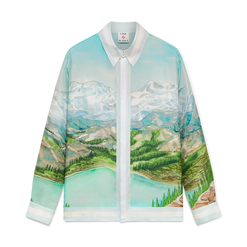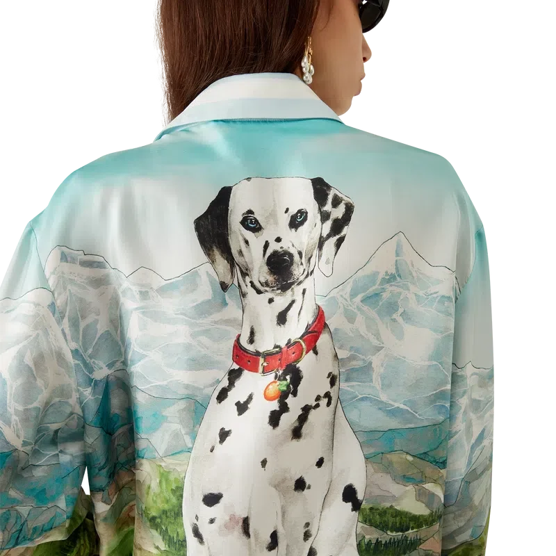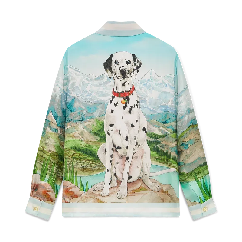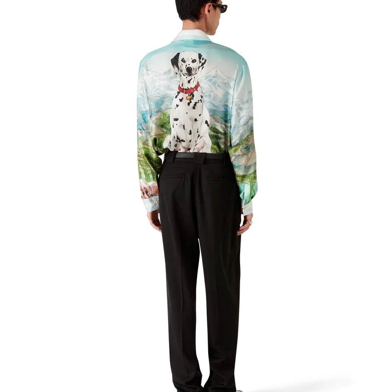 Dalmatian a La Montagne långärmad silkeskjorta är en heltryckt design tillverkad av silkestwilltyg med husets signaturmotiv som föreställer ett landskap med snötäckta berg, sjöar och en dalmatiner. Kompletterad med krage, knäppning, Corozo-knappar med sammanlänkat CC-logo, signaturknappar med pärlblommor vid krage och manschetter samt randiga kantdetaljer på krage, manschetter, nederkant och knäppning.