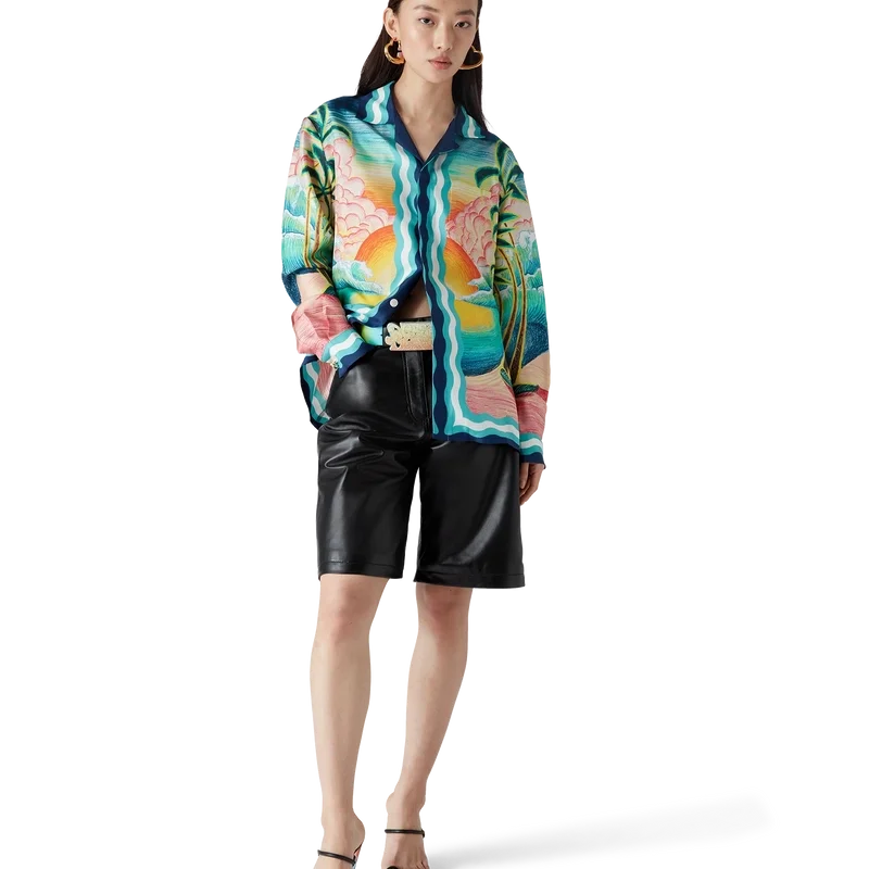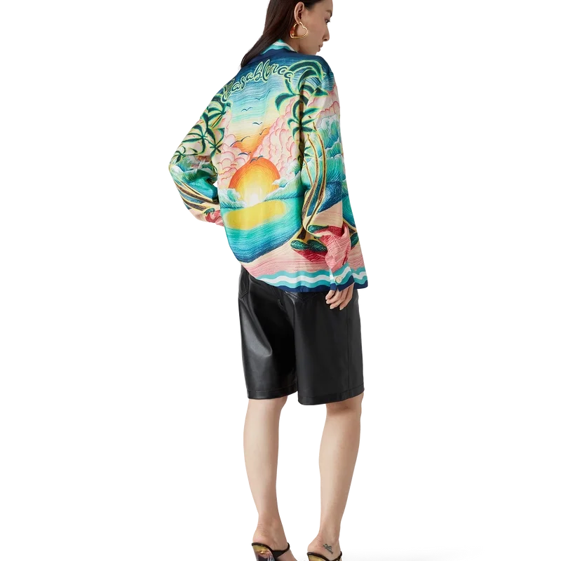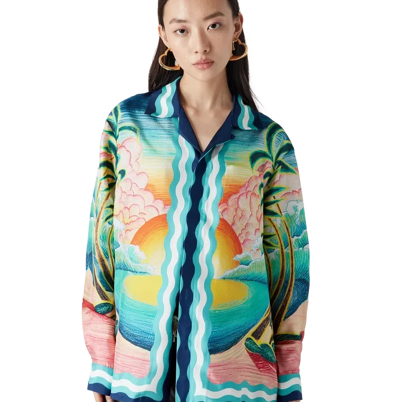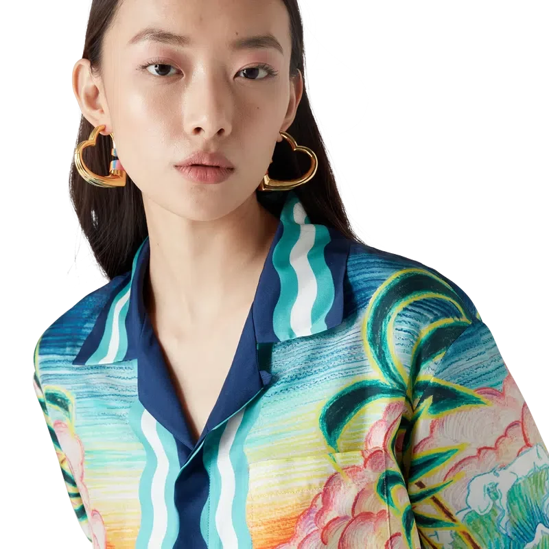 Danse De La Mer-silkeskjortan är en långärmad skjorta med heltryckt mönster med handmålade scener som skapats speciellt för kollektionen och tillverkad av silkesväv. Avslutad med knäppning, sammanlänkade Cc-logotypknappar i corozo, signaturknappar i emalj med guldkant samt randiga detaljer inspirerade av Memphis Wave-designen på fållen, manschetterna, kragen och knäppningen.