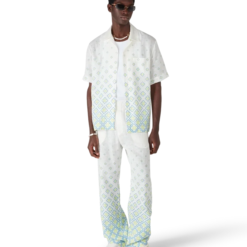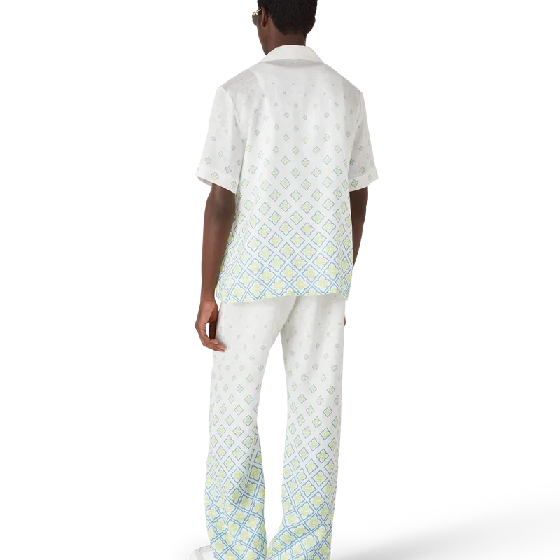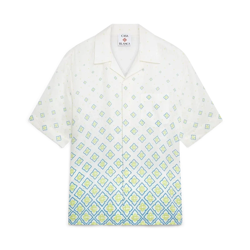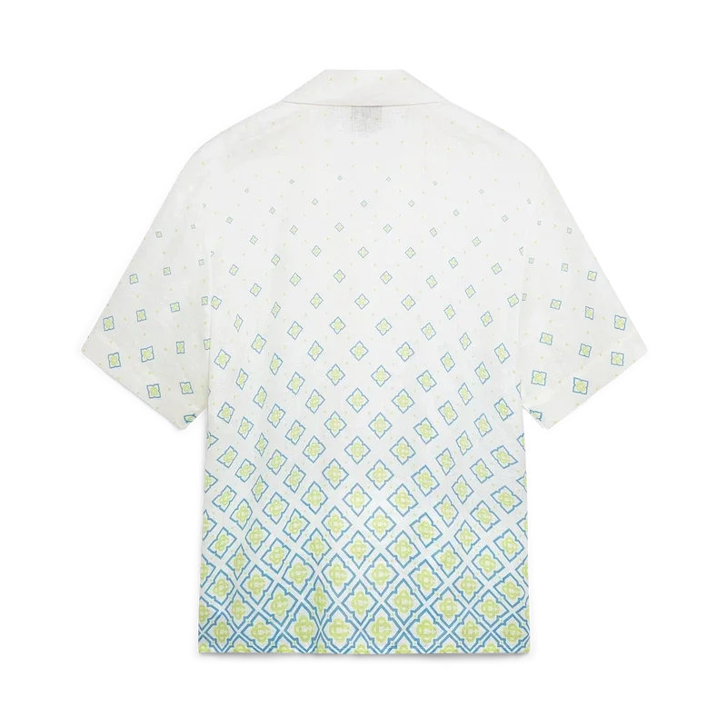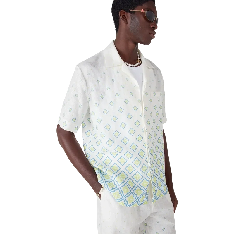 Den kortärmade linne-skjortan med Degrade Monogram har en elegant krage. Den har en kubansk krage, knäppning med Corozo-knappar med sammanflätade CC-logotyper och en bröstficka.<!–