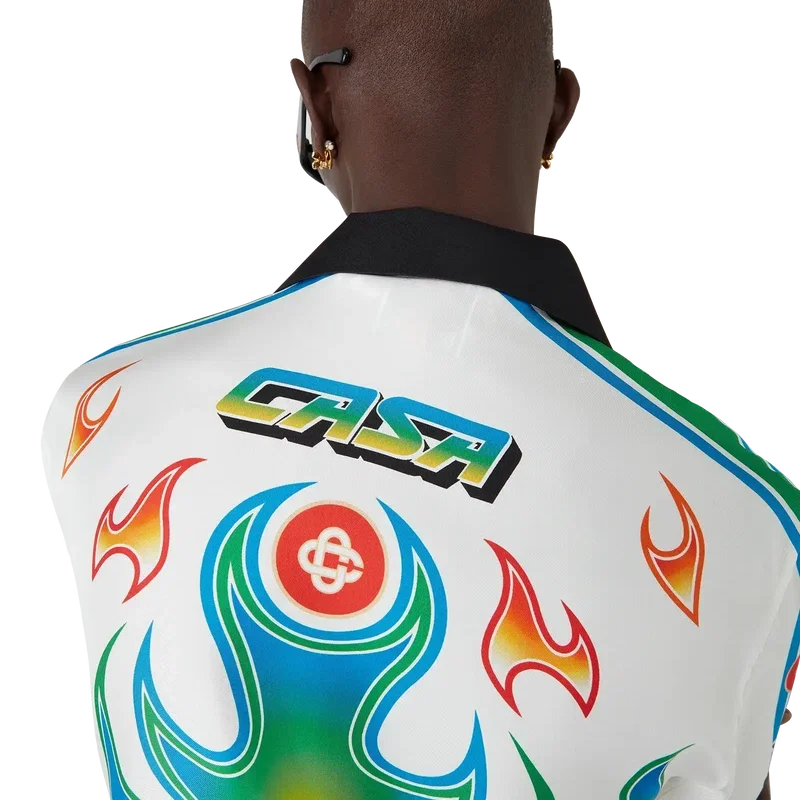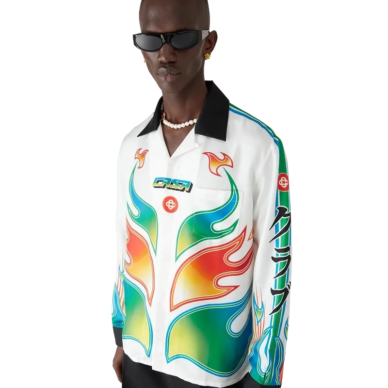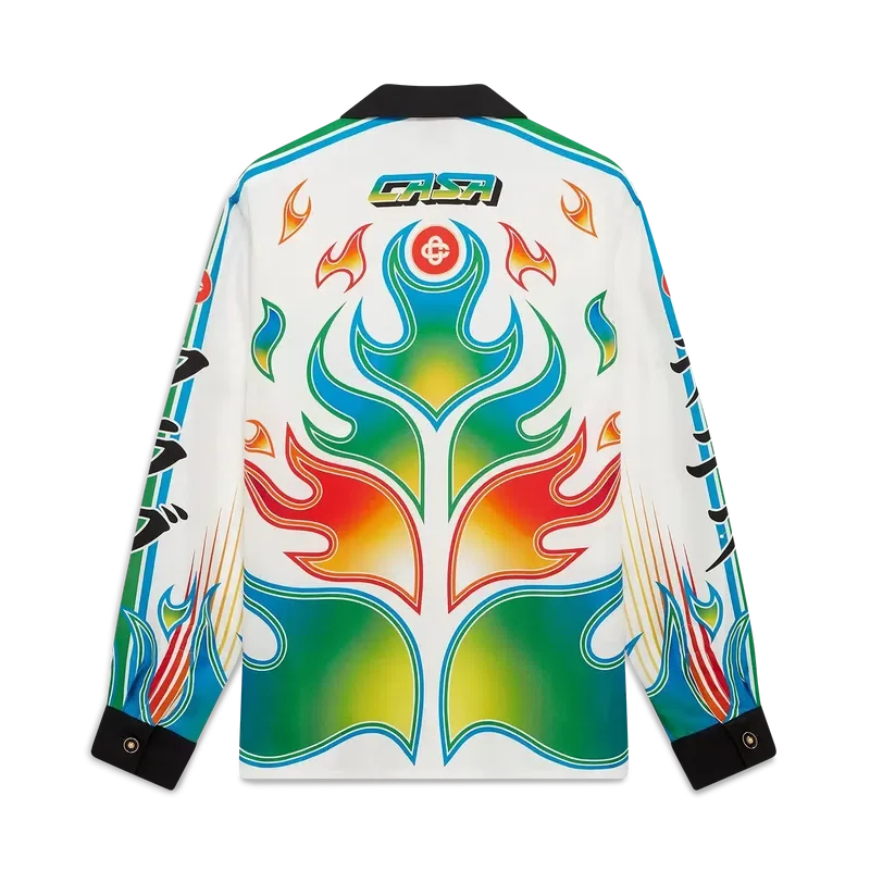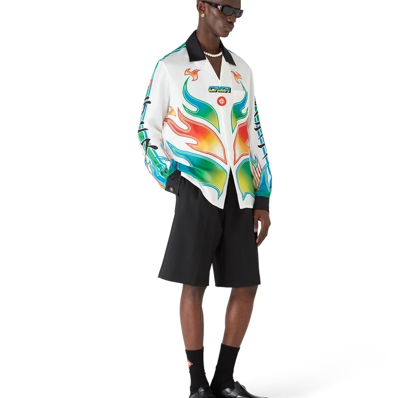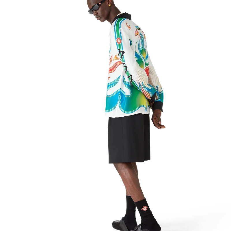 Flame Laurel långärmad silkesskjorta har ett tryckt mönster med säsongens Flames-motiv – en uppdaterad version av vår Laurel-skjorta från den nigerianska kollektionen, inspirerad av fotbollströjornas djärva grafik. Vi har införlivat element från vintage japanska fotbollströjor, med grafiska mönster och typografi, inklusive text på ärmarna för den där klassiska sportiga känslan. Kompletterad med kubansk krage, knäppning, Corozo-knappar med sammanflätat CC-logo, guldfärgade emaljknappar vid manschetterna, en bröstficka samt kontrasterande svarta detaljer vid krage, manschetter och nederkant.