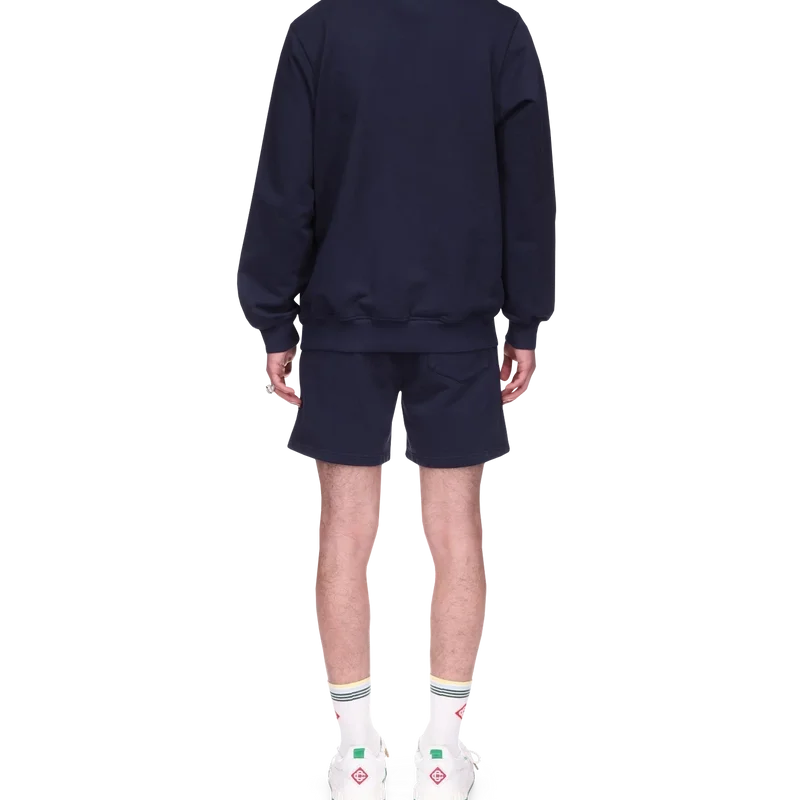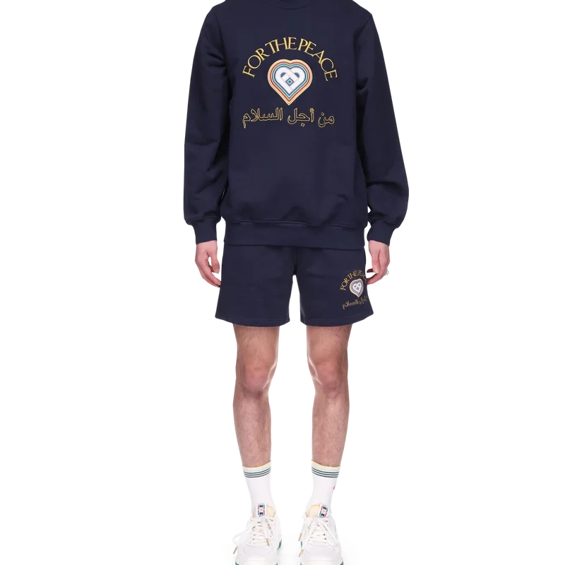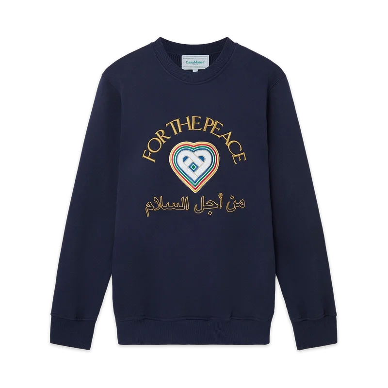 For the Peace-tröjan i marinblått har säsongens broderade motiv ”for the Peace”, ett hyllning till dem som kämpar mot alla former av förtryck och banar väg för en bättre framtid för alla. Tröjan har en klassisk rund hals, långa ärmar och en etikett med Casablanca Paris-logotypen, och är designad för en avslappnad passform.