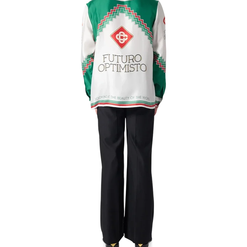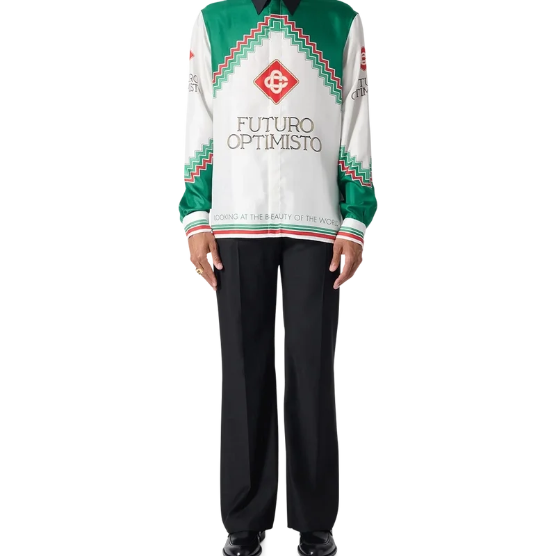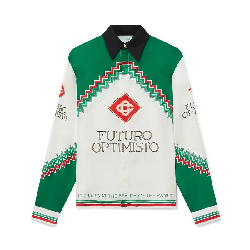 Futuro Optimisto-silkes skjortan är ett nyckelplagg från vår/sommarkollektionen 2023 med frasen ”Looking at the Beauty of the World” och husets signatur Diamond Monogram. Futuro Optimisto är inspirerad av den eviga hoppet i anden och representerar människan i harmoni med skapelsen. Avslutad med vårt signaturknäppning med guldkantade pärlknappar vid hals och manschetter, dold knäppning och en Casablanca Paris-märkesetikett.