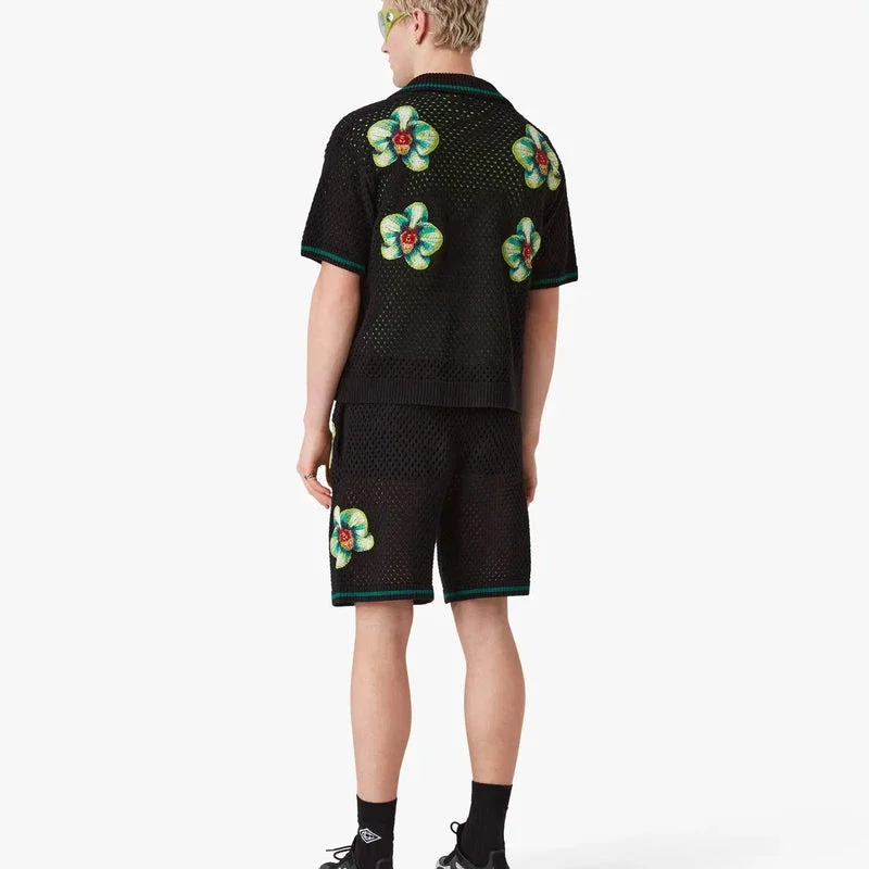 Glitch Orchid broderad kortärmad virkad skjorta har en raffinerad design med konstverk som representerar den kontrasterande designfilosofin där naturen och det konstgjorda möts och samverkar i harmoni genom att visa orkidéblommans naturliga skönhet. Avslutas med ribbad fåll, knäppning, kubansk krage, knäppning och signaturknappar med guldkant och pärlor.