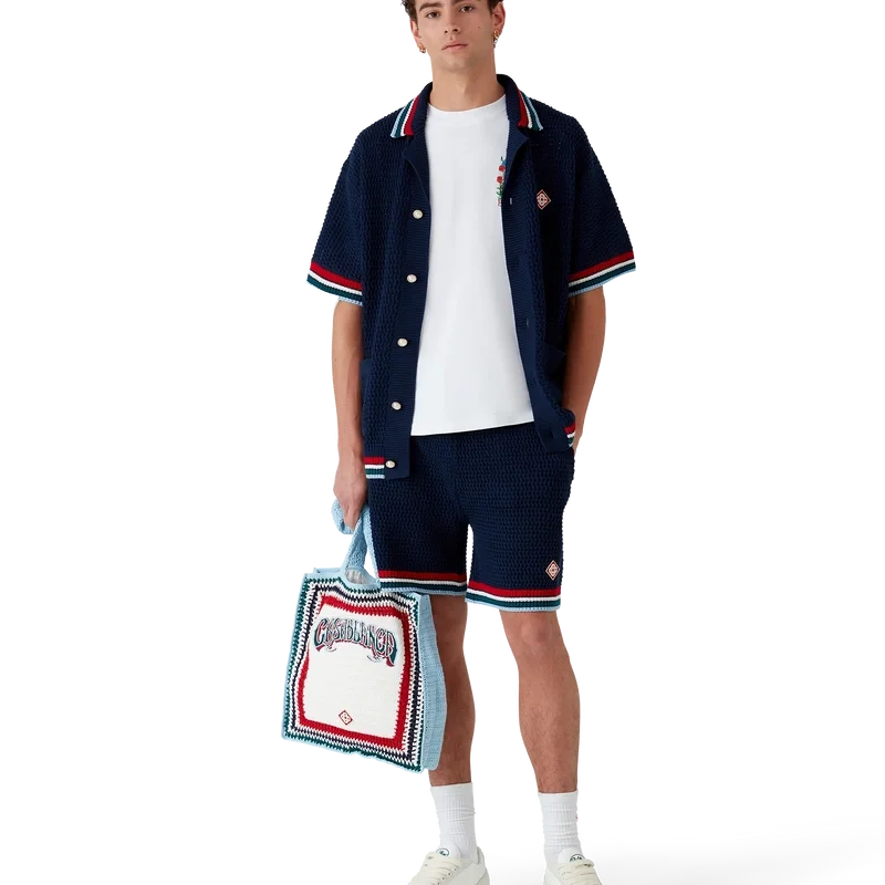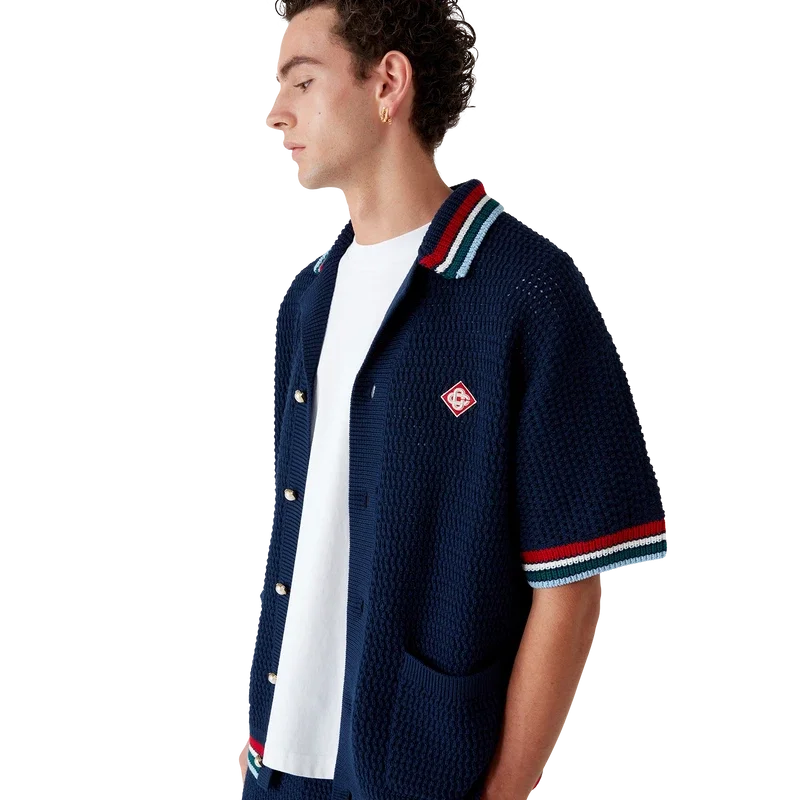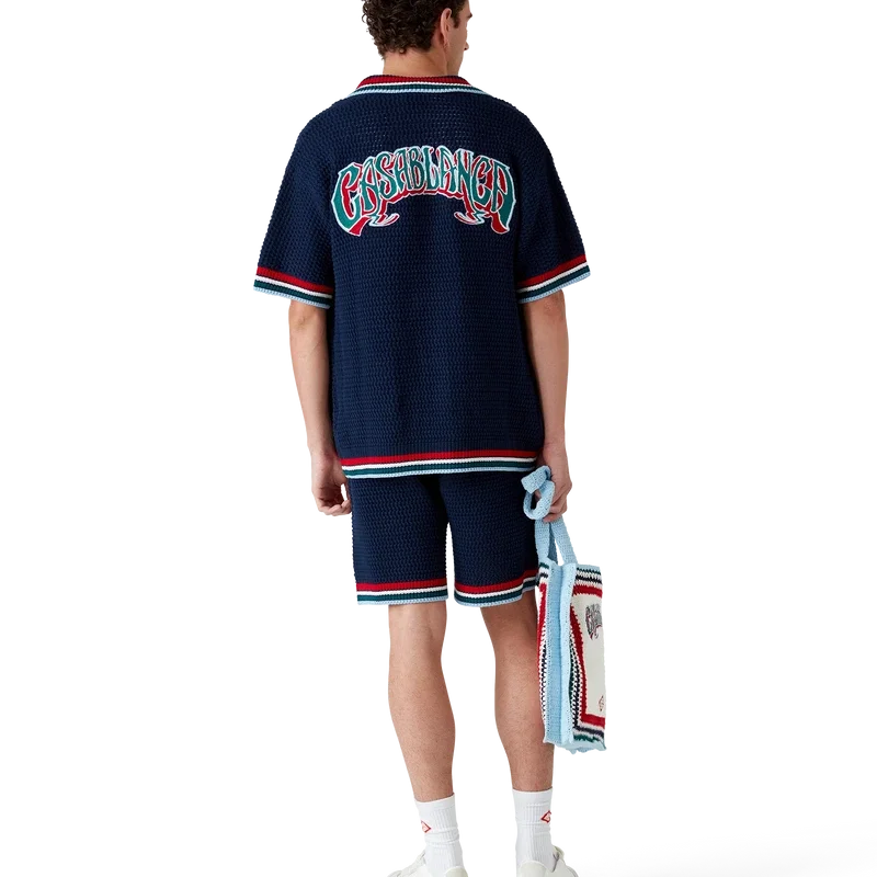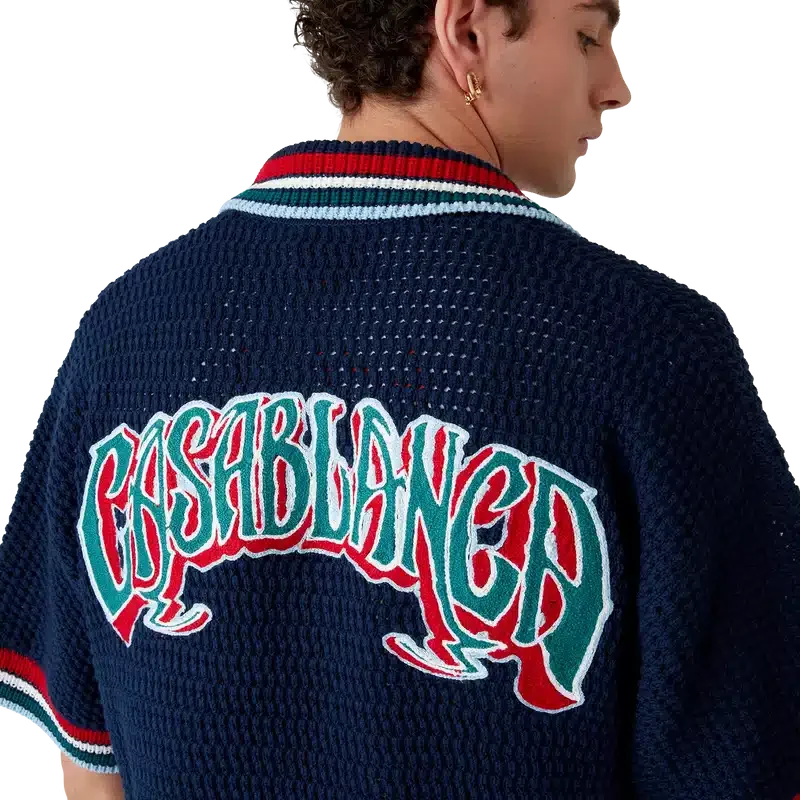 Den gotiska virkade skjortan är en kortärmad stickad modell tillverkad av virkat bomullstyg och prydd med husets signaturdiamantlogo. Kompletterad med signaturknappar med guldkant och pärlor, påsydda fickor fram och randiga detaljer på krage, ärmslut och nederkant.