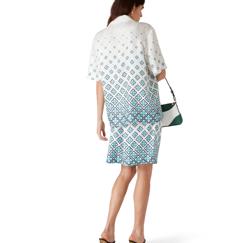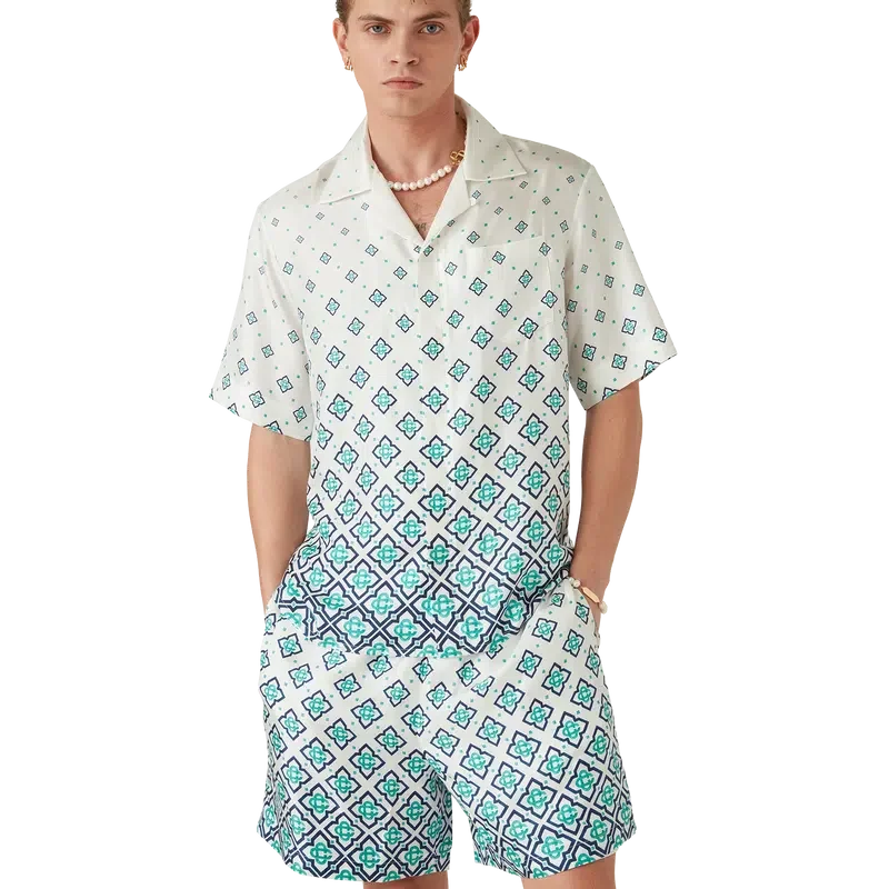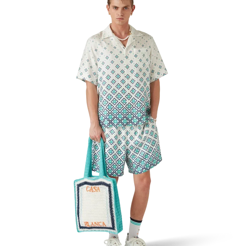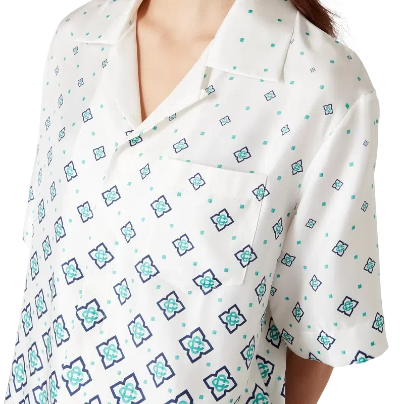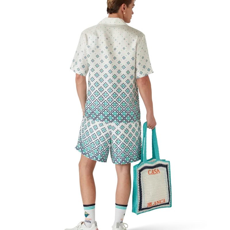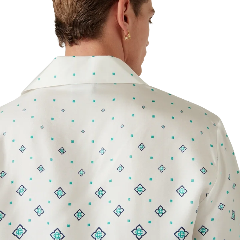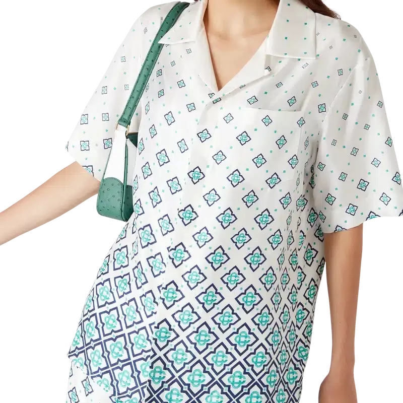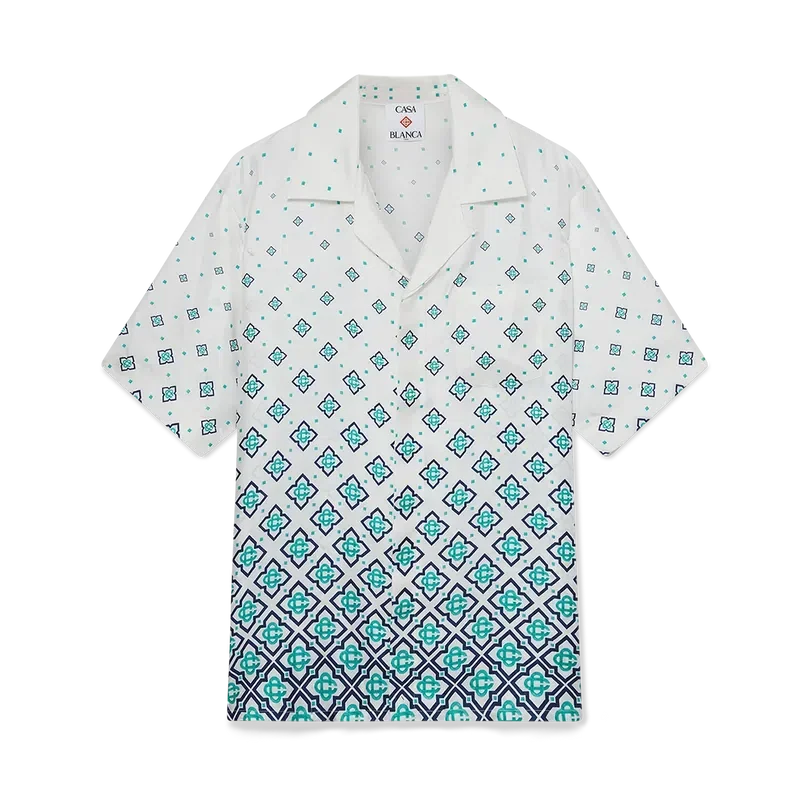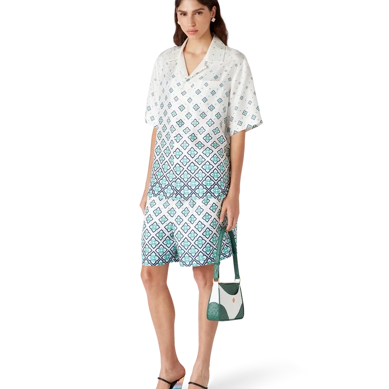 Gradient Monogram-silkeskjortan är en kortärmad skjorta med tryckt mönster, tillverkad av silkestwill. Den har kubansk krage, dold knäppning med sammankopplade Cc-logotypknappar i corozo och en bröstficka.