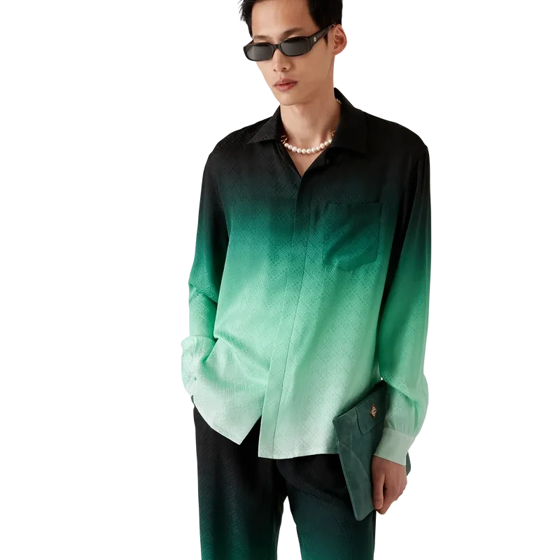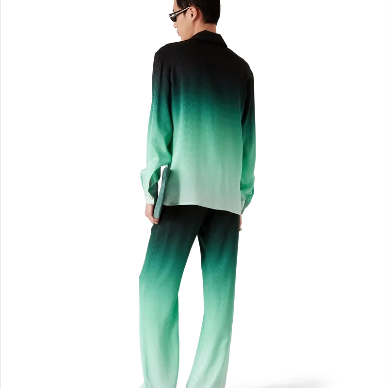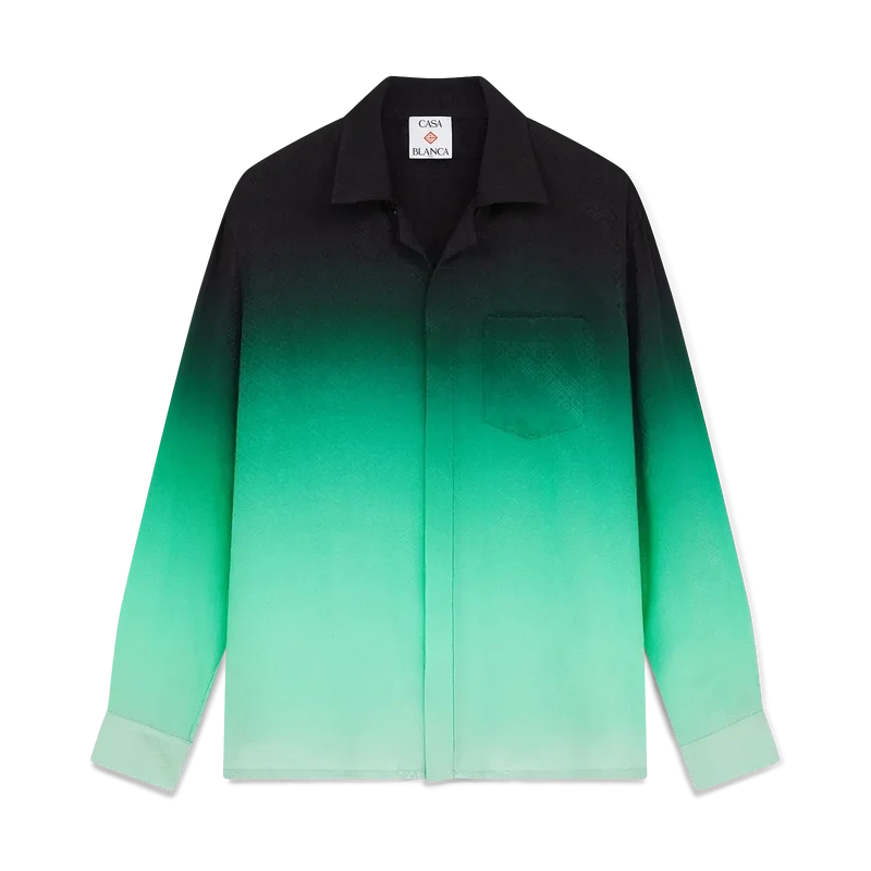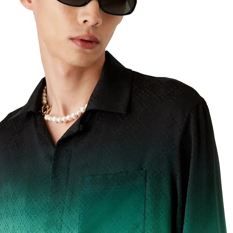 Den långärmade silkeskjortan Gradient Ping Pong har ett heltäckande tryck – ett klassiskt monogram som utvecklades för vår första japanska kollektion med pingisbollar i rörelse som rör sig diagonalt i ett mönster – tillverkad av ett monogramtryckt silketwilltyg. Kompletterad med kubansk krage, knäppning, Corozo-knappar med sammanflätade CC-logotyper och signaturknappar med guldfärgad kant på manschetterna.