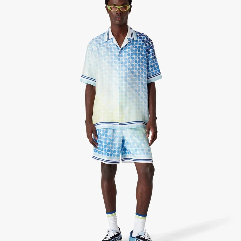 Den kortärmade silkeskjortan med tennis-mönster har ett heltäckande tryck med säsongens motiv, där korsande logotyper och tennisbollar smidigt stiger och faller i ett mönster som smälter samman med säsongens gradient. Kompletterad med kubansk krage, knäppning, sammankopplade Cc-logotypknappar i corozo, bröstficka och randiga kanter på krage, manschetter och nederkant.