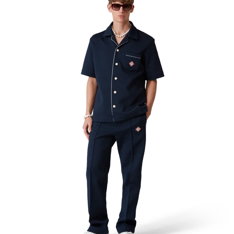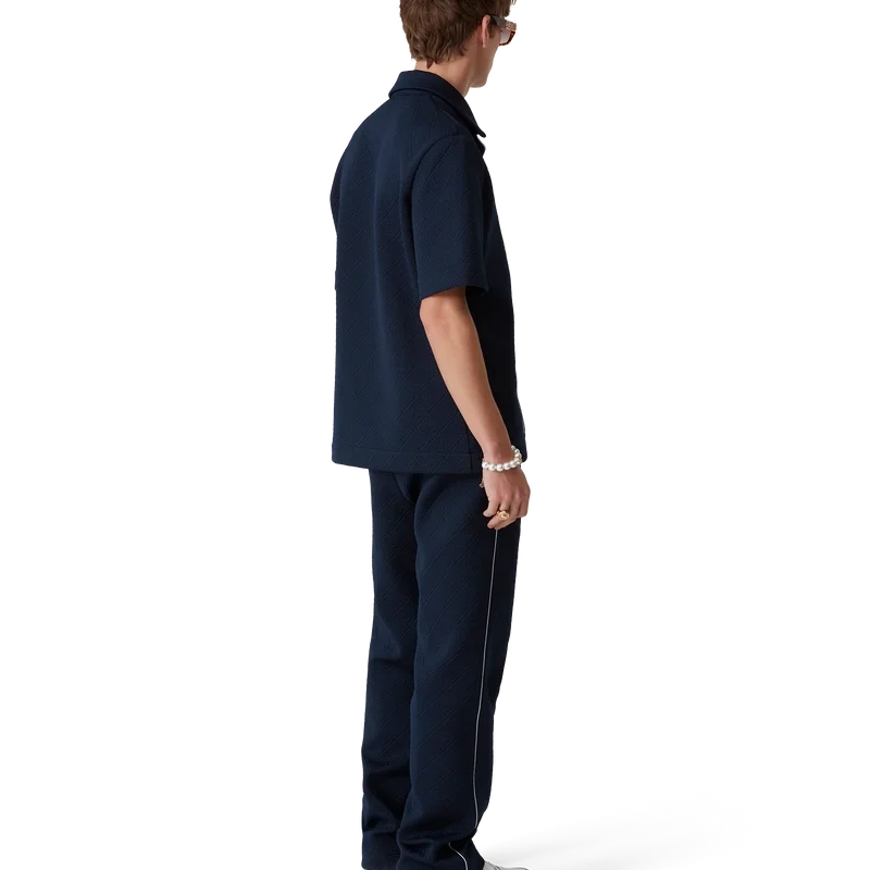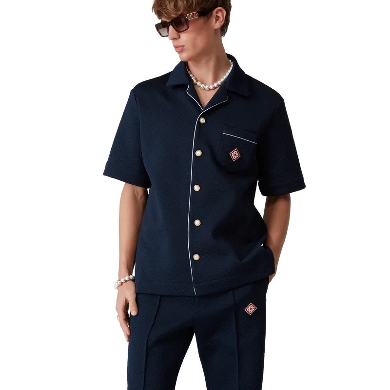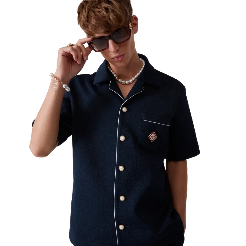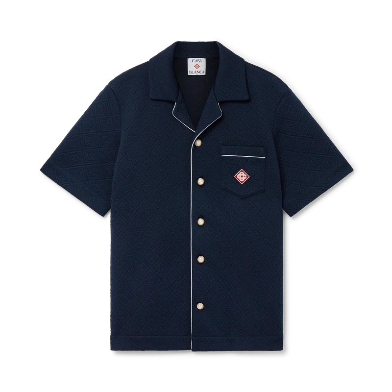 Jacquard-monogramskjortan är en kortärmad modell tillverkad av ett monogramtyg i polyesterblandning. Den har öppen krage, knäppning fram, signaturknappar med guldkant och pärlor, bröstficka, kontrasterande pipingdetaljer på knäppningen och fickan samt ett signaturdiamantlogo.