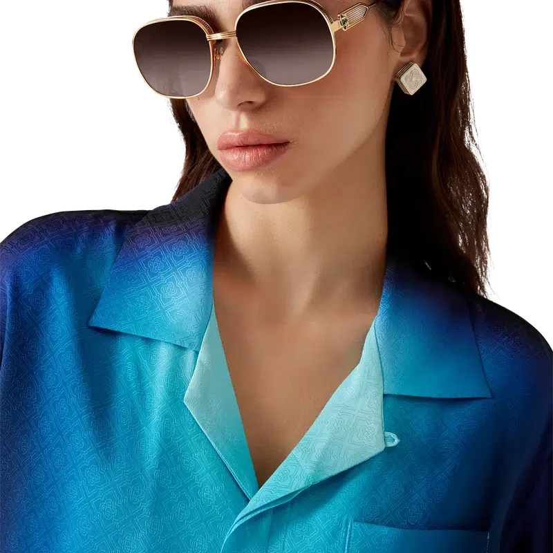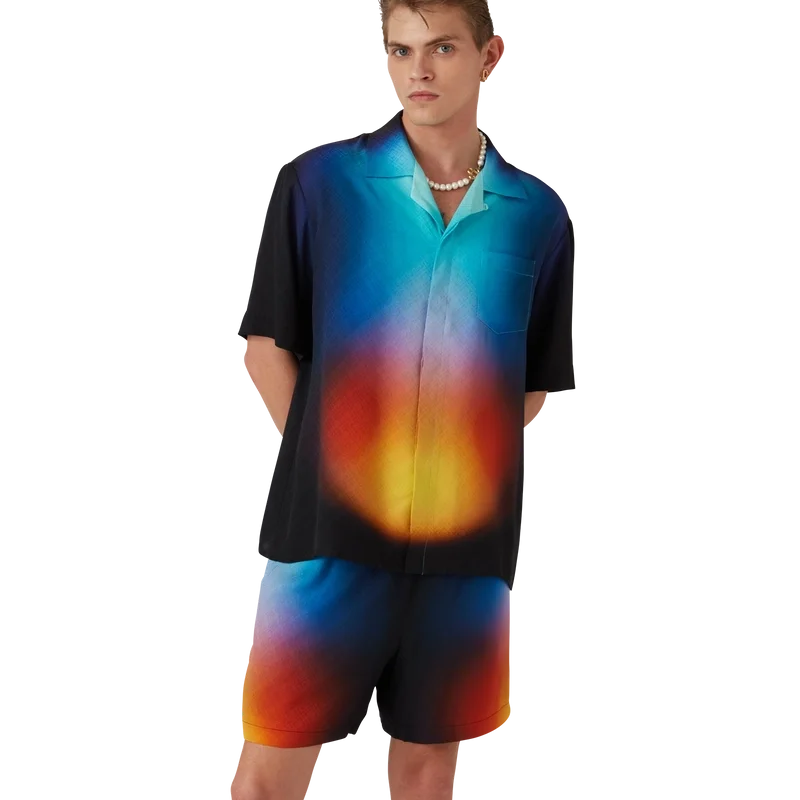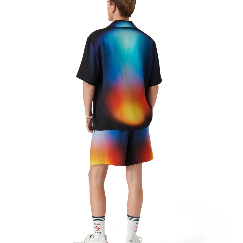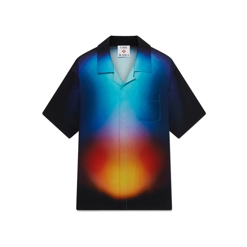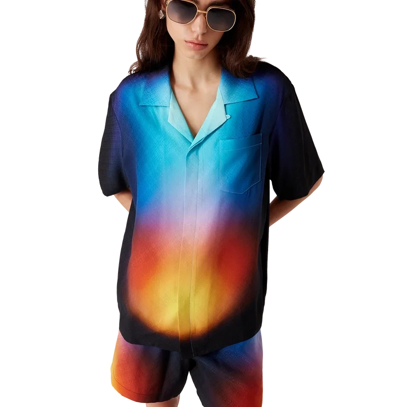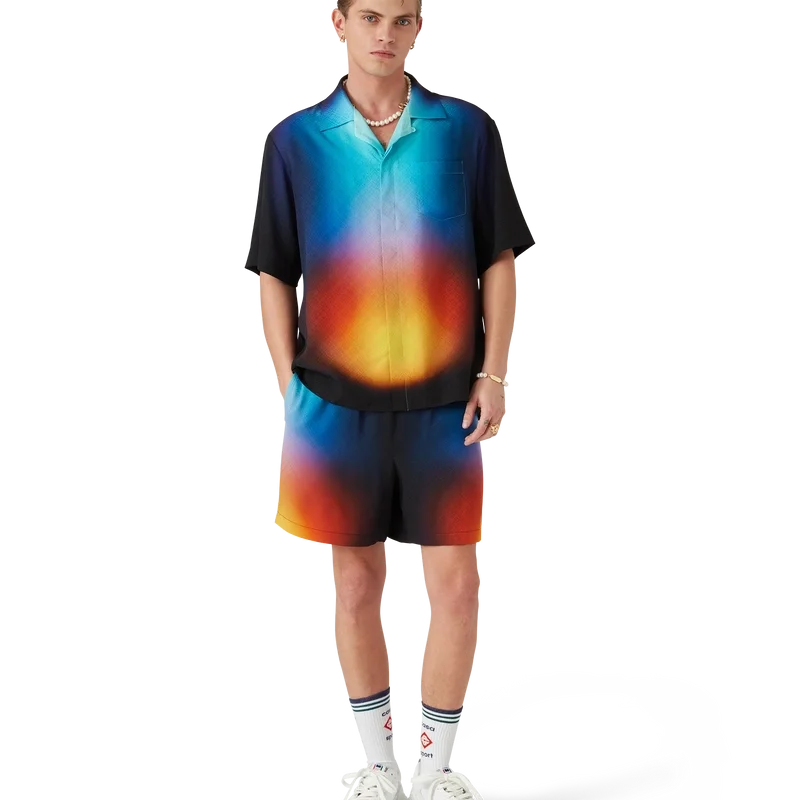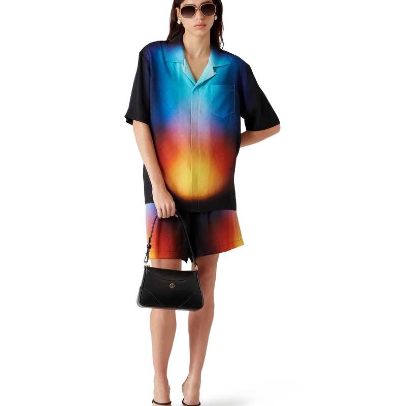 Den gradientmönstrade silkeskjortan har ett tryckt mönster med säsongens gradientfärger och är tillverkad av silke. Den har kubansk krage, bröstficka, dold knäppning och knappar med sammanflätat CC-logo i corozo. Designad för att bäras med matchande gradientmönstrade silkeshorts.