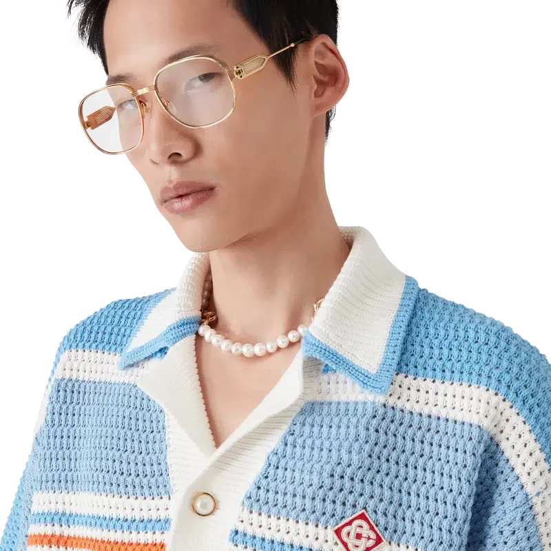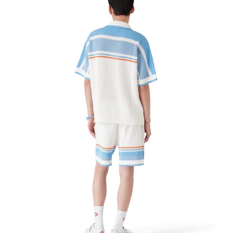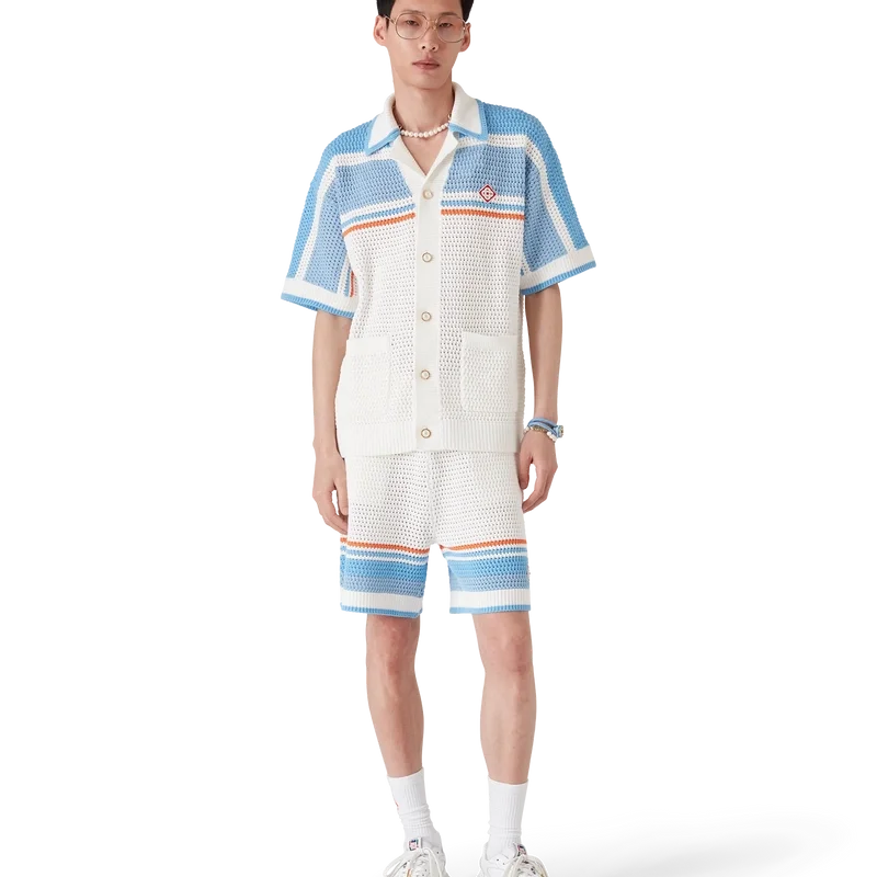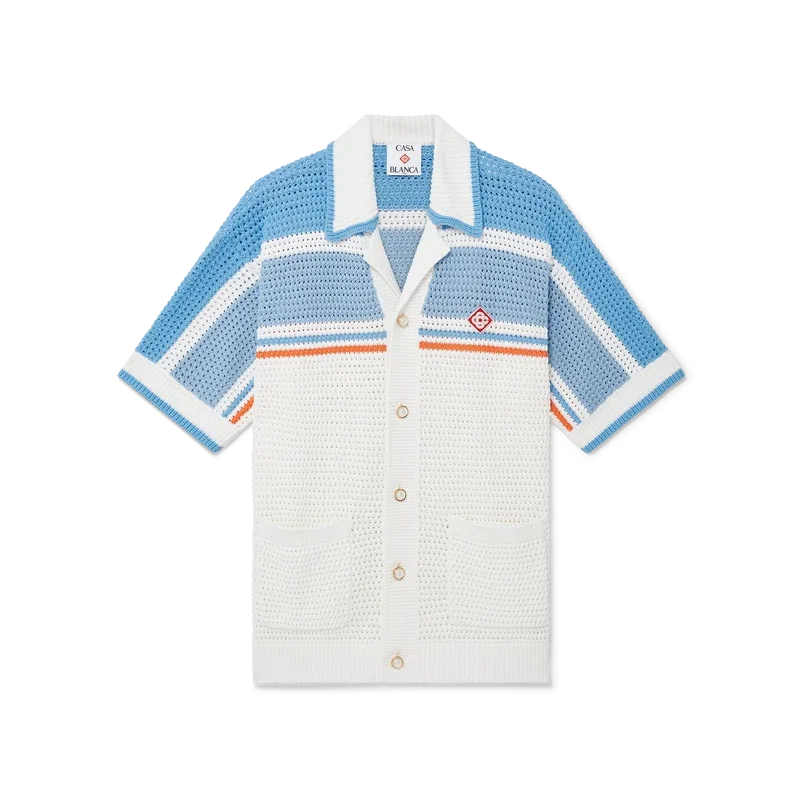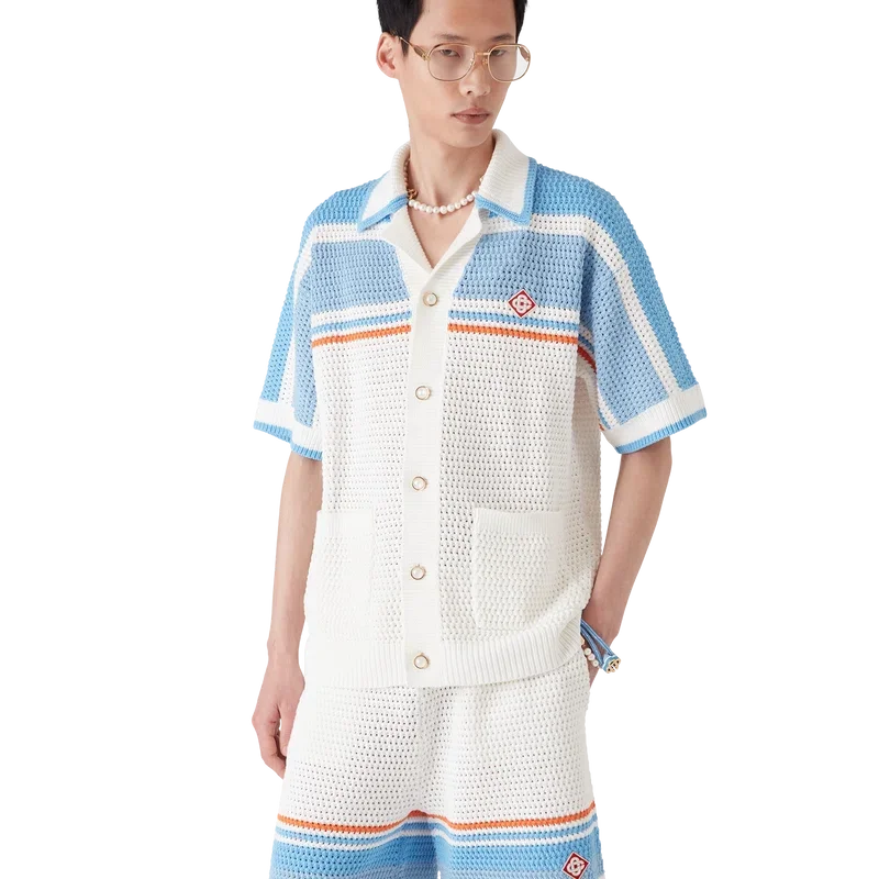 Den virkade tennisskjortan är en kortärmad stickad modell tillverkad av virkat bomullstyg i mjuka naturliga färger och prydd med husets signaturdiamantlogo. Kompletterad med signaturknappar med guldkant och pärlor, randiga detaljer på axlarna och längs ärmarna, påsfickor fram samt randiga kanter på kragen och manschetterna.