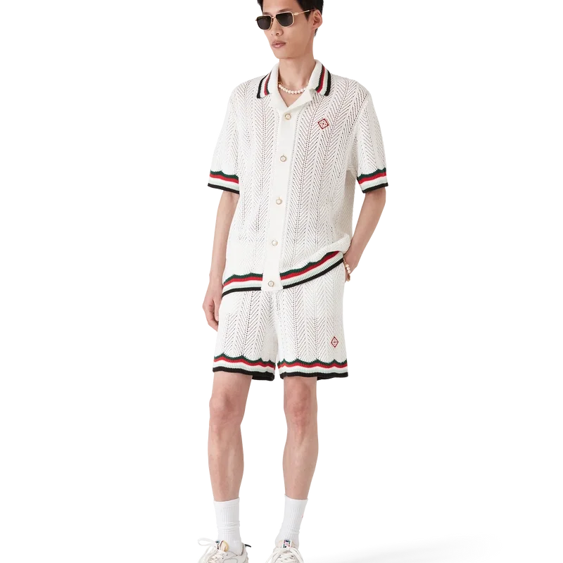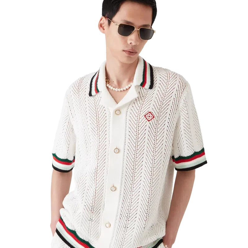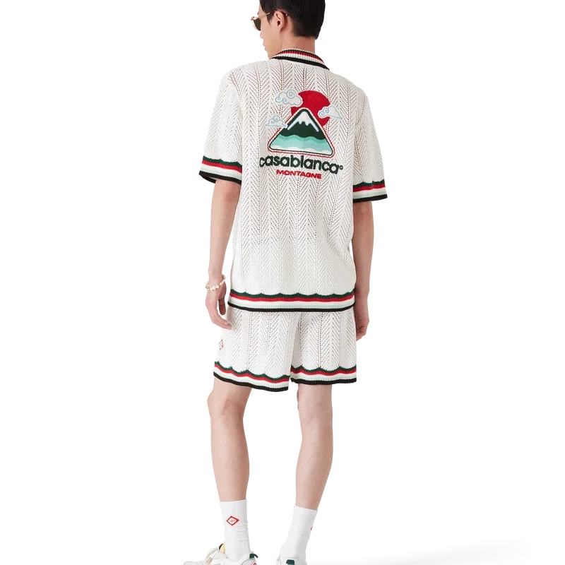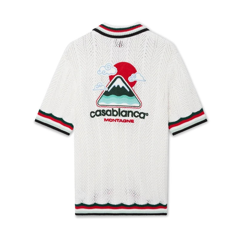 Montagne Ondulee-skjortan i virkat bomullstyg är en kortärmad stickad skjorta med husets signaturdiamantlogo och säsongens konstverk. Kollektionen är inspirerad av Japans rika ikonografi och har en enkel layout och konstverk som förmedlar ett starkt visuellt budskap med bara några få linjer och färger, vilket gör den till ett av kollektionens symboler.