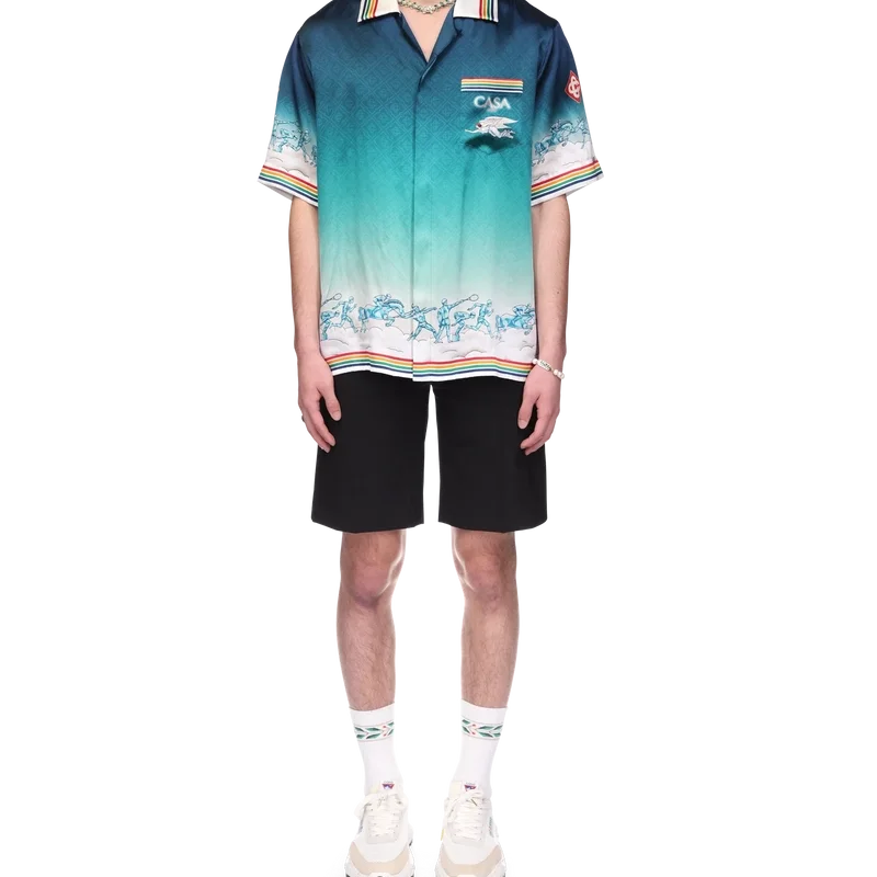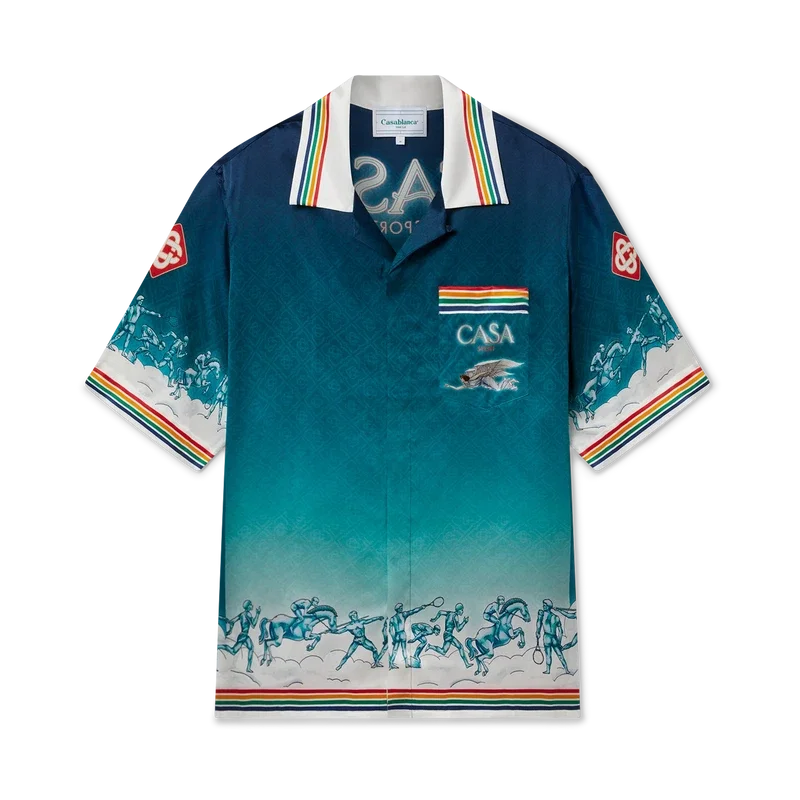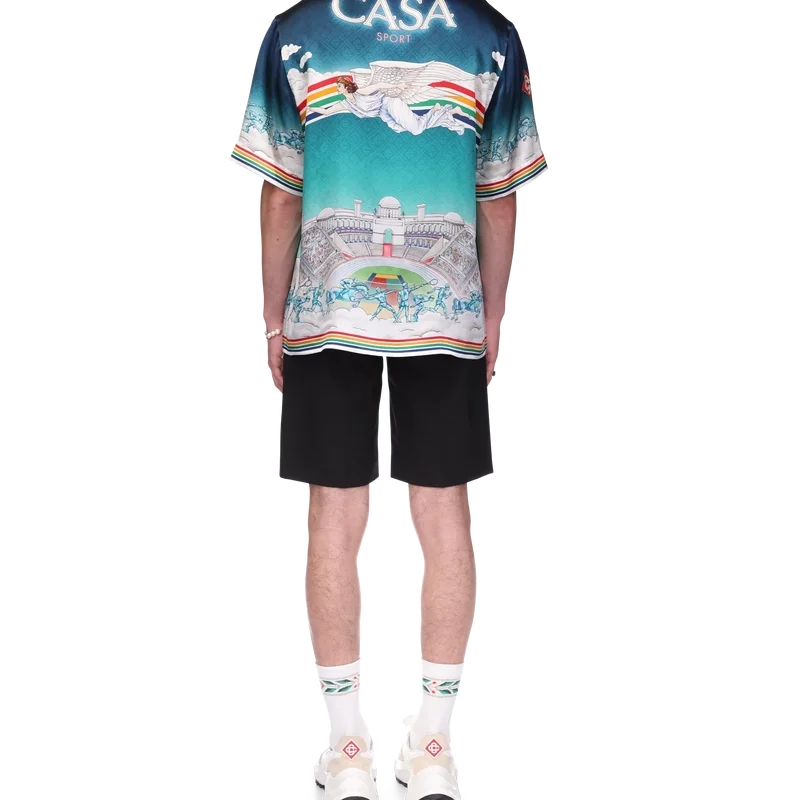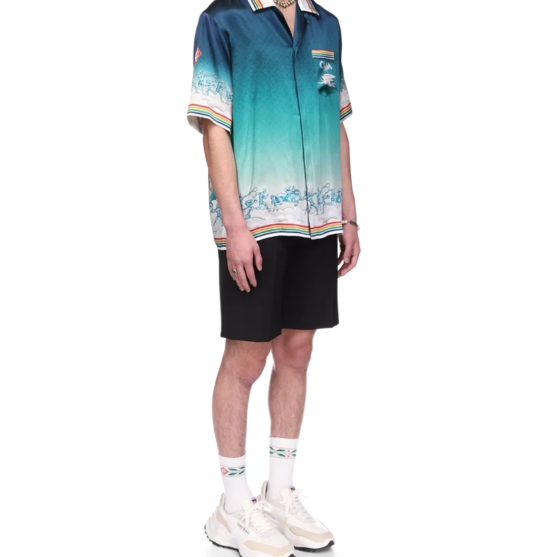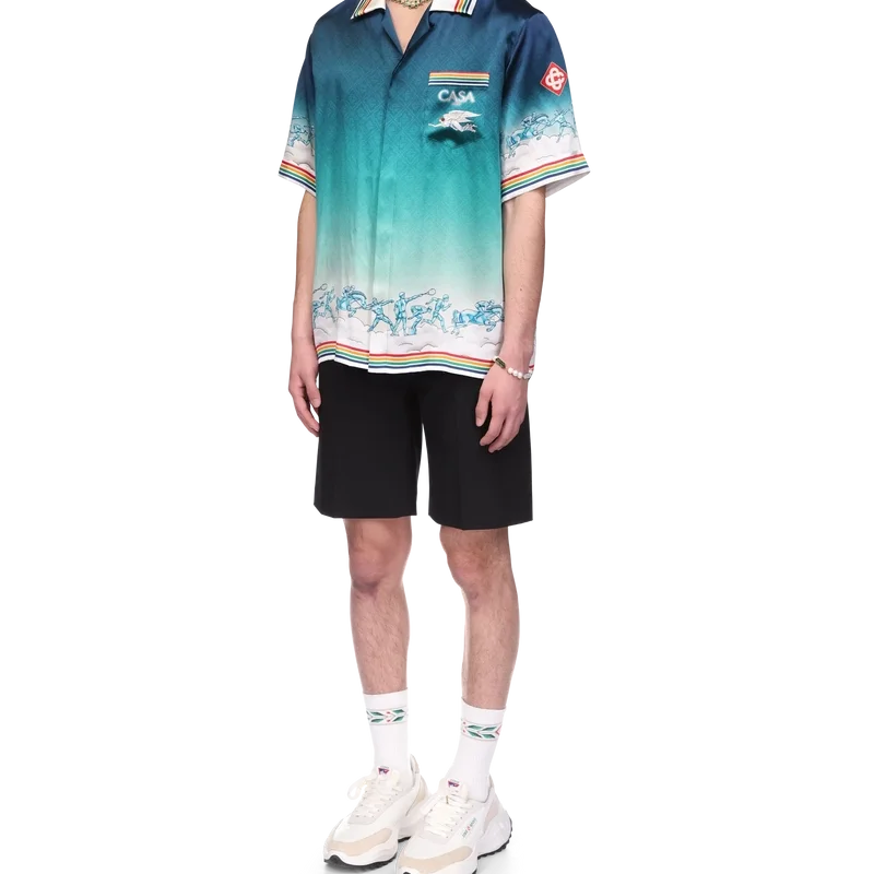 La Deesse Du Stade silkeskjorta är en kortärmad skjorta med tryckt mönster, tillverkad av ett monogram-gradientmönstrat silkesatintyg med husets säsongsbetonade konstverk. Kompletterad med kubansk krage, bröstficka, knäppning, sammanlänkade Cc-knappar i corozo och flerfärgade randdetaljer på krage, manschetter, nederkant och bröstficka.