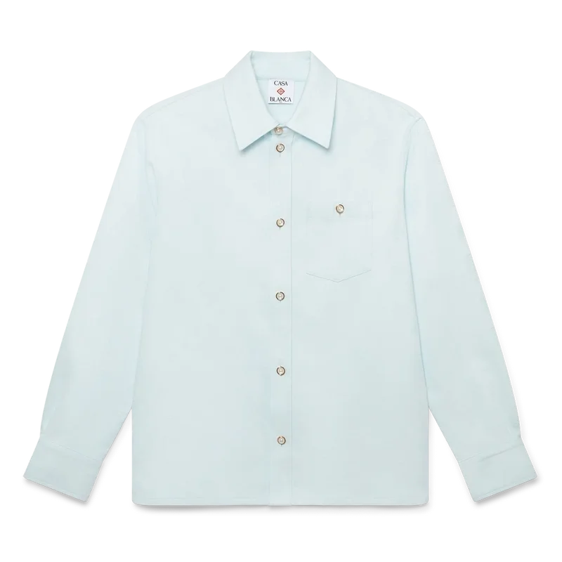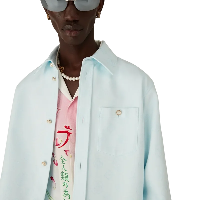 Den långärmade bomullsskjortan med monogram har en klassisk design med husets Honeydew-logotyp i ett upprepat mönster. Detta mönster skiljer sig från våra andra monogram, eftersom det kombinerar unika former för att bilda ett sammanhängande mönster. Kompletterad med spetskrage, knäppning, bröstficka och signaturknappar med guldkant och pärlor.