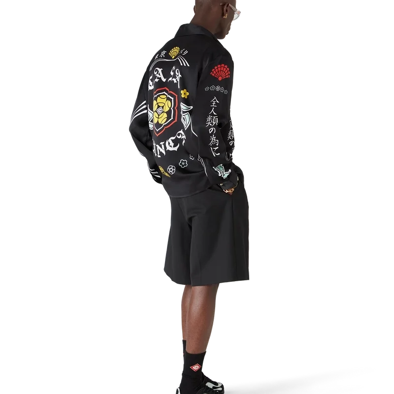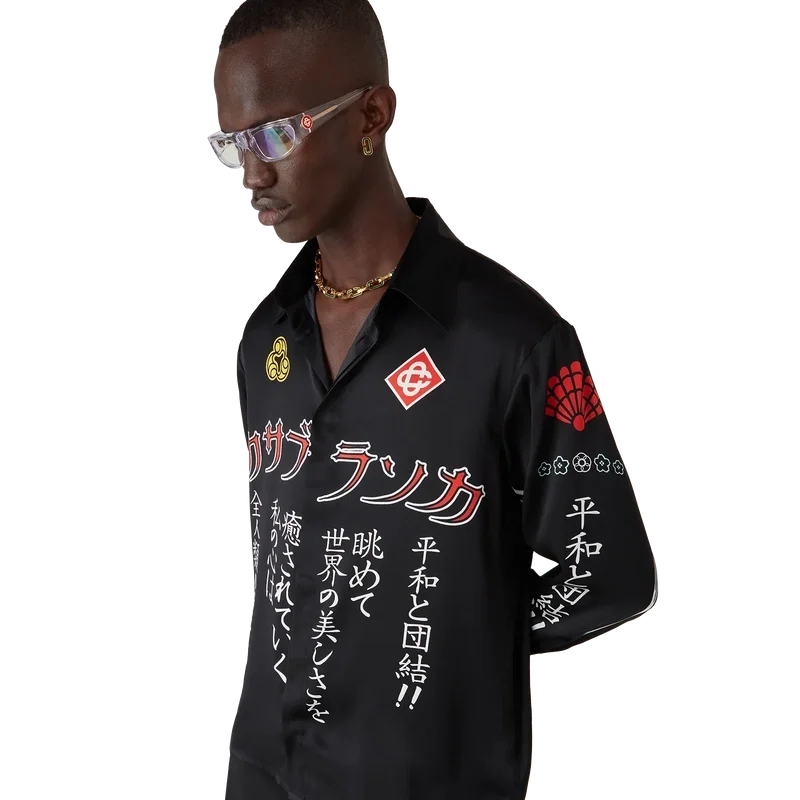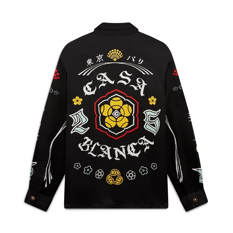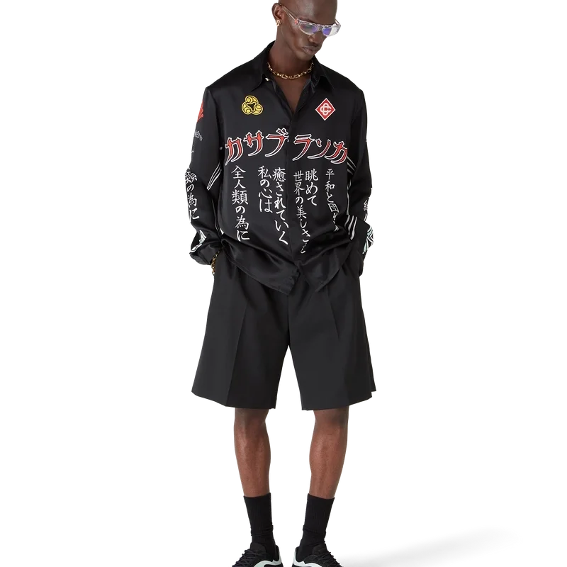 Den långärmade silkesskjortan Emblem har ett tryckt mönster med säsongens konstverk – vi hämtade inspiration från den japanska subkulturen BōSōZoku till ett av våra huvudteman. Kontrasten mellan grafiska element och text kändes väldigt ”Casablanca” för oss. Vi skapade vår egen tolkning genom att införliva fraser som beskriver varumärket, som ”Att betrakta världens skönhet”. Layouten är okonventionell, men kompositionen är noggrant balanserad, vilket ger den en unik men harmonisk känsla. Kompletterad med spetskrage, knäppning, Cc-logotypknappar i corozo, guldfärgade emaljknappar vid manschetterna och vid kragen.