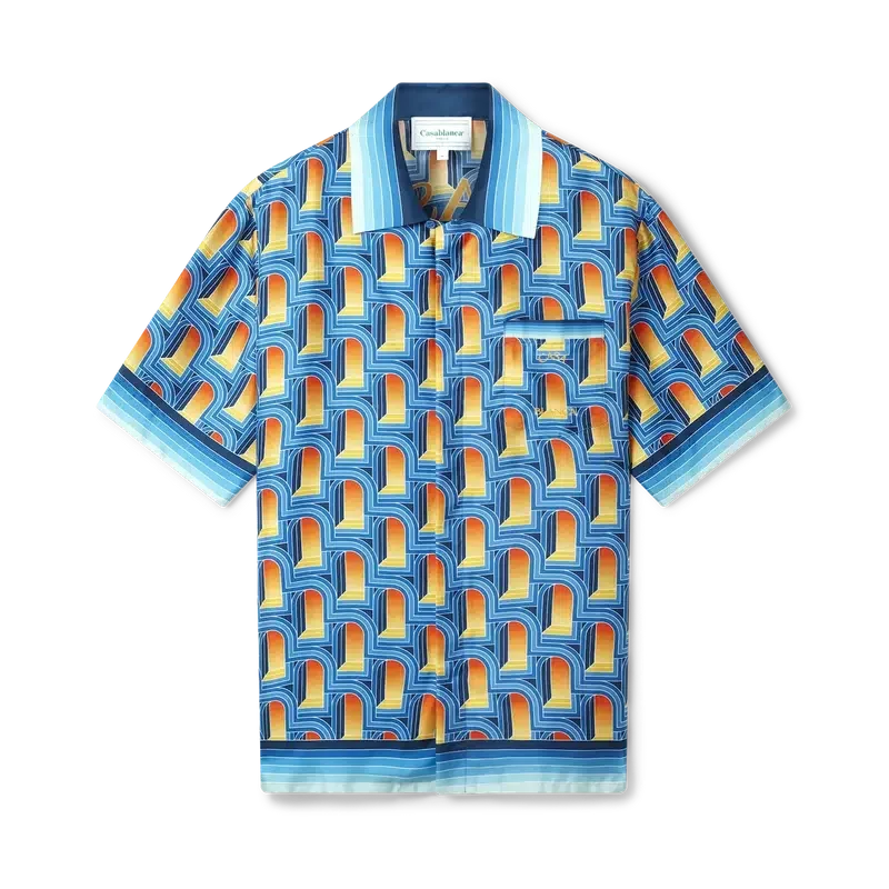 L’arche De Nuit kortärmad silkesskjorta för herr med säsongens återkommande bågtryck i en nattlig färgskala av djupa blå nyanser. Avslutad med en ton-i-ton blå randig öppen krage och knäppning vid kragen.