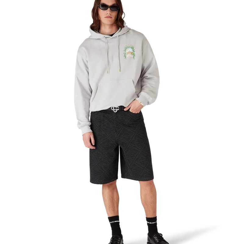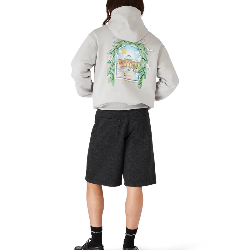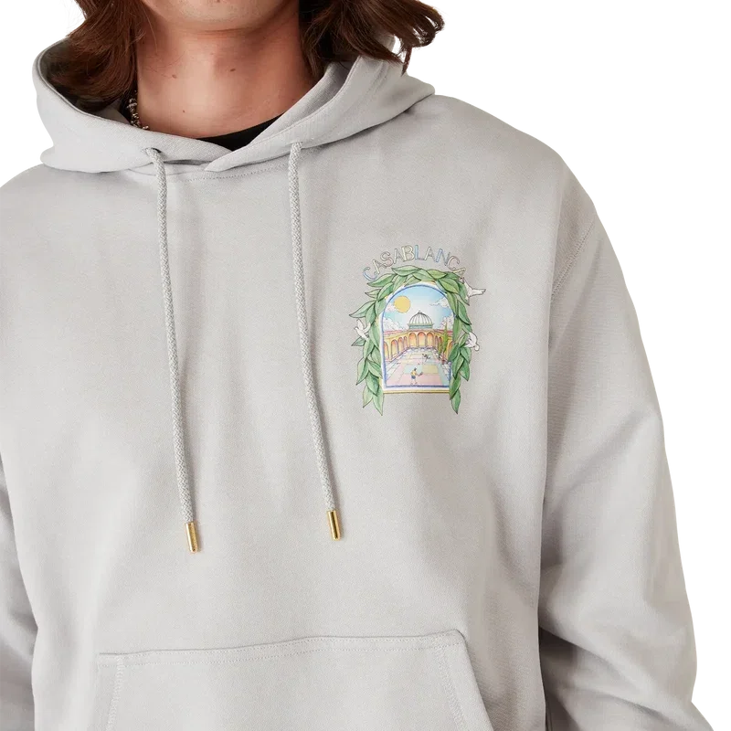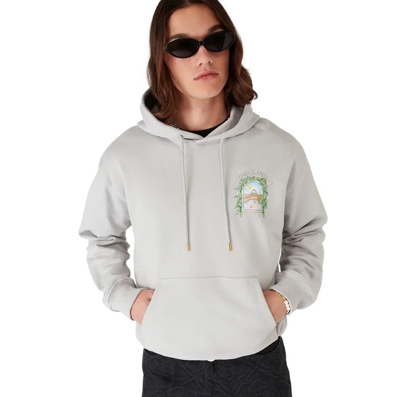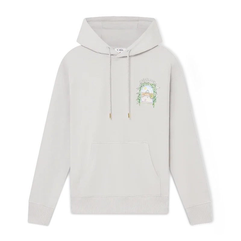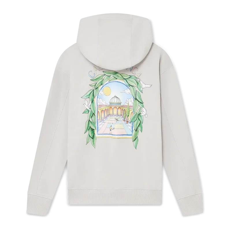 Casa L’arche-tröjan med huva är en elegant långärmad tröja med tryck som visar husets säsongsbetonade konstverk med designelement som bågen, naturen, arkitekturen och tennis. Komplett med huva, dragsko med gulddetaljer samt ribbade muddar och nederkant.