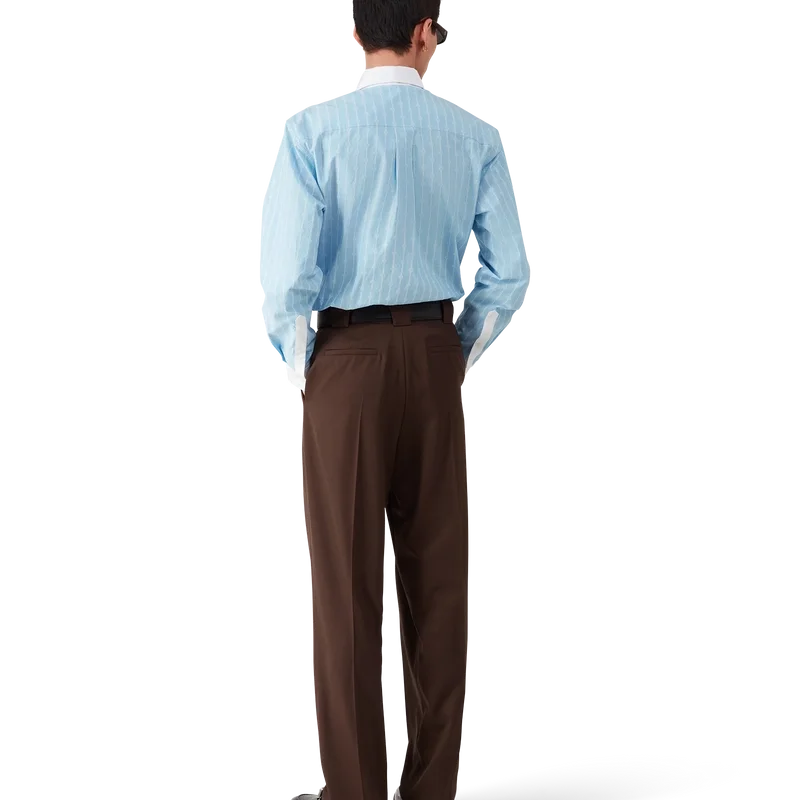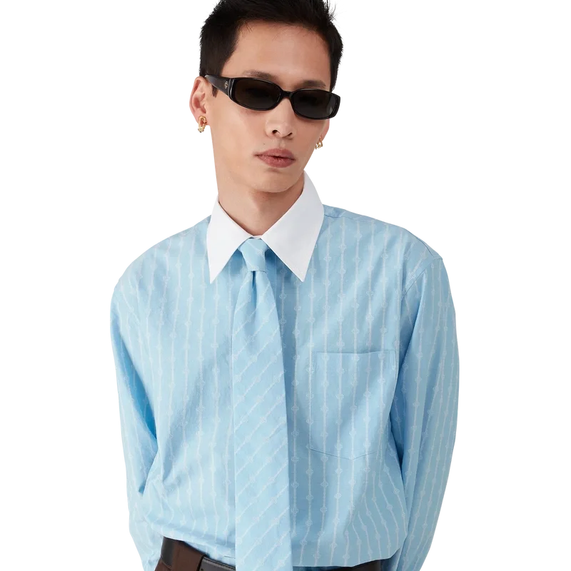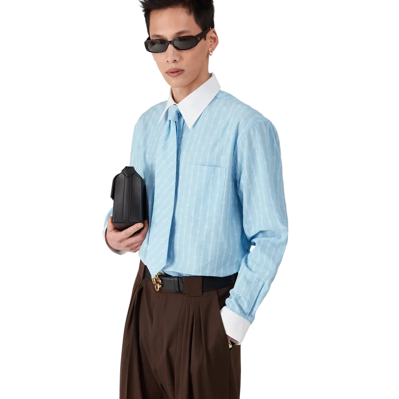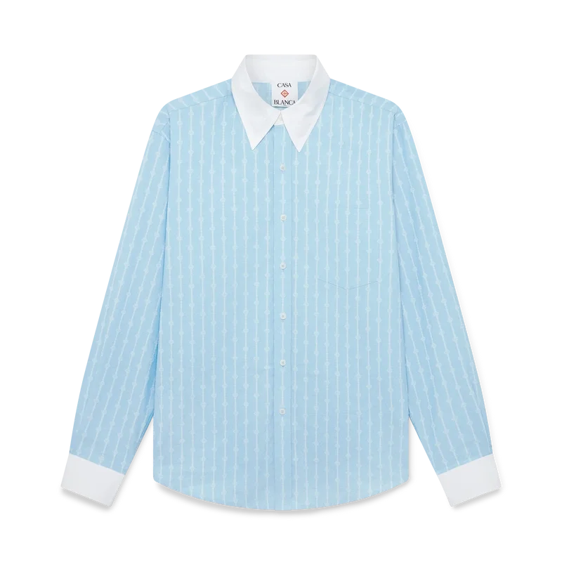 Laurel Stripe Jacquard-skjortan är en långärmad, skräddarsydd modell tillverkad av bomullsjacquardtyg. Den har kontrasterande vita manschetter och spetskrage, knäppning med Cc-logotypknappar i corozo samt en bröstficka.
